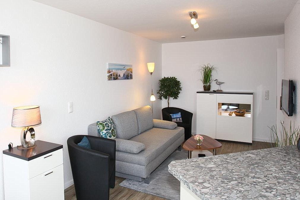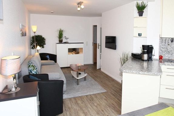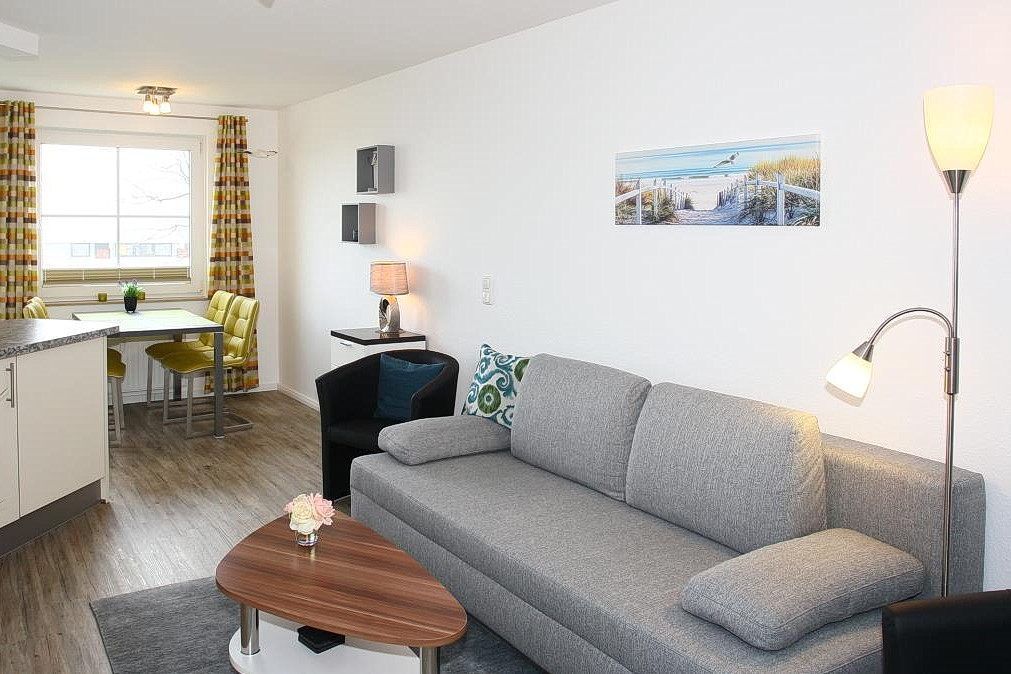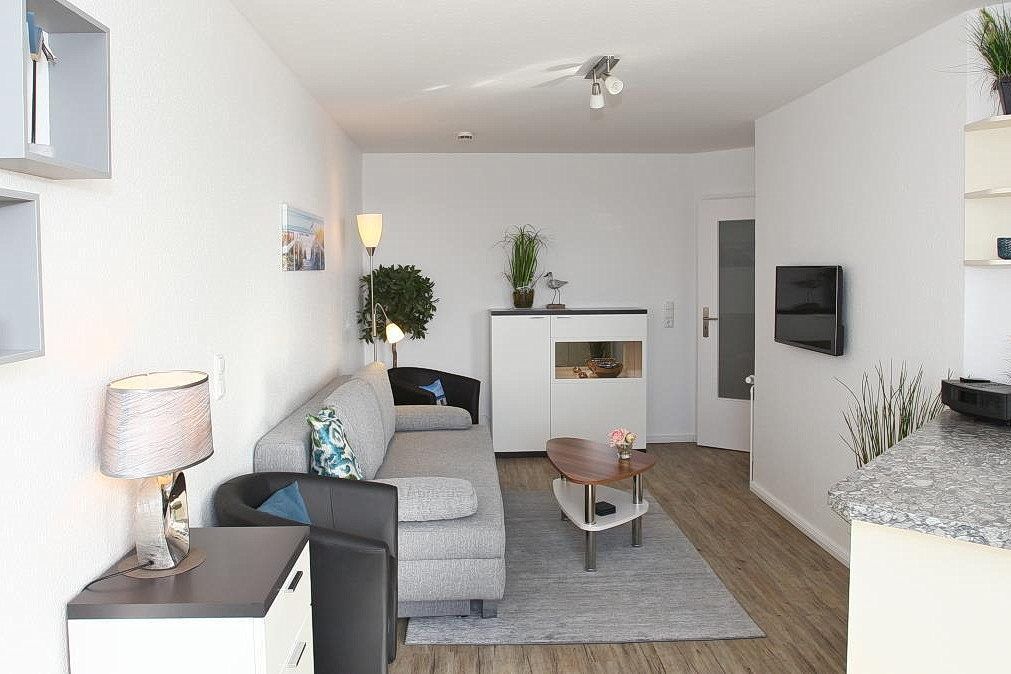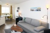 Moderner, heller Wohn- und Essbereich mit direktem Zugang zum schönen Balkon mit Seeblick. Der Raum verfügt über eine Schlafcouch (140x195cm), 2 kleine Clubsessel sowie einen Essbereich mit Platz für 4 Personen. Zur Unterhaltung stehen ein Flachbildfernseher, ein DVD-Player und eine Stereoanlage zur Verfügung. Der Boden ist mit Laminat ausgelegt. Die Fenster lassen sich durch Plissees verdunkeln.