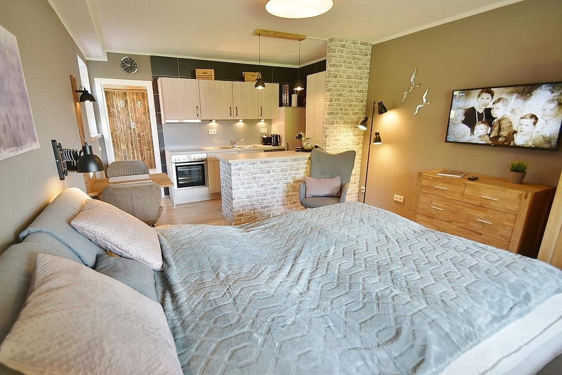 Zum Wohn-Schlafbereich offene moderne Küchenzeile mit 4- Platten-Cerankochfeld, Backofen, Spülmaschine und Kühlschrank mit kleinem 3-Sterne-Gefrierfach. Des Weiteren stehen eine Kaffeemaschine, eine Mikrowelle, ein Wasserkocher, ein Toaster und ein Eierkocher zur Verfügung.