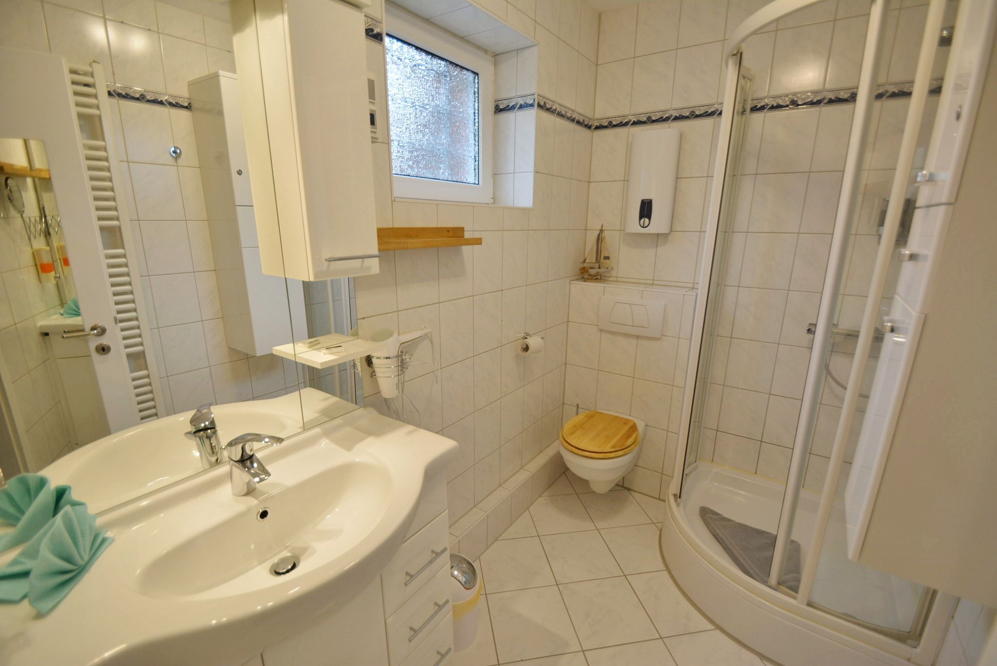 Modernes, hell gefliestes Tageslichtbad mit Dusche, WC und Waschbecken.