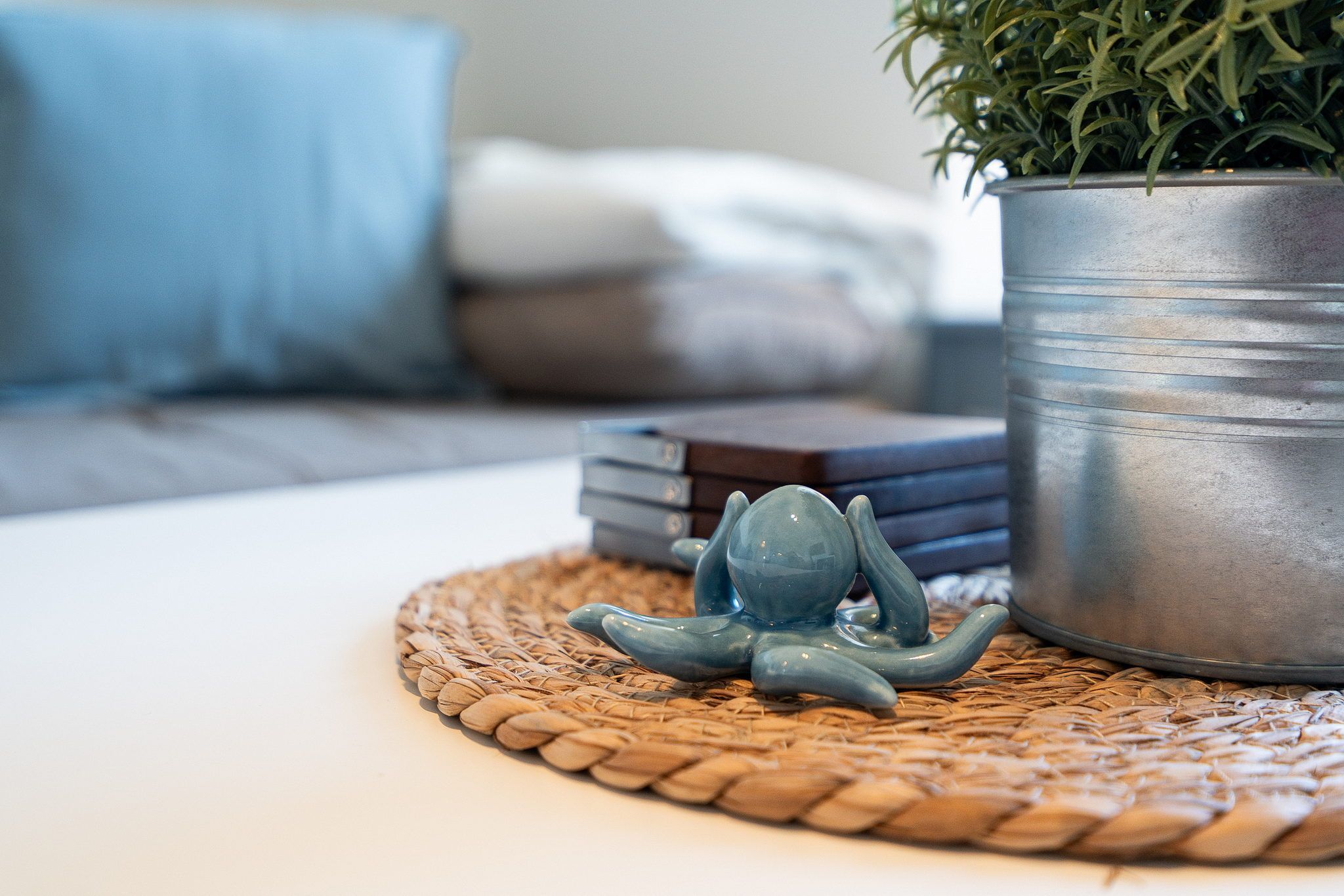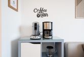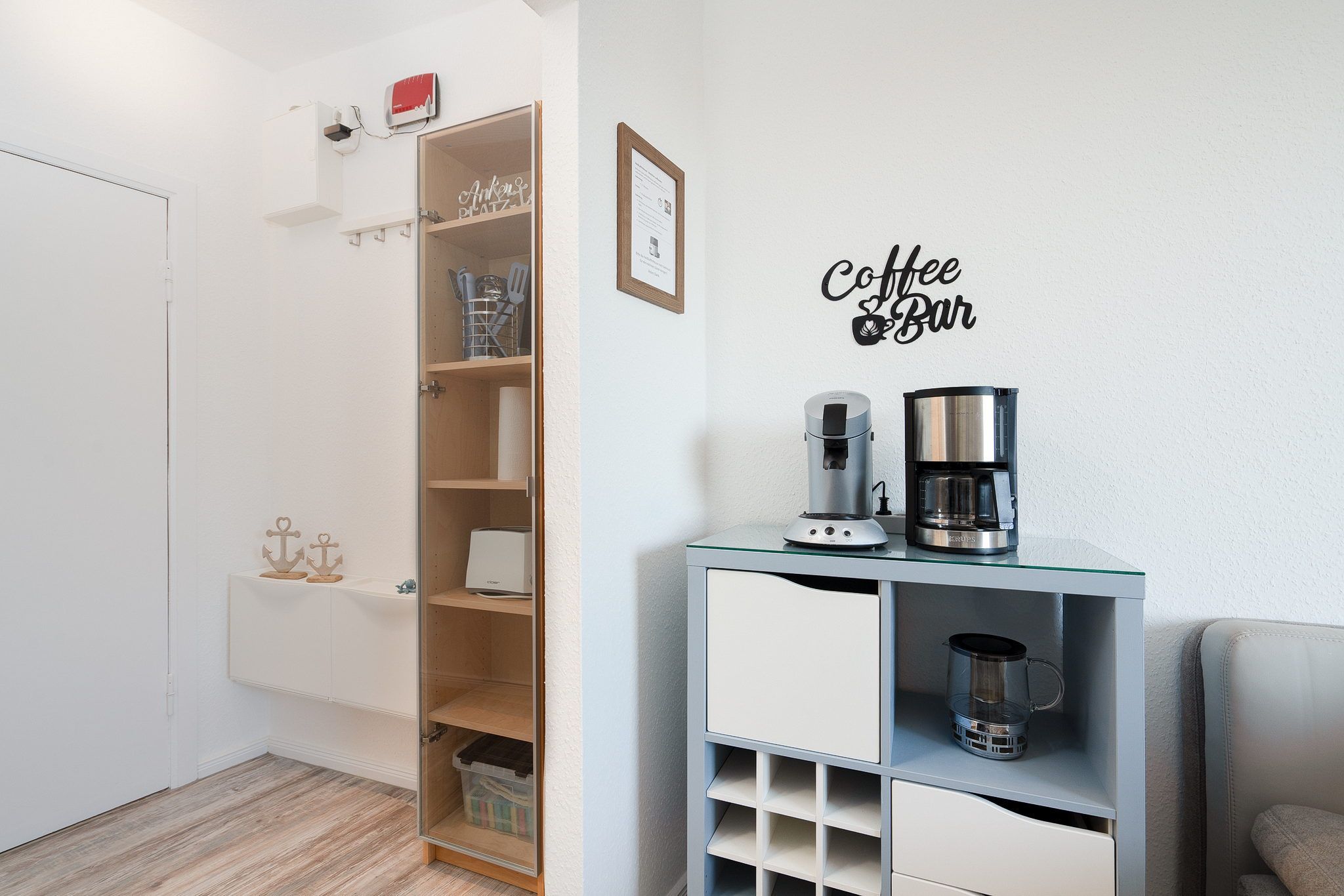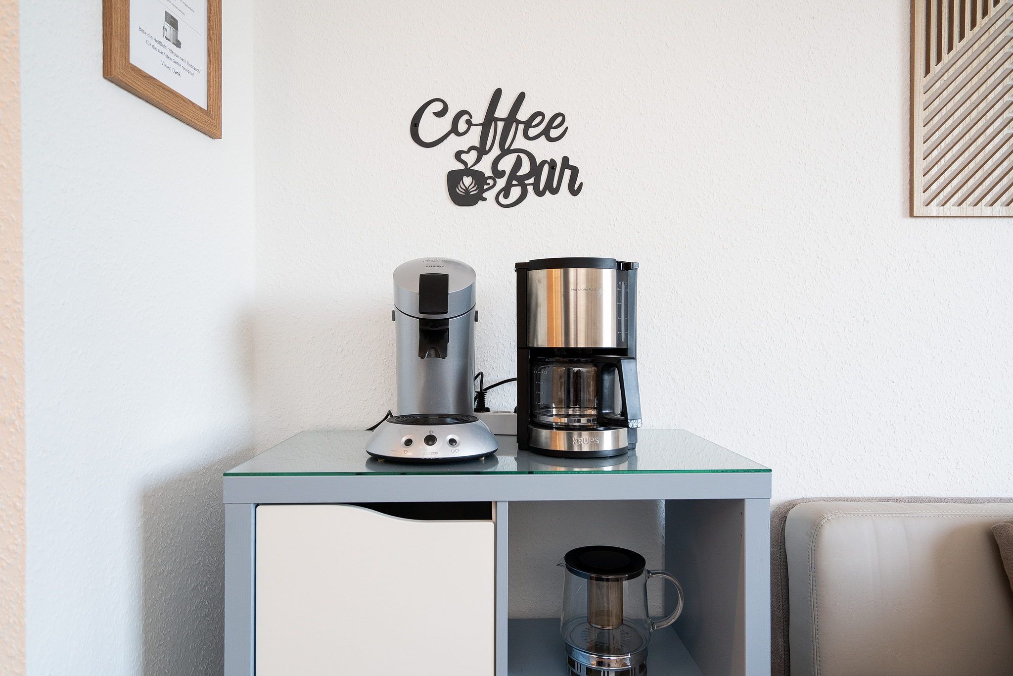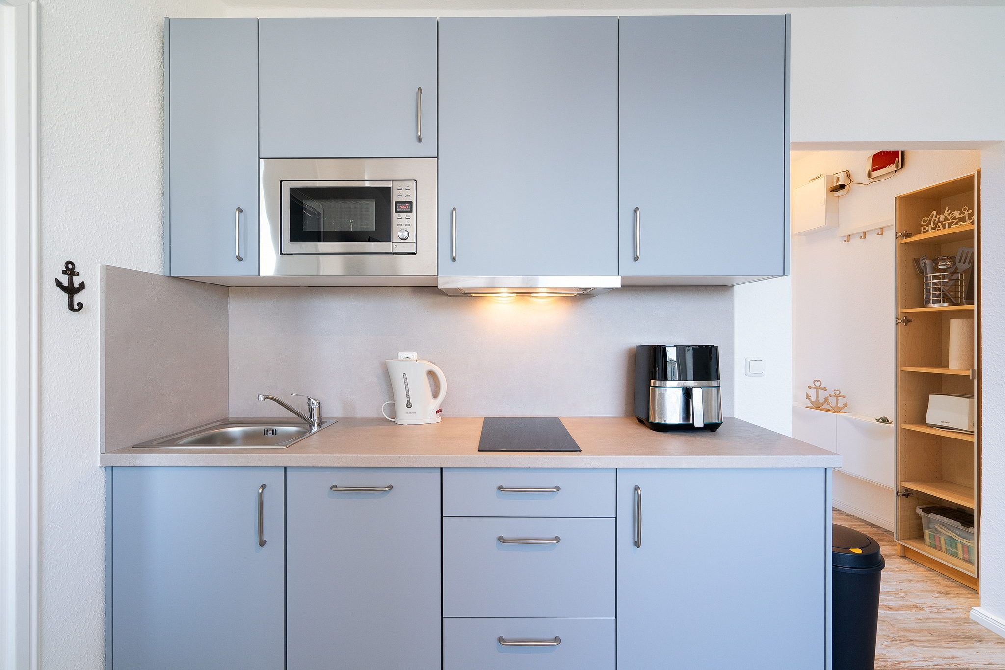 Moderne, komplett ausgestattete, zum Wohnzimmer offene Küchenzeile mit 2 Platten Ceran-Herd, Spülmaschine, Kühlschrank mit 3-Sterne Gefrierfach, Mikrowelle, Filterkaffeemaschine, Heißluftfriteuse, Toaster und Wasserkocher.