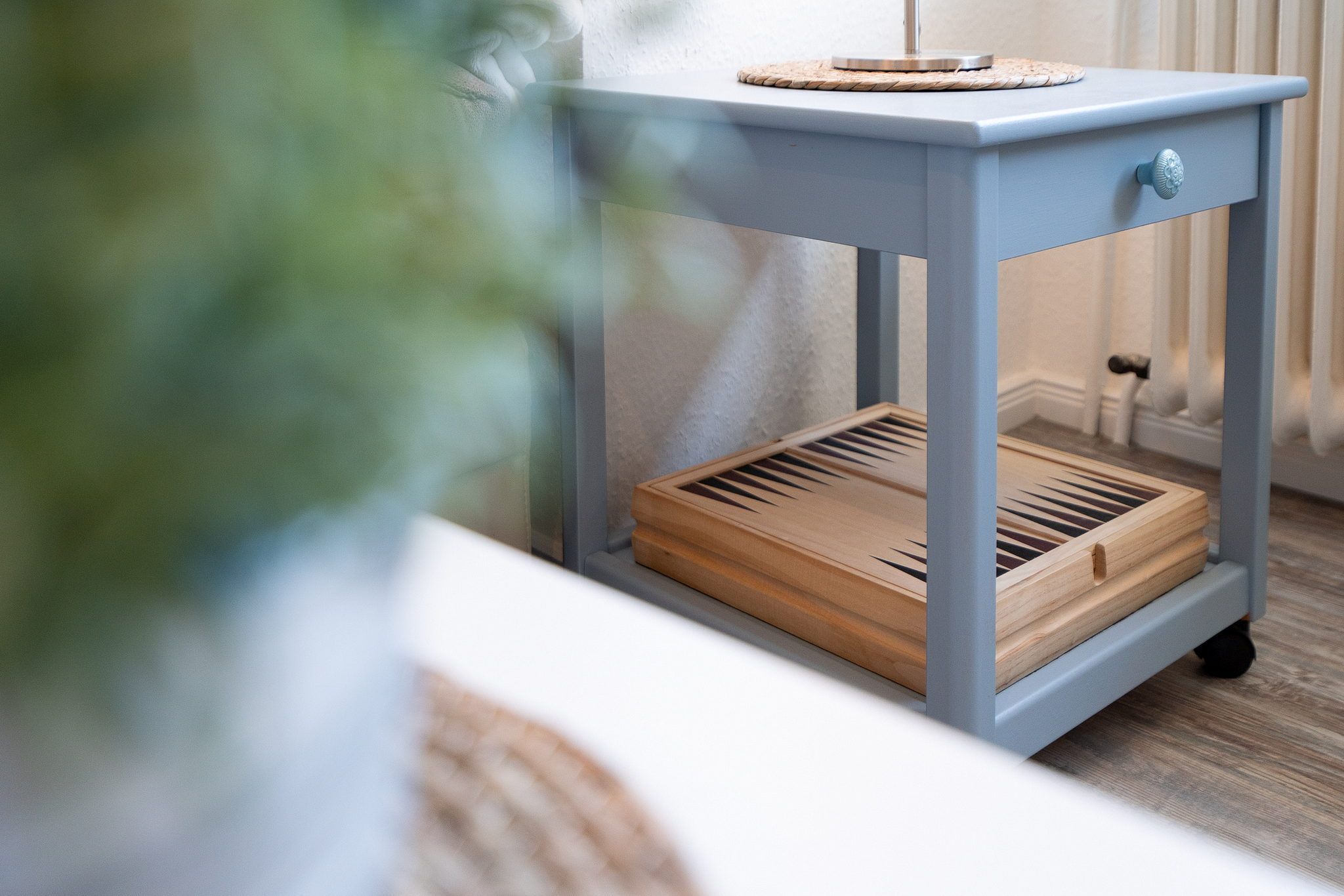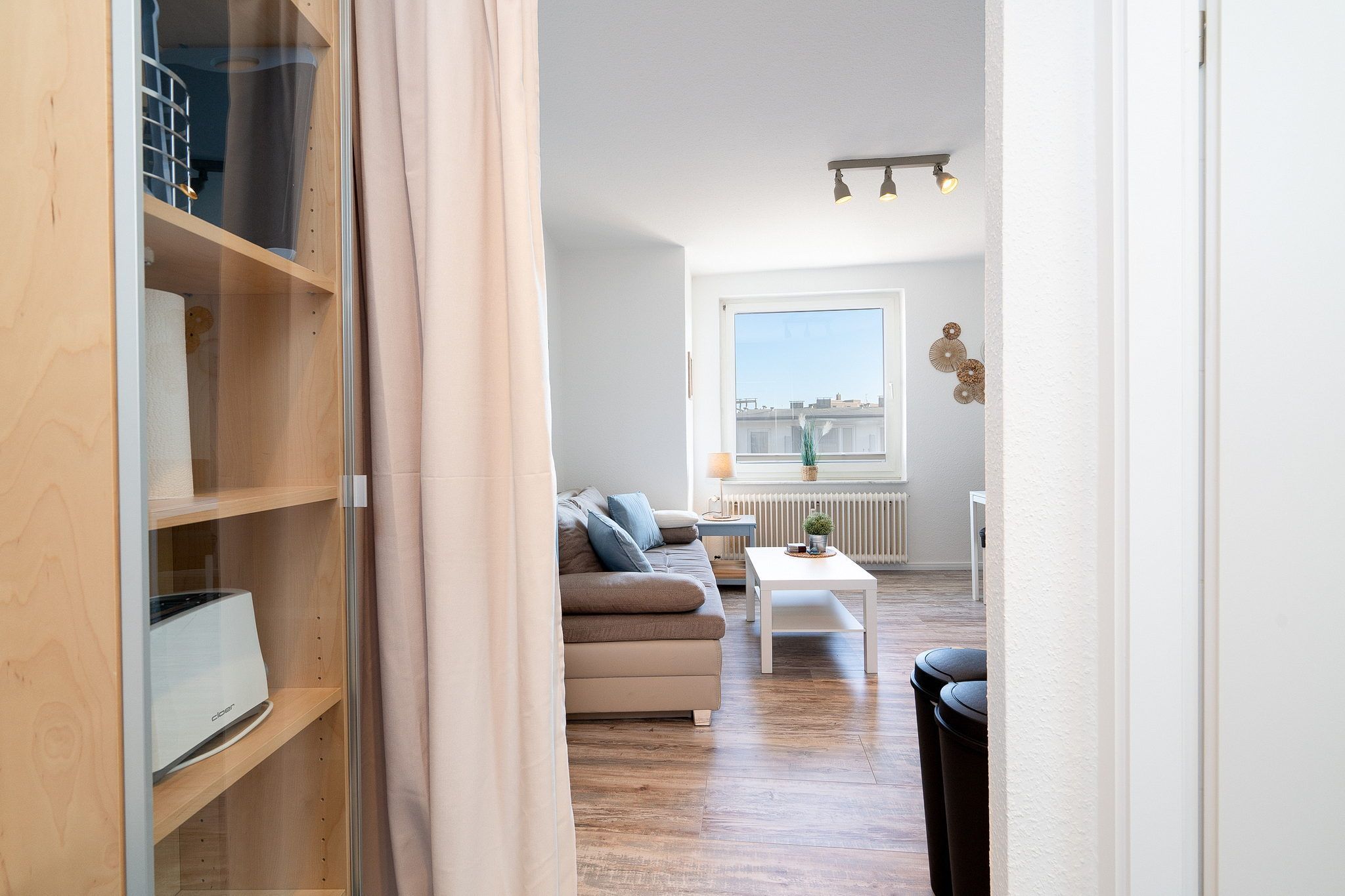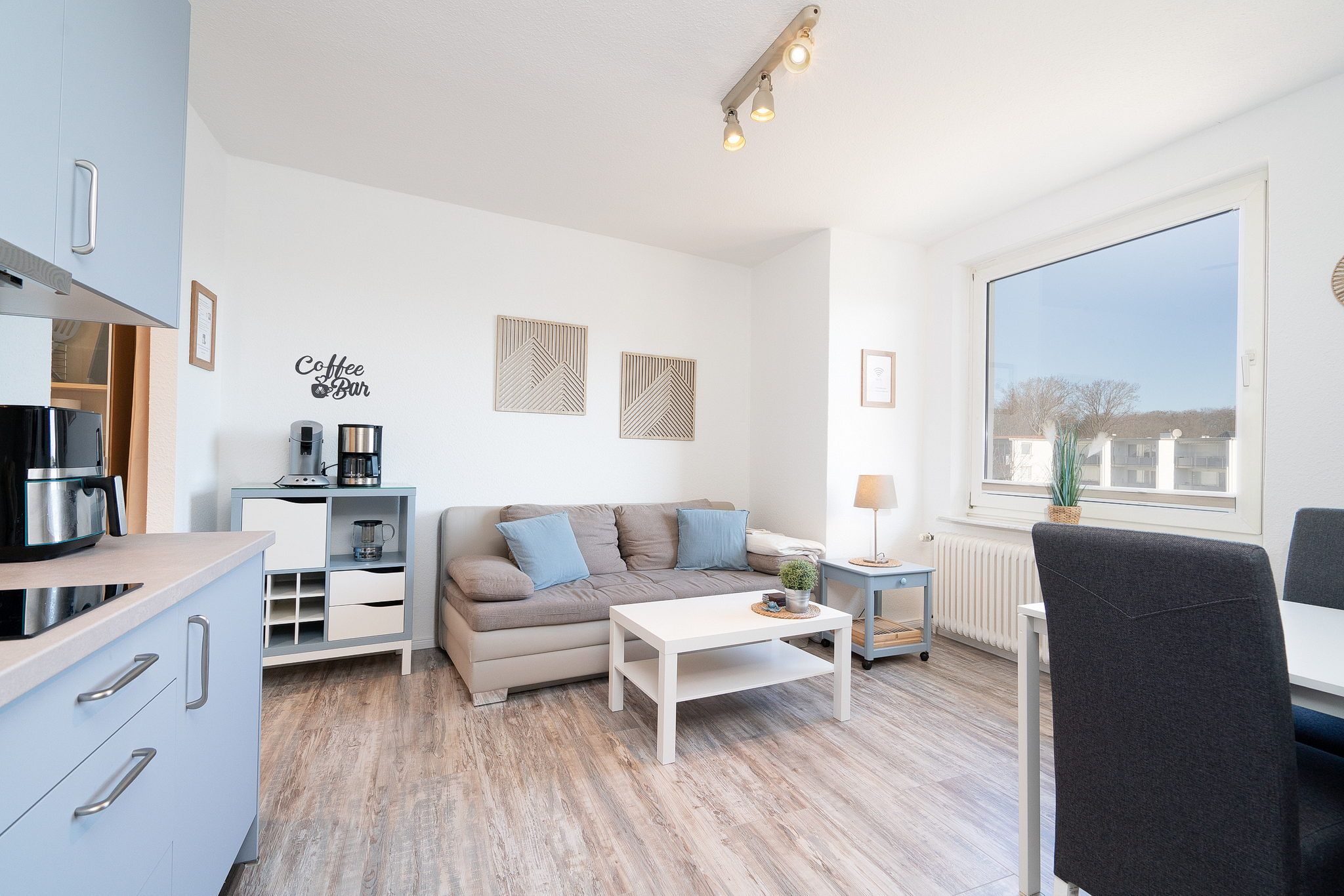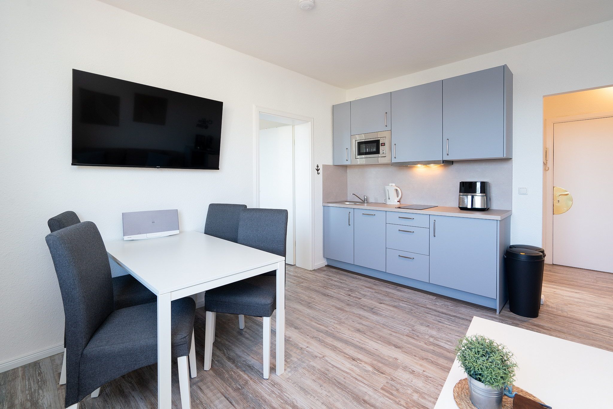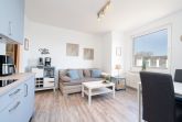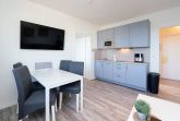 Freundliches, modernes Wohn- und Esszimmer mit offener Küchenzeile. Das Wohn- und Esszimmer ist mit einer Schlafcouch (140x200cm) und einem Essplatz für 4 Personen ausgestattet. Das Wohn- und Esszimmer ist mit Laminat ausgelegt. Das Fenster lässt sich durch ein Plissee verdunkeln. Zur Unterhaltung stehen ein Smart-TV (55 Zoll), ein Radio mit CD und ein Bluetooth Adapter zur Verfügung.