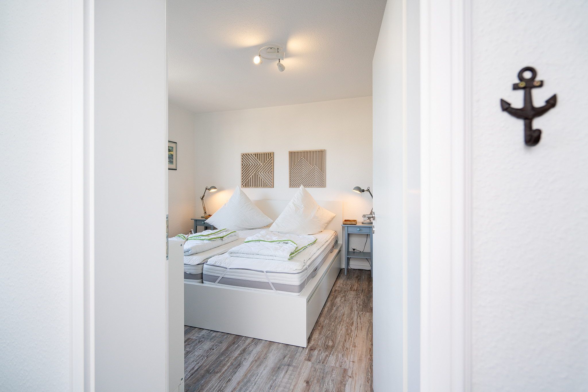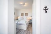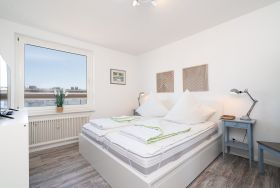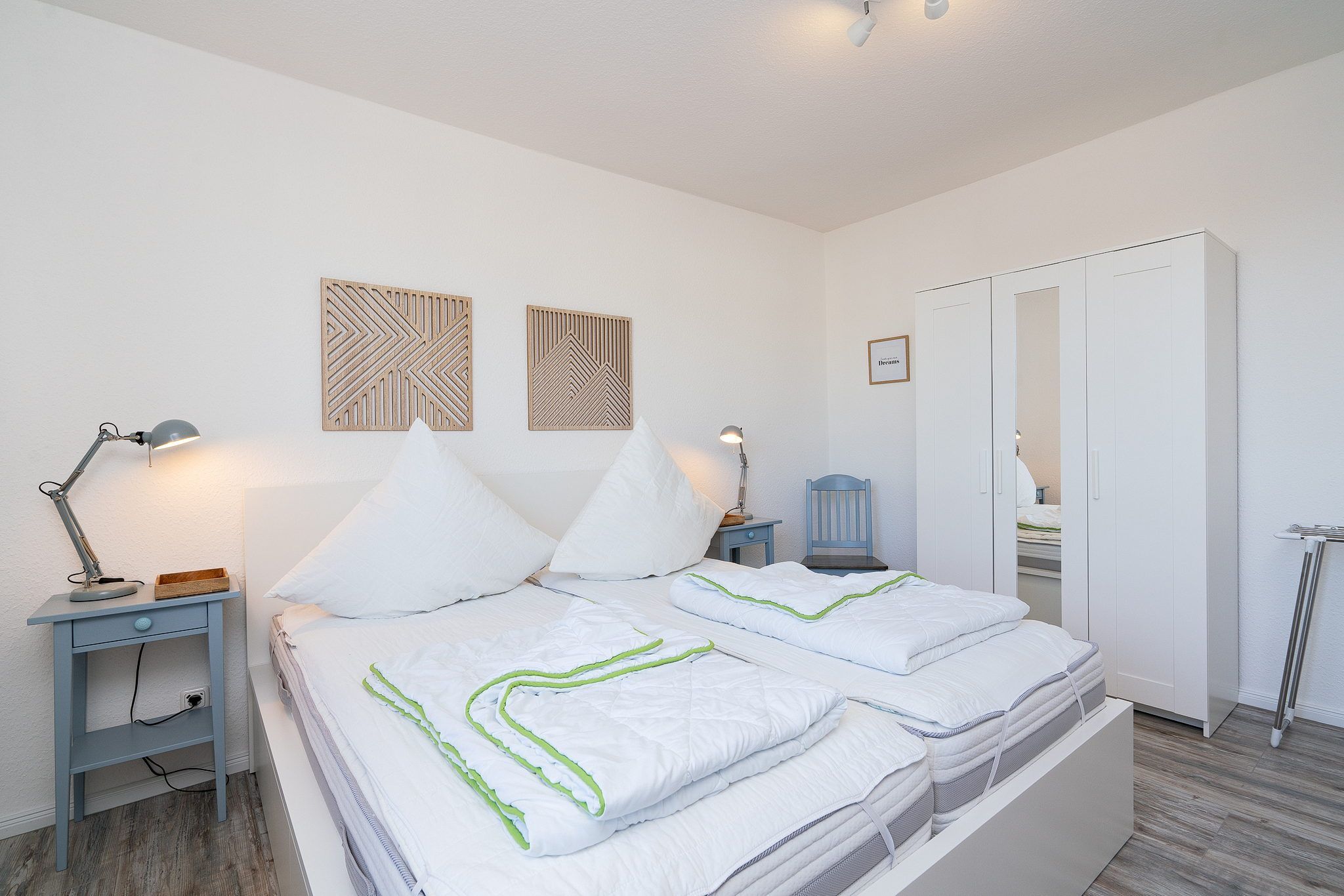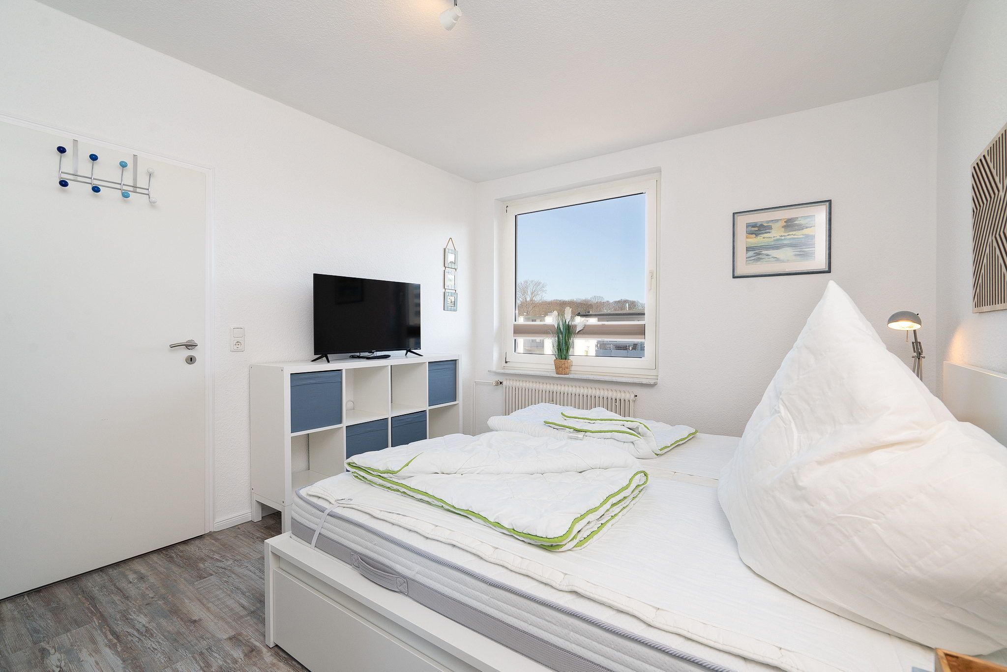 Freundliches, modernes Schlafzimmer mit einem Doppelbett (2x 90 x 200 cm), einem offenen Regal mit Körben, einem Kleiderschrank und einem Flachbildfernseher (Smart-TV, 43 Zoll). Das Schlafzimmer ist mit Laminat ausgelegt. Das Fenster lässt sich durch ein Plissee abdunkeln.