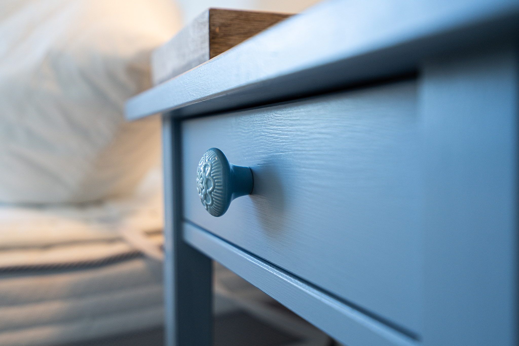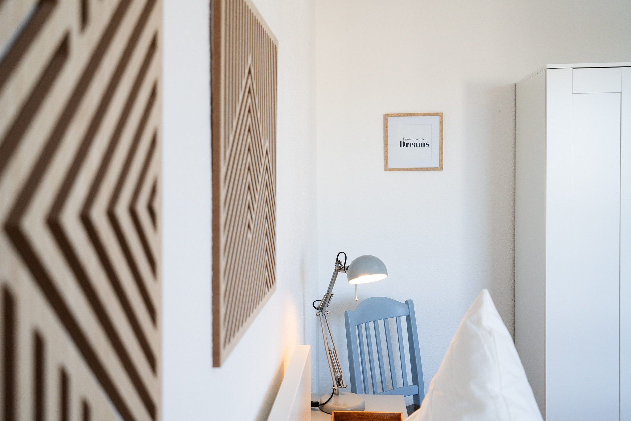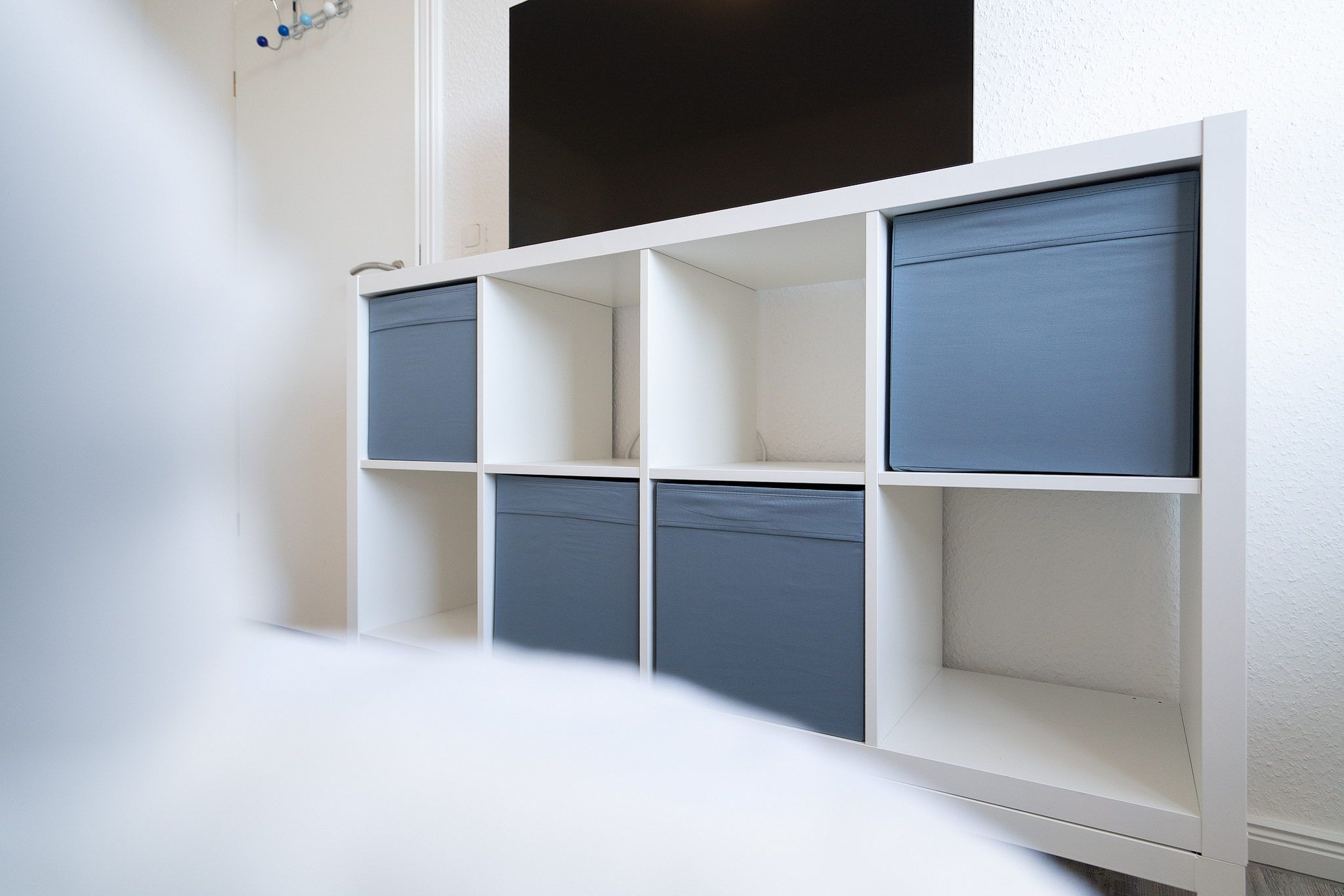 Freundliches, modernes Schlafzimmer mit einem Doppelbett (2x 90 x 200 cm), einem offenen Regal mit Körben, einem Kleiderschrank und einem Flachbildfernseher (Smart-TV, 43 Zoll). Das Schlafzimmer ist mit Laminat ausgelegt. Das Fenster lässt sich durch ein Plissee abdunkeln.