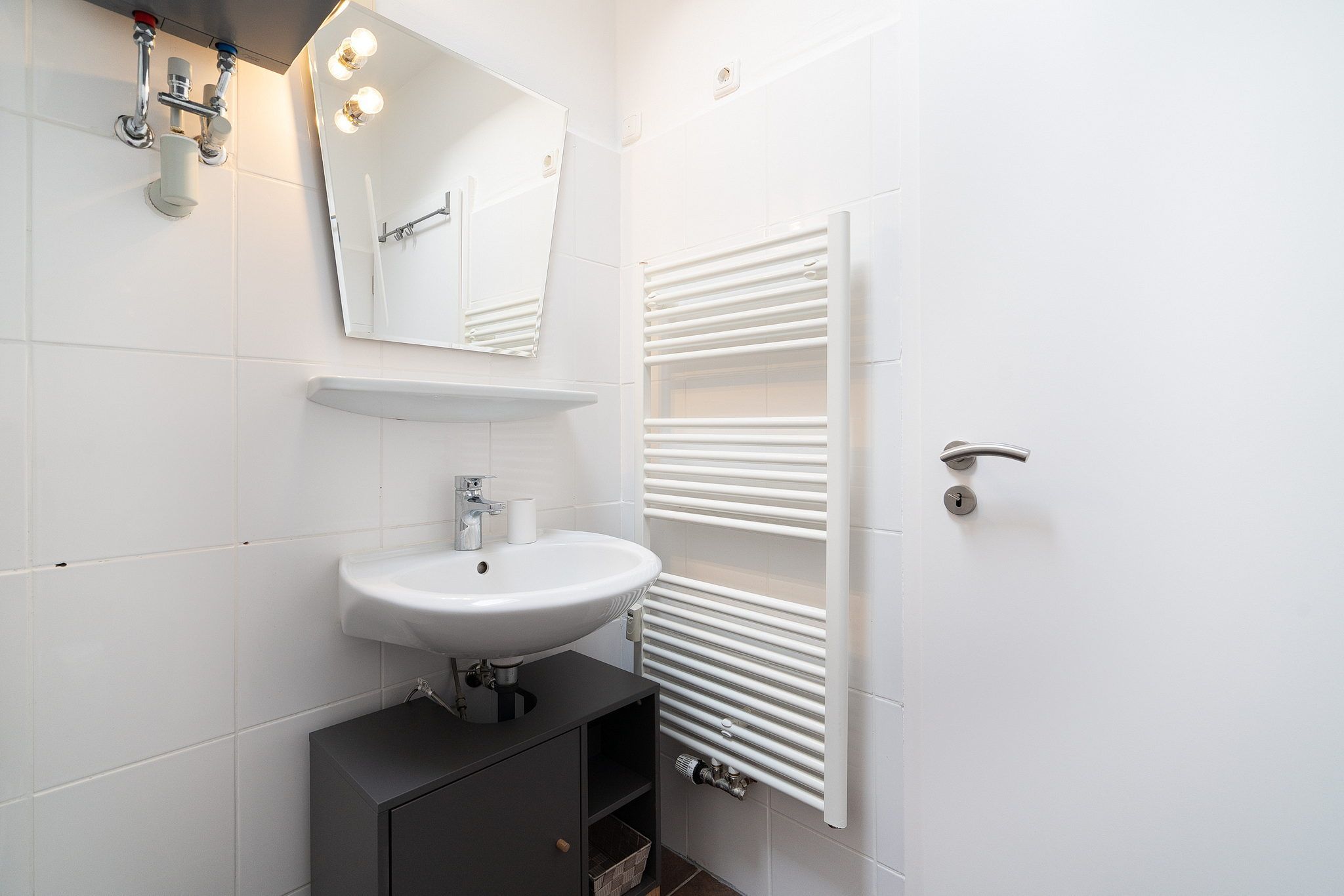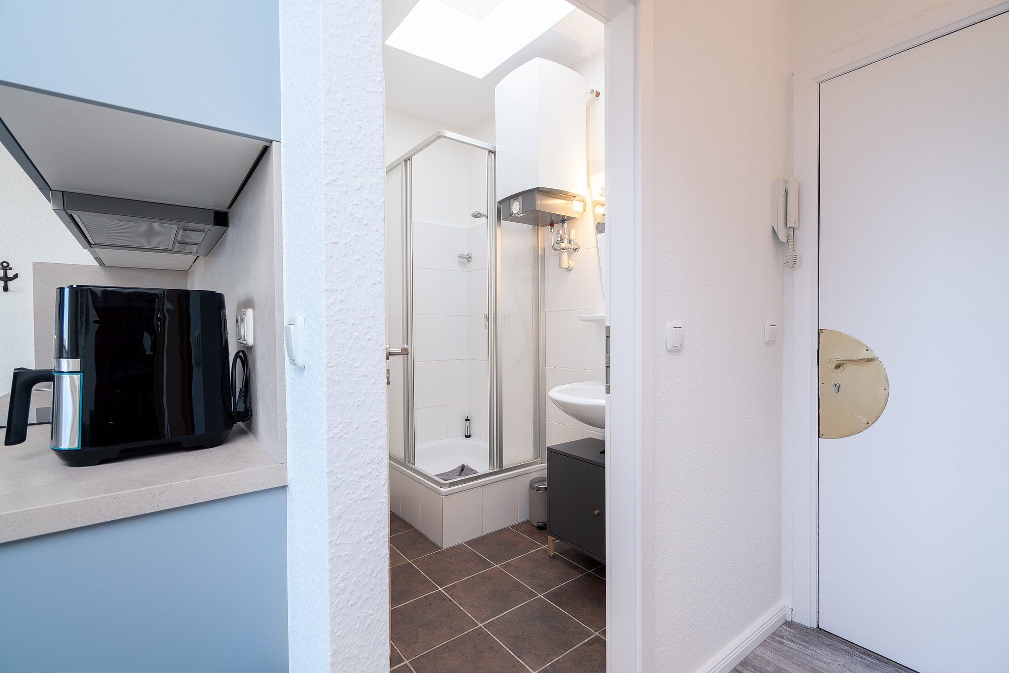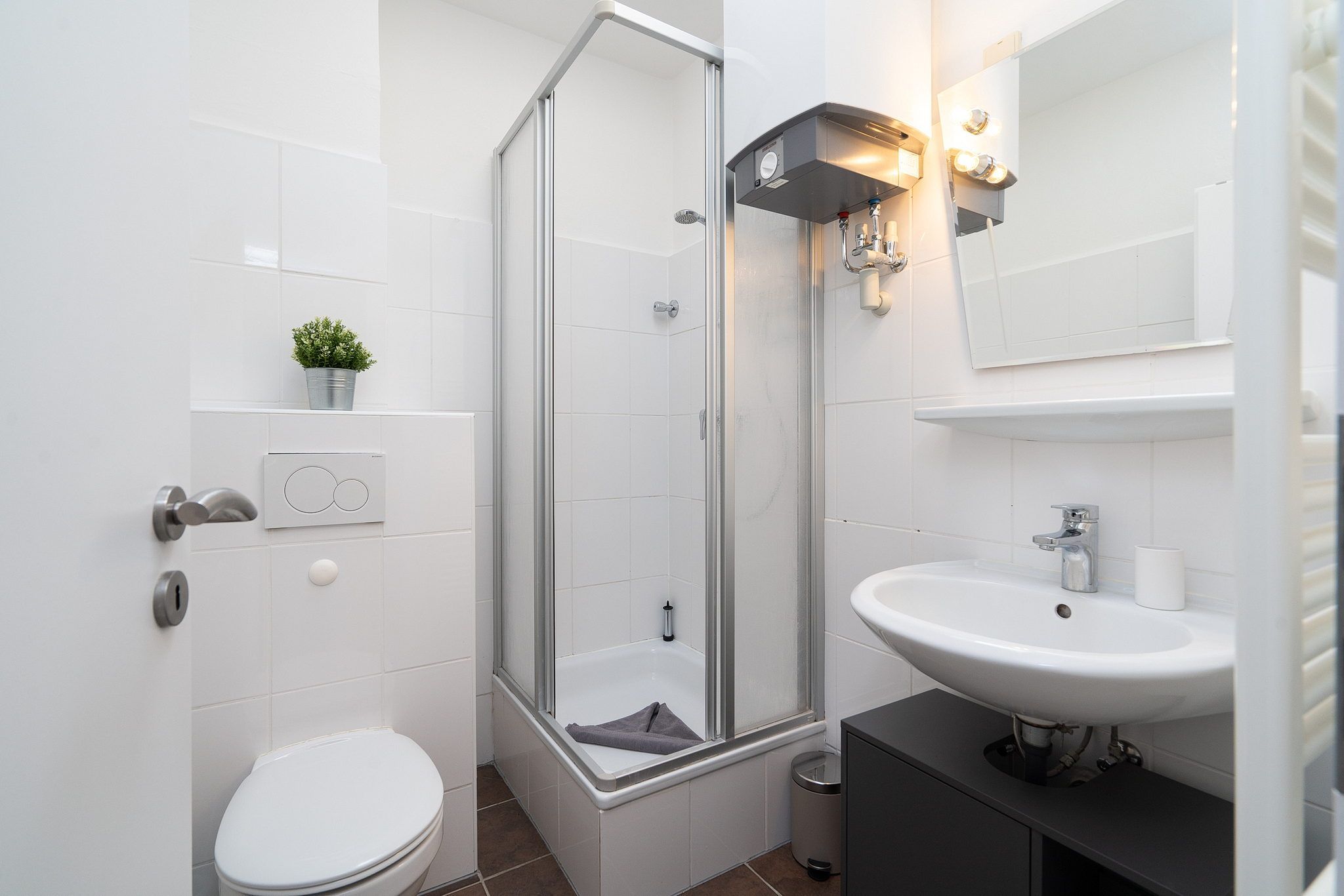 Modernes, hell gefliestes Tageslichtbad mit Dusche, Toilette und Waschbecken. Die Warmwasserversorgung erfolgt über einen Boiler.