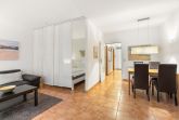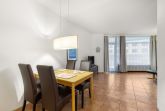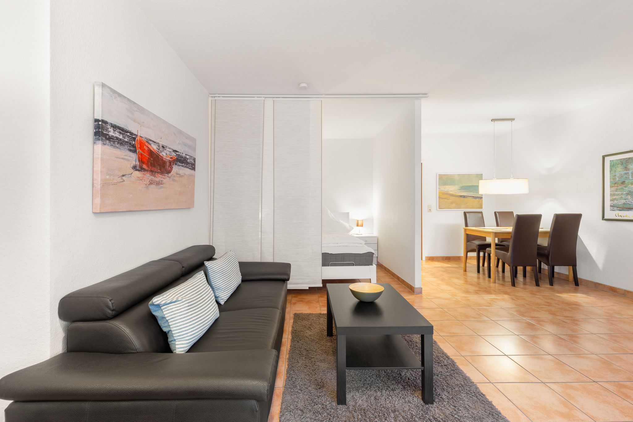 Vom gefliesten Wohn- und Esszimmer direkter Zugang zum Balkon. Das Wohn- und Esszimmer ist mit einem Esstisch mit Platz für 4 Personen, einer großen Couch mit Couchtisch, einem Fernseher und einem Kofferradio ausgestattet.