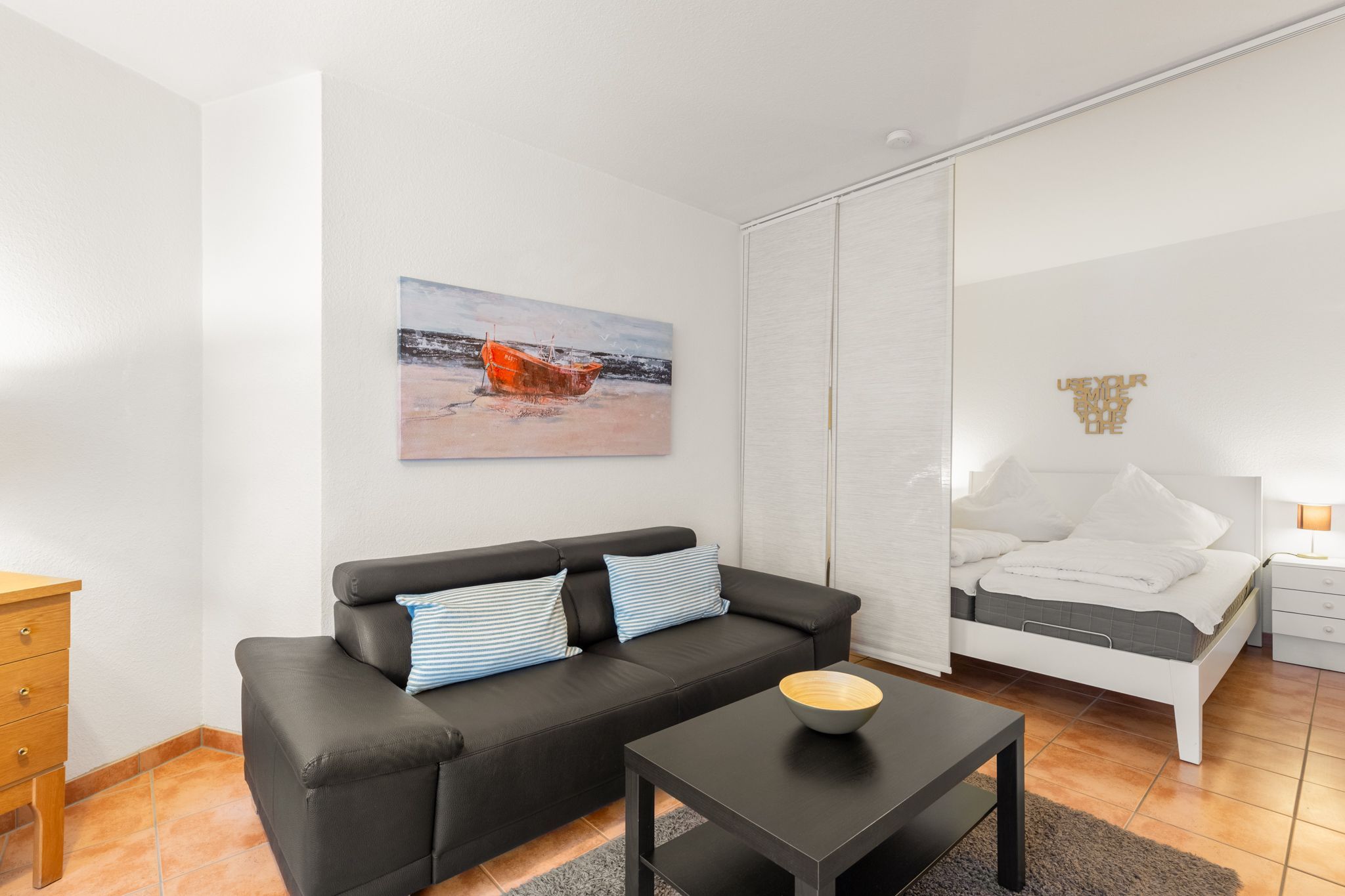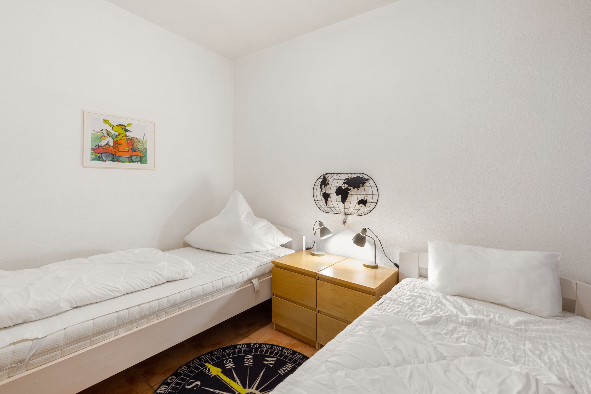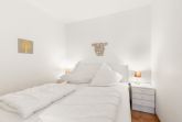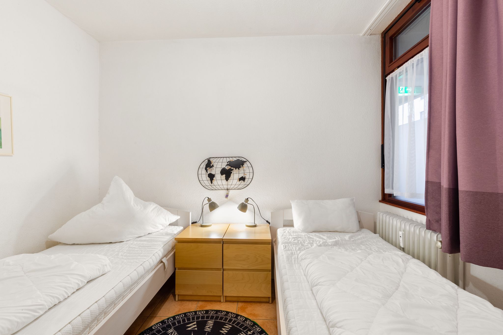 Zum Wohnzimmer offener, durch einen Vorhang getrennter Schlafbereich mit einem Doppelbett (2x 80x200 cm). Der Kleiderschrank befindet sich in einem separaten Raum im Flur. Der Schlafbereich ist gefliest.