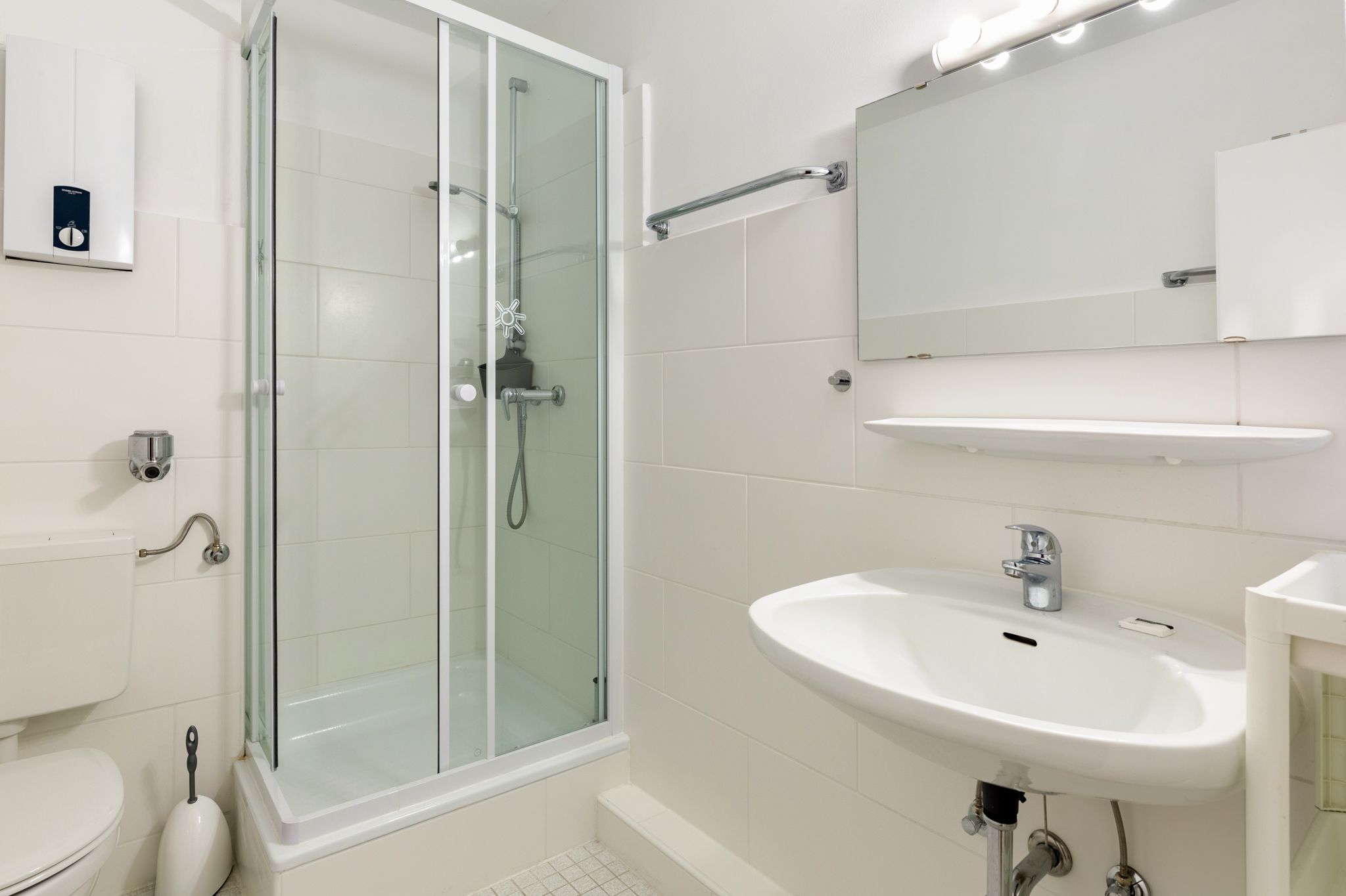 Gefliestes Bad mit Dusche, WC und Waschbecken.