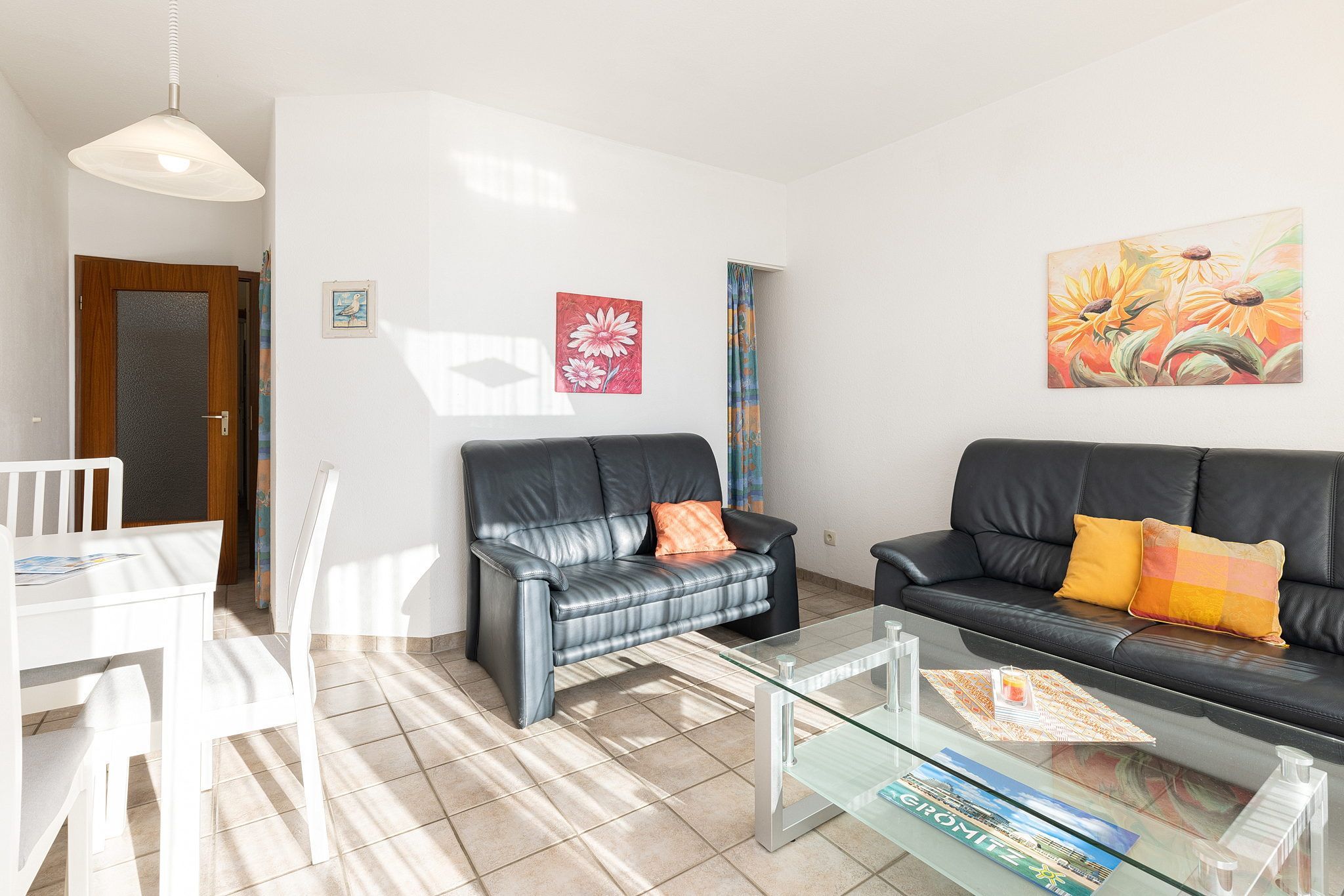 Der geflieste Wohn- Essbereich mit direktem Zugang zum Balkon ist mit einer 2er sowie einer 3er Ledercouch und einem Esstisch für 4 Personen ausgestattet. Zur Unterhaltung steht ein Flachbild-TV zur Verfügung.