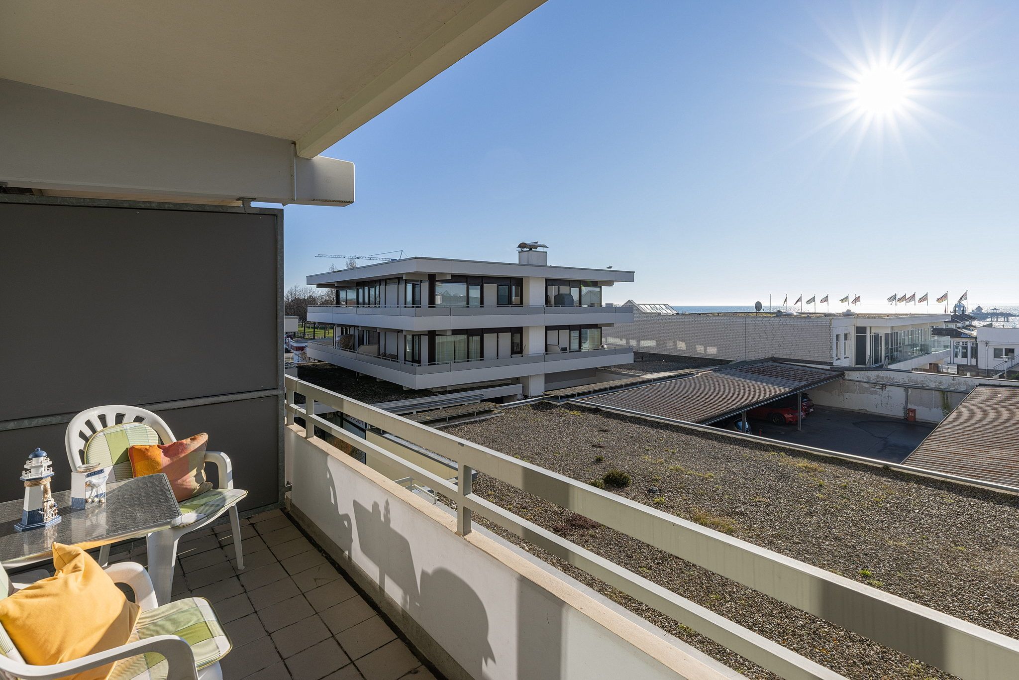 Balkon in südliche Richtung mit Seeblick. Eigener PKW-Stellplatz (max. Höhe 2,00 m), Waschmaschine und Trockner gegen Gebühr.