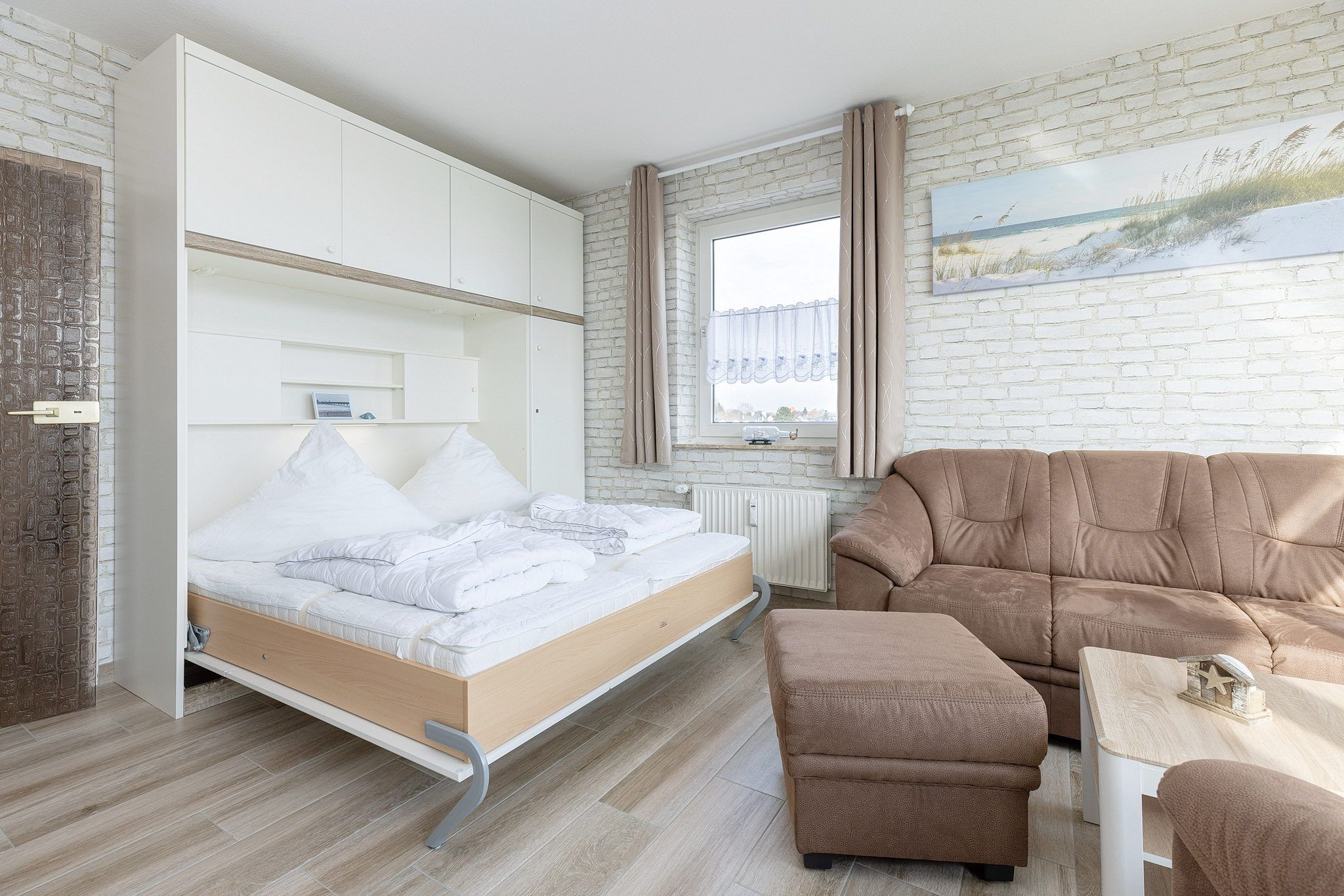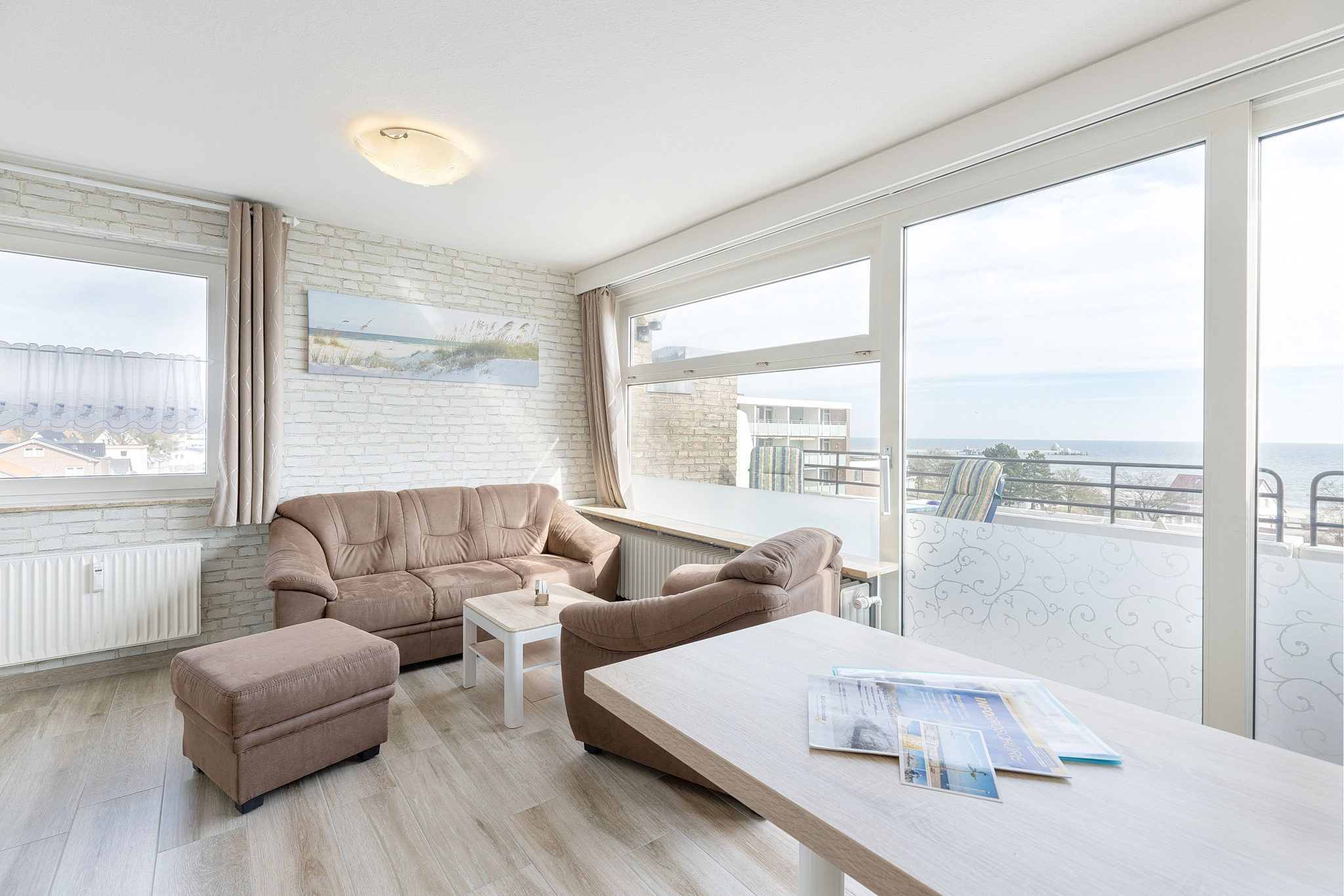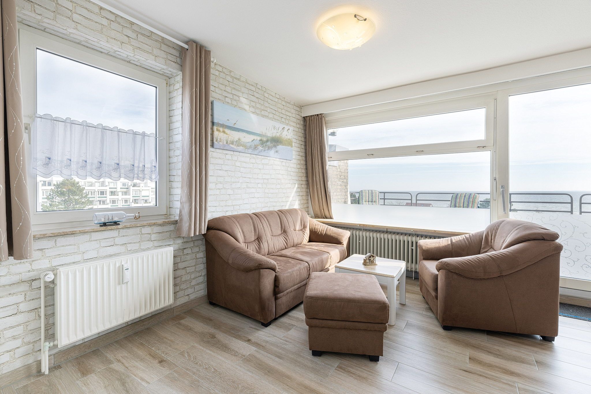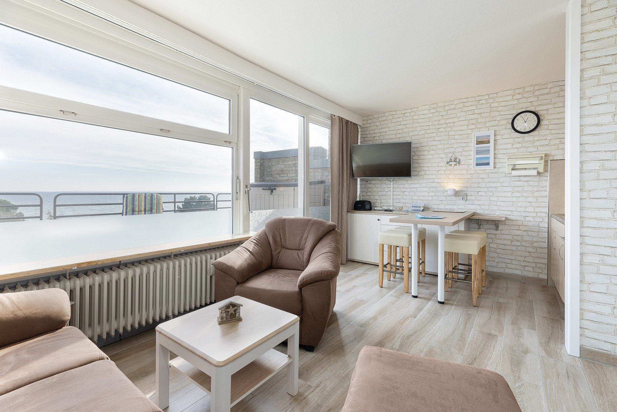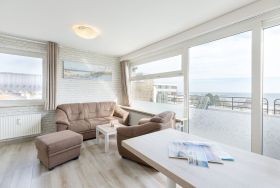 Gemütlicher Wohn- und Schlafbereich mit direktem Zugang zum schönen Balkon mit direktem Meerblick. Das Zimmer ist mit einem Schrankbett (2x80x200cm) sowie einem 3er Sofa, 1 Sessel und 1 Hocker ausgestattet. Zur Unterhaltung stehen ein Flachbild-LED-TV, ein DVD-Player und ein Radio zur Verfügung. Das Wohnzimmer ist gefliest und lässt sich durch Vorhänge verdunkeln.