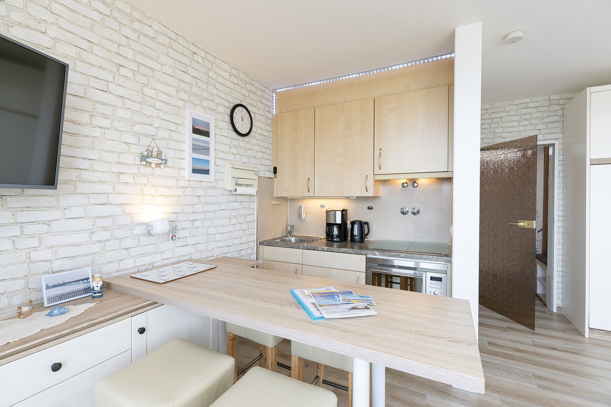 Zum Wohnzimmer offene Küchenzeile mit 4-Platten-Cerankochfeld, Mikrowelle mit Backofenfunktion und Kühlschrank mit kleinem Gefrierfach. Ebenso stehen eine Kaffeemaschine, ein Wasserkocher und ein Toaster zur Verfügung.