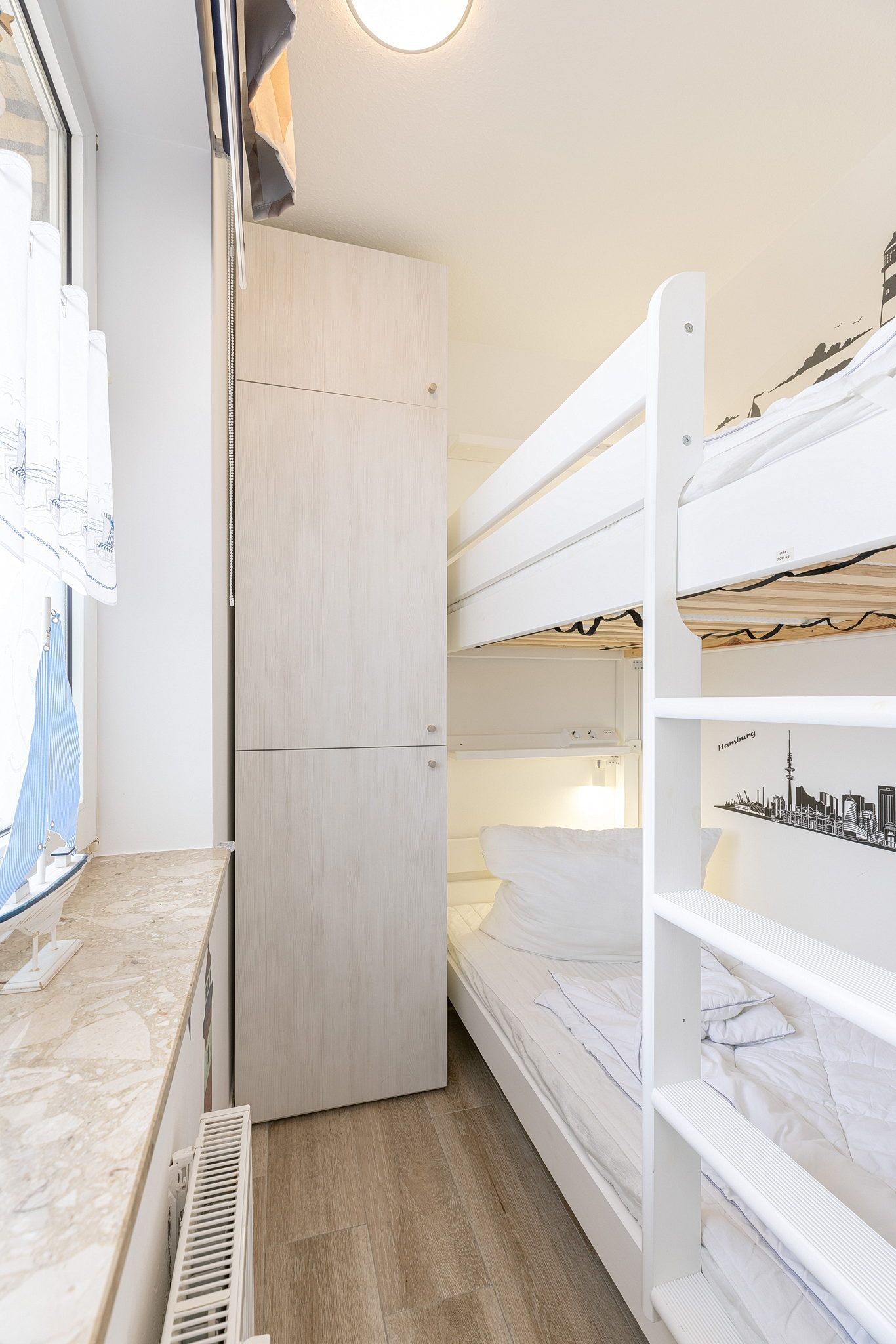 Das Kinderzimmer verfügt über ein Etagenbett (2x80x190cm) sowie einen kleinen eintürigen Kleiderschrank. Der Raum ist gefliest und lässt sich durch ein Rollo verdunkeln.