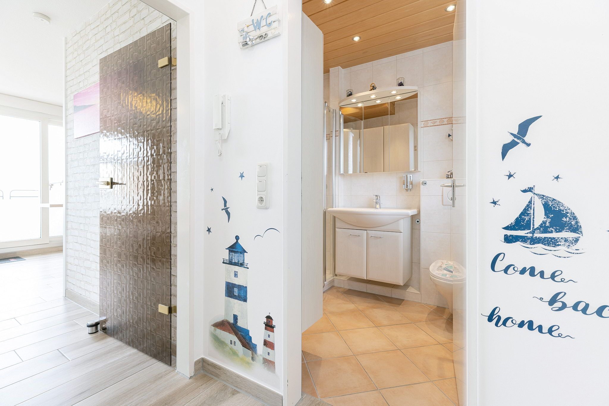 Freundlich helles Badezimmer mit Dusche, WC und Waschbecken.