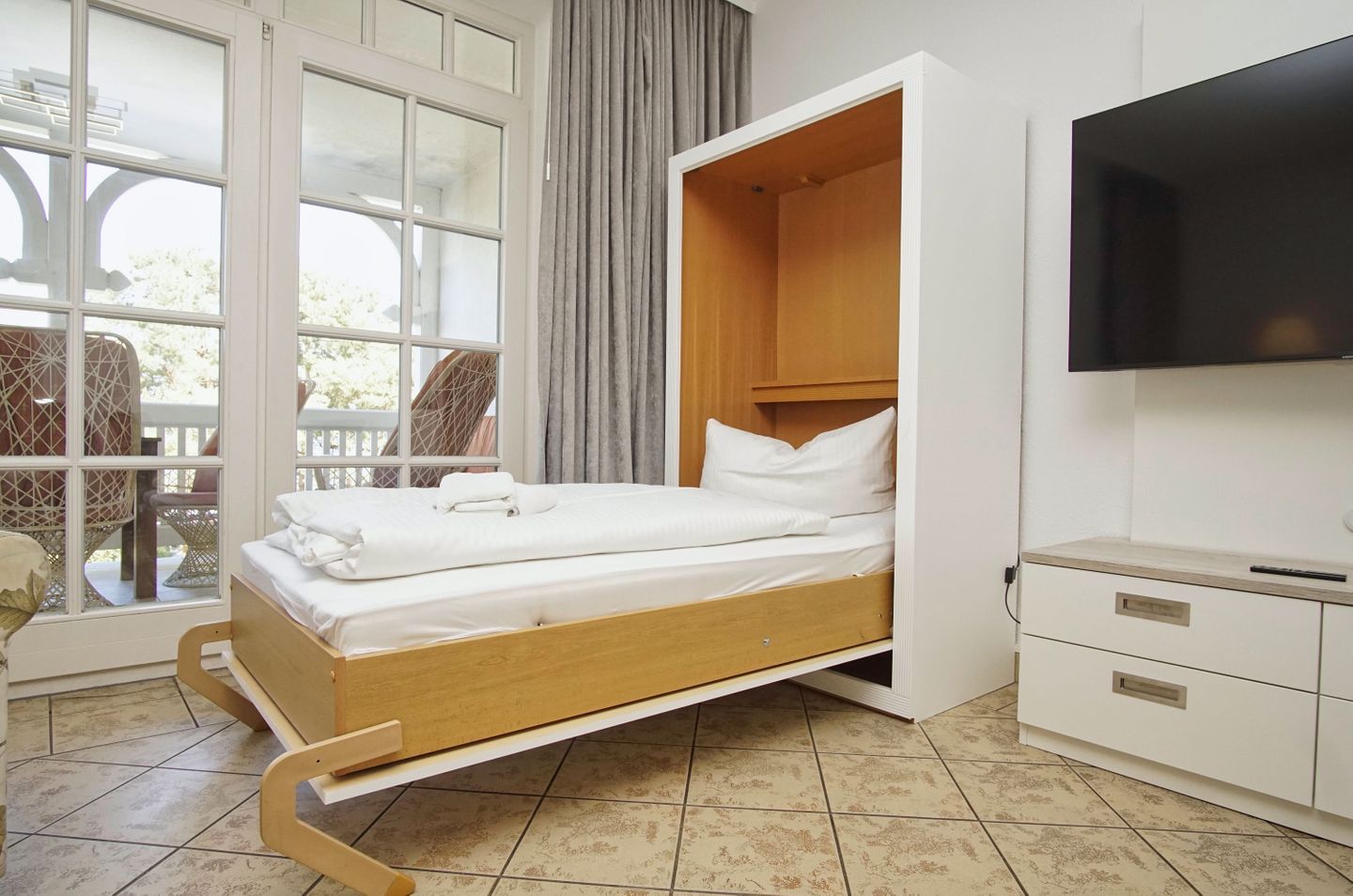 WOHNEN // Wohnraum mit Essbereich, Sitzgarnitur, Schrankbett, Kabel-TV ++