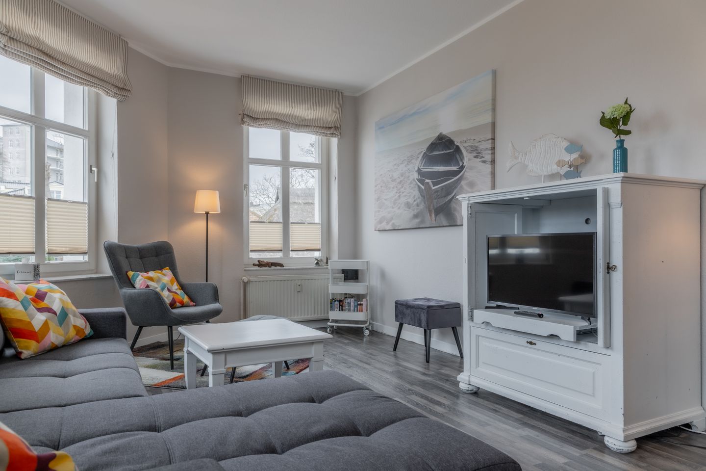 Von außen in weißer, eleganter Bäderstilarchitektur gehalten, von innen geht die Sonne auf – helle Farben erwecken Freude und Lebenslust. In den 2- und 3-Raum-Wohnungen haben bis zu 4 bzw. 6 Personen Platz und es wird Ihnen an nichts fehlen.