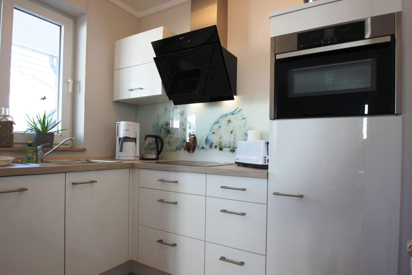 KÜCHE // Küchenzeile, Cerankochfeld (4-Platten), Spülmaschine, Kühlschrank mit Gefrierfach, Backofen, Toaster, Wasserkocher, Kaffeemaschine, reichlich Besteck, Geschirr und Küchenutensilien ++
