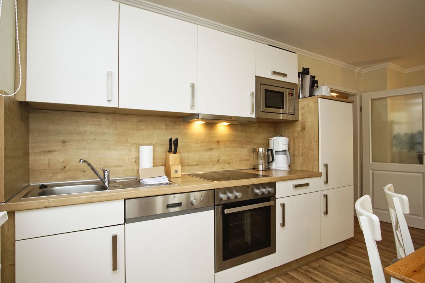 KÜCHE // Küchenzeile, 4-Platten-Herd, Spülmaschine, Kühlschrank mit Gefrierfach, Backofen, Mikrowelle, Toaster, Wasserkocher, Kaffeemaschine, reichlich Besteck, Geschirr und Küchenutensilien ++