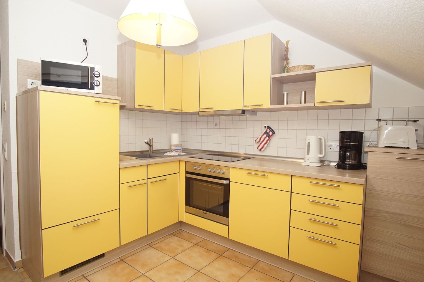 KÜCHE // Küchenzeile, 2-Platten Ceranherd, Spülmaschine, Kühlschrank mit Gefrierfach, Mikrowelle, Toaster, Wasserkocher, Kaffeemaschine, reichlich Besteck, Geschirr und Küchenutensilien ++