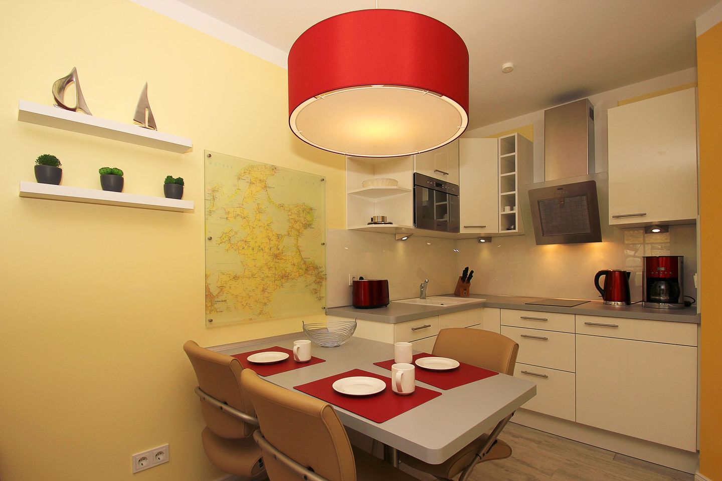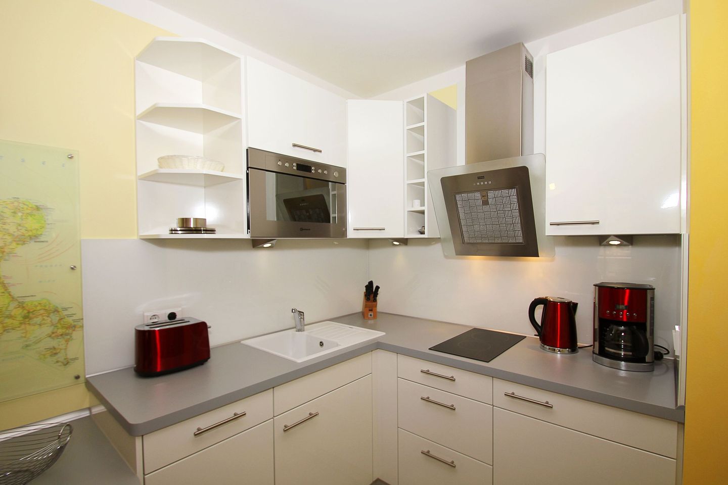 KÜCHE // exquisite Küchenzeile, 2-Platten Ceranherd, Spülmaschine, Kühlschrank mit Gefrierfach, Mikrowelle mit Grillfunktion, Toaster, Wasserkocher, Kaffeemaschine, Besteck, Geschirr und reichlich Küchenutensilien ++