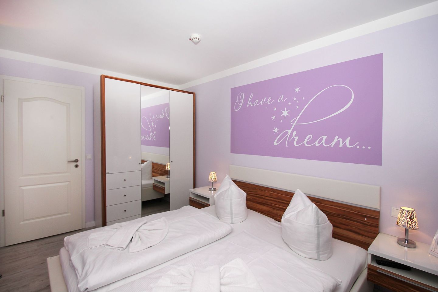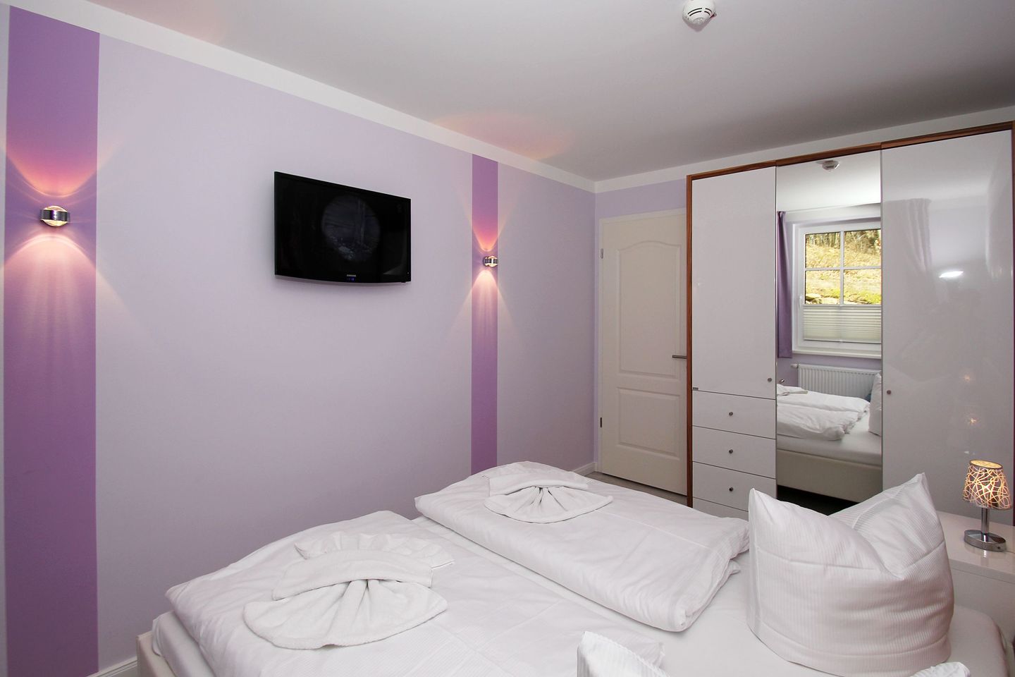 SCHLAFEN // luxuriöses Schlafzimmer mit bequemem Doppelbett, Ambientebeleuchtung und großem Kleiderschrank (alles Hülsta), Flachbild-TV, hochwertige Schlafcouch mit Kaltschaummatratze im Wohnbereich (200cm x 160cm) ++
