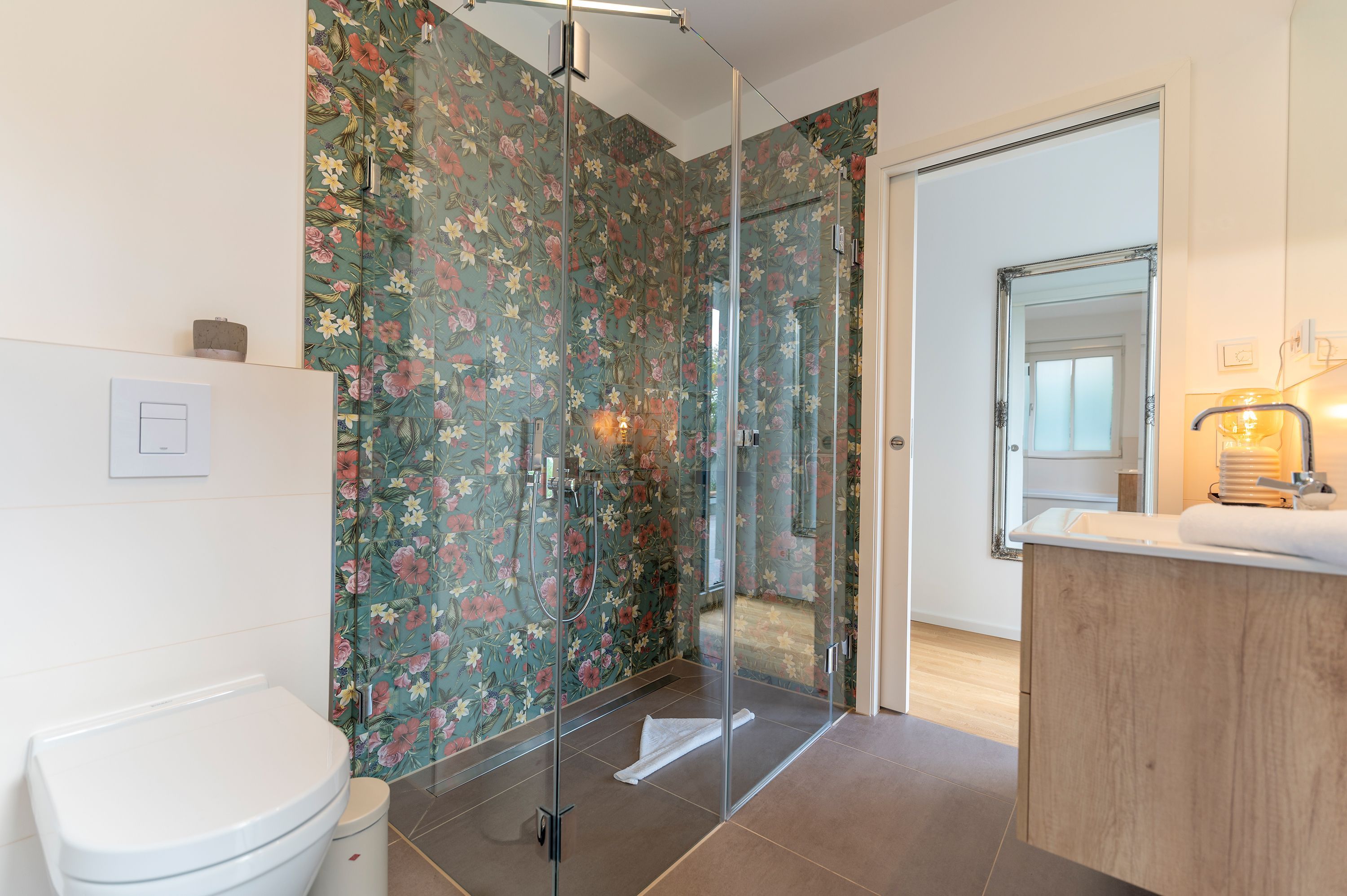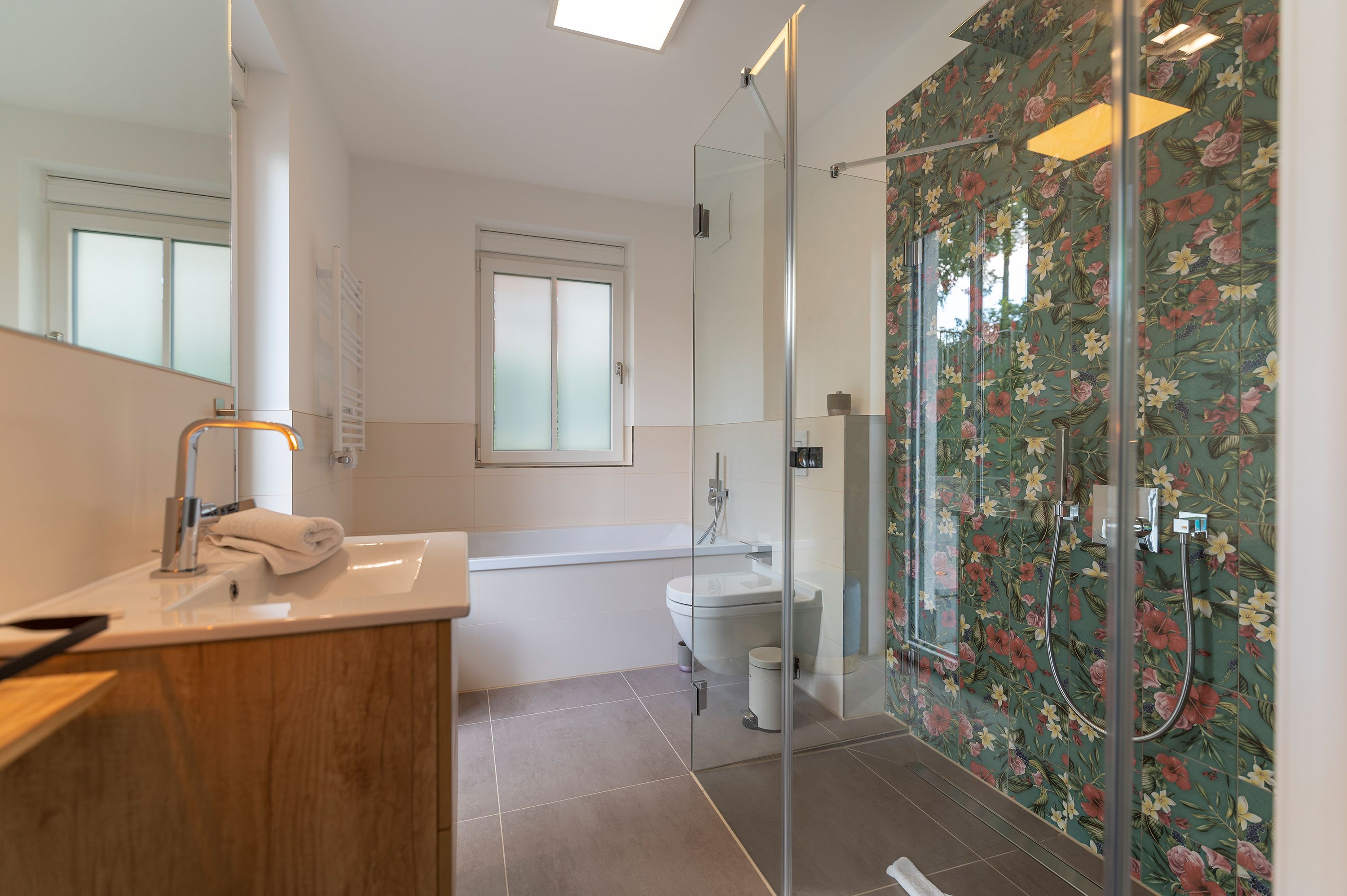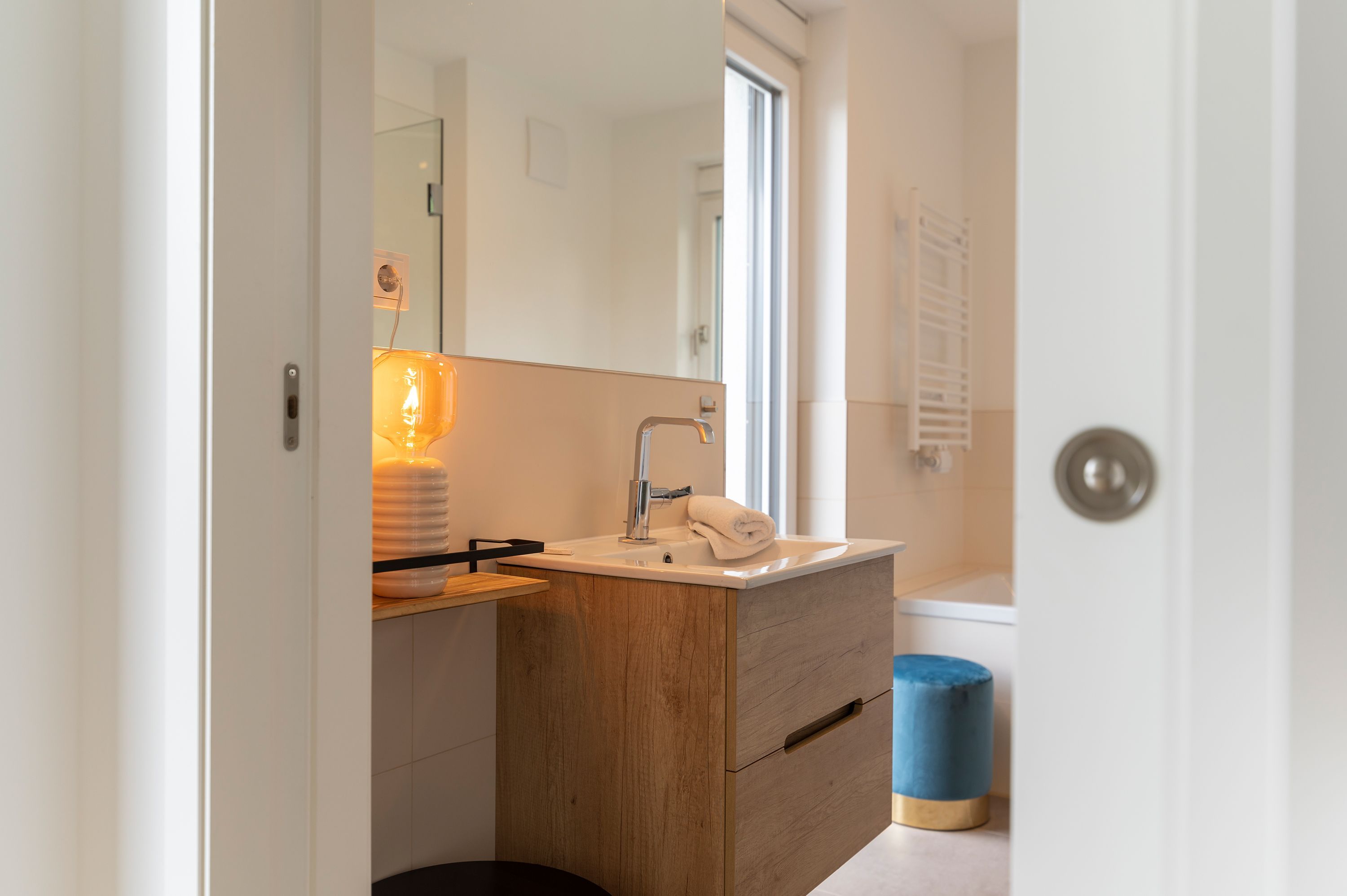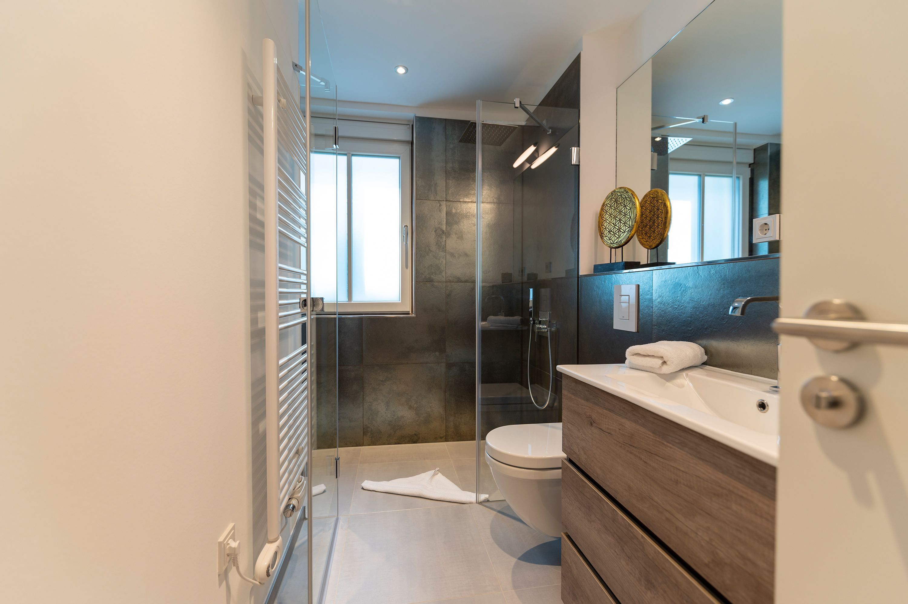 Die Ferienwohnung bietet weiterhin zwei Schlafzimmer, beide eingerichtet mit gemütlichen Boxspringbetten und Flachbildfernsehern. Ein Schlafzimmer verzaubert zusätzlich mit einem begehbaren Kleiderschrank und einem en-suite Badezimmer, das durch seine stilvolle Dusch-Rückwand hervorsticht. Komplettiert wird das Wohnangebot durch ein separates Badezimmer, ausgestattet mit einer großzügigen Dusche und einem weitläufigen Waschtisch.
