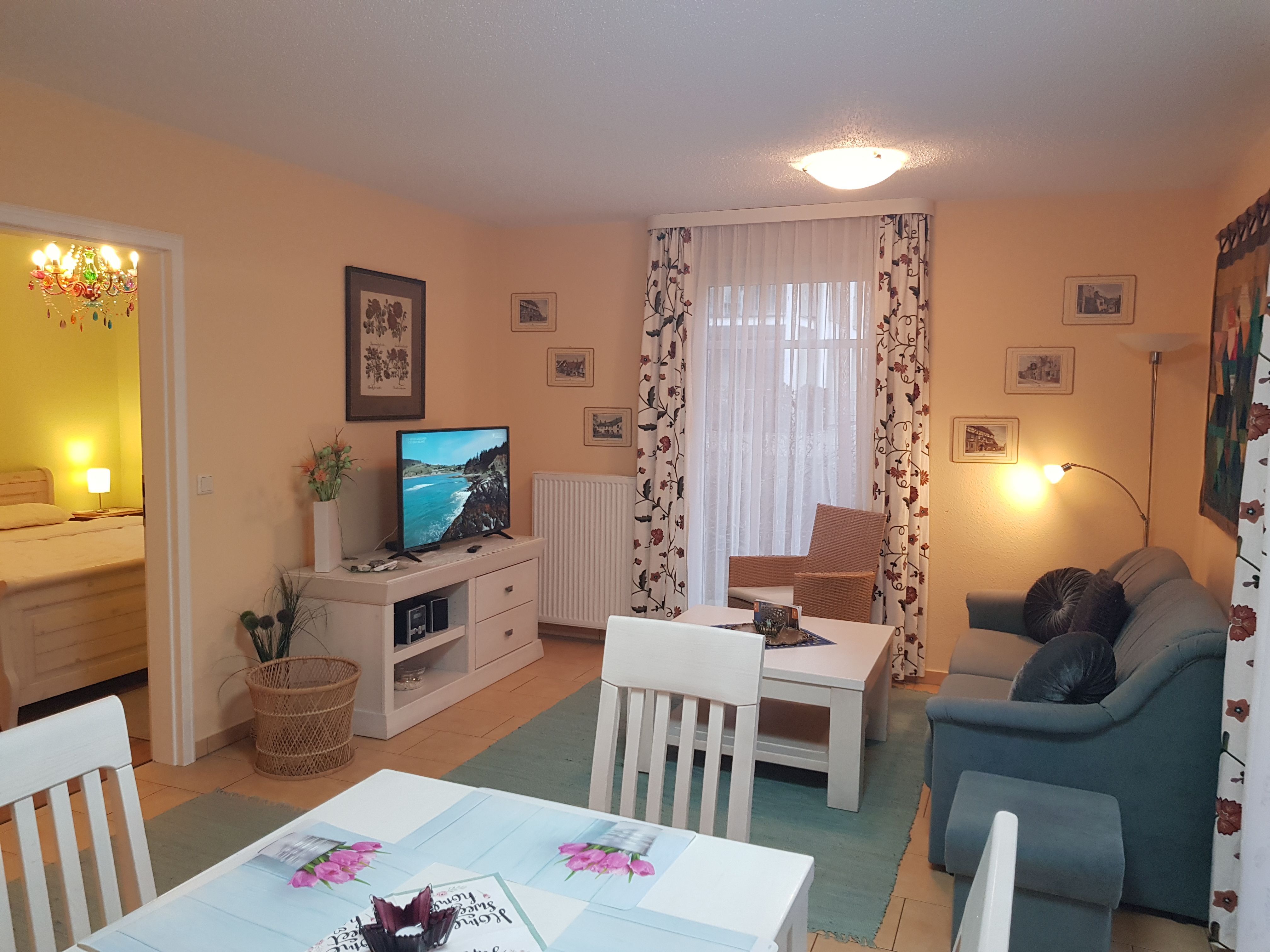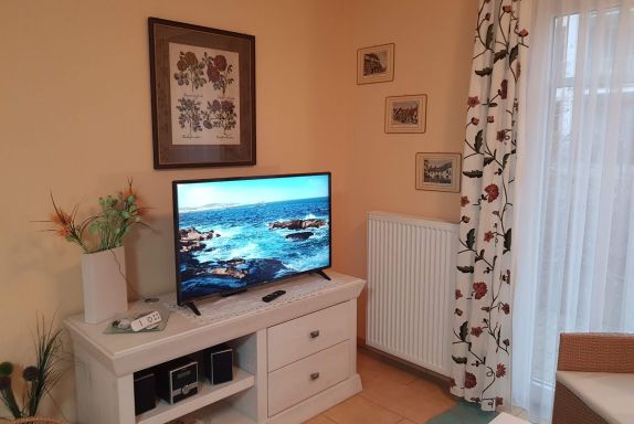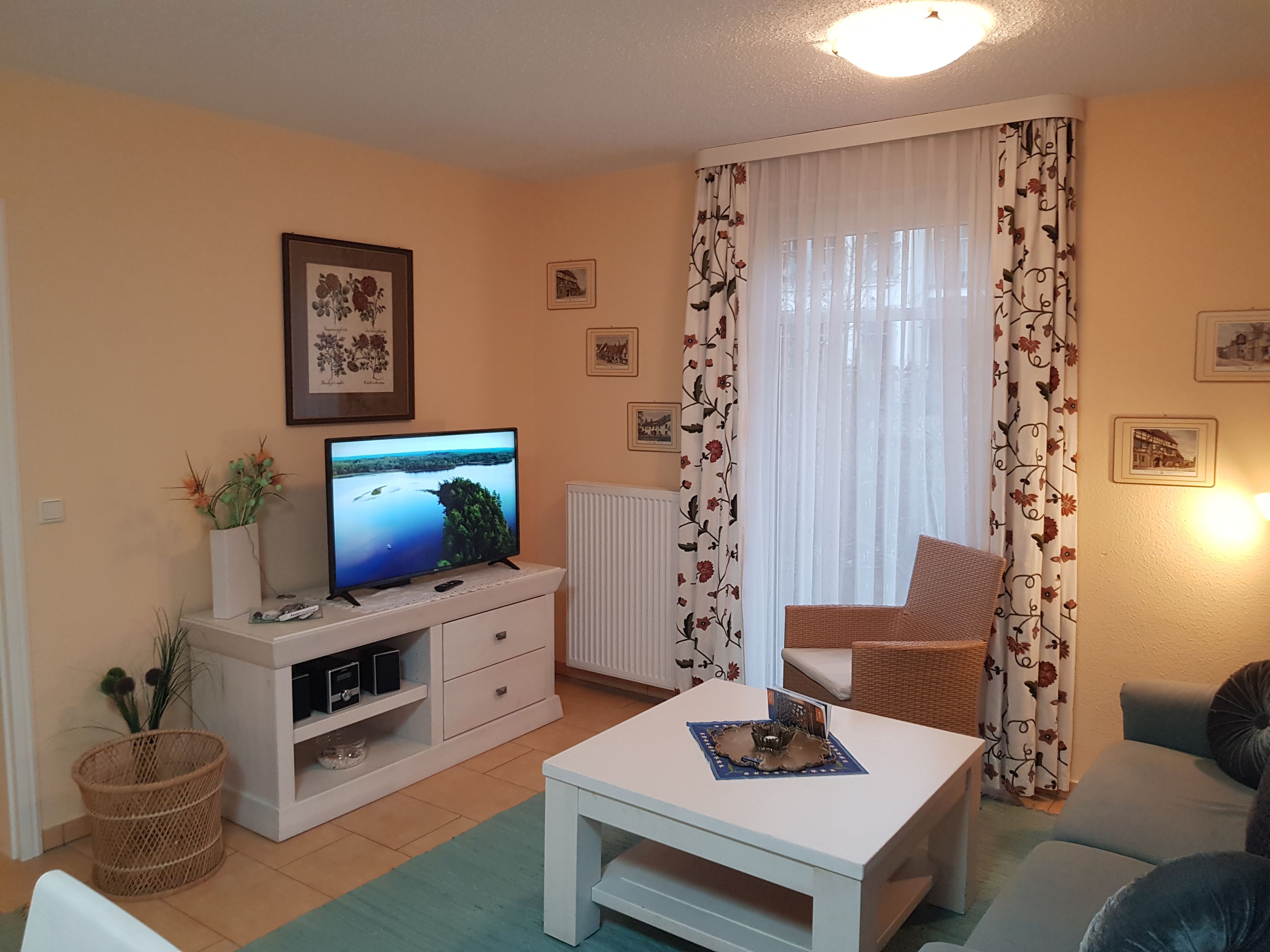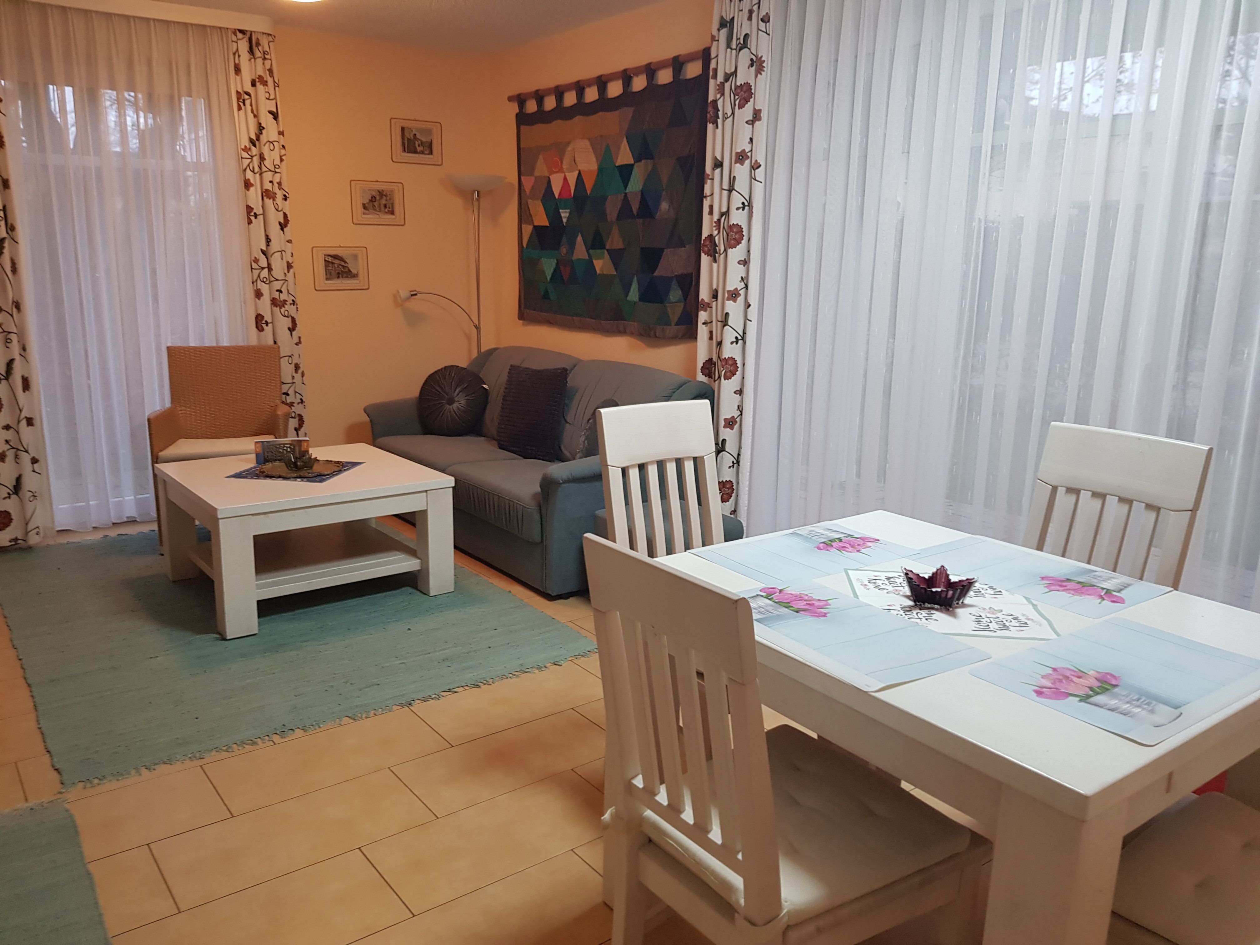 Die 60 m ² große Ferienwohnung 04 befindet sich im Parterre in der Villa Seefisch . Sie bietet mit ihren zwei Zimmern ausreichend Platz für bis zu 4 Personen. Die Lage in einer ruhigen Seitenstraße befindet sich die Ferienwohnung  weniger als 10 Gehminuten von der Strandpromenade entfernt. Die Ferienwohnung verfügt über einen Wohnbereich mit offener Küche, ein Schlafzimmer, ein Bad mit Dusche und einer möblierten Terrasse. Im gemütlichen Wohnbereich laden bequeme Polstergarnituren und ein Flachbildfernseher zu geselligen Abenden ein. Der Essbereich ist im Wohnbereich integriert und ein Tisch mit 4 Stühlen bietet hier ausreichend Platz zum gemeinsamen Essen. Die hier angrenzende Küchenzeile ist mit einem Kühlschrank mit Gefrierfach, einem Geschirrspüler und einem Backofen mit Kochfeld ausgestattet. Eine Kaffeemaschine, ein Toaster und ein Wasserkocher stehen Ihnen hier selbstverständlich zur Verfügung.Im Schlafzimmer bietet Ihnen ein Doppelbett ausreichend Platz für einen erholsamen Schlaf.Das Badezimmer ist mit einer Dusche und WC ausgestattet.Lassen Sie den Abend nach einem erlebnisreichen Tag gemütlich auf der überdachten Terrasse ausklingen und genießen Sie die idyllische Ruhe. Auf Wunsch stellen wir Ihnen ein Kinderbett und einen Hochstuhl zur Verfügung. Zu dieser Wohnung gehört ein kostenloser PKW-Stellplatz auf dem Grundstück in der Ulmenallee  7.