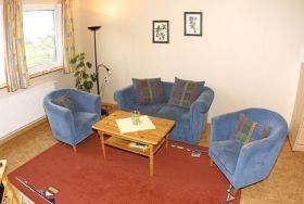 Größe ca. 73 Quadratmeter, Wohnraum mit integrierter Küche, Schlafzimmer, zweites separates Schlafzimmer/Kinderzimmer, Badezimmer mit Dusche, Waschtisch und WC, Obergeschoss, optimal für 2 bis 4 Personen.