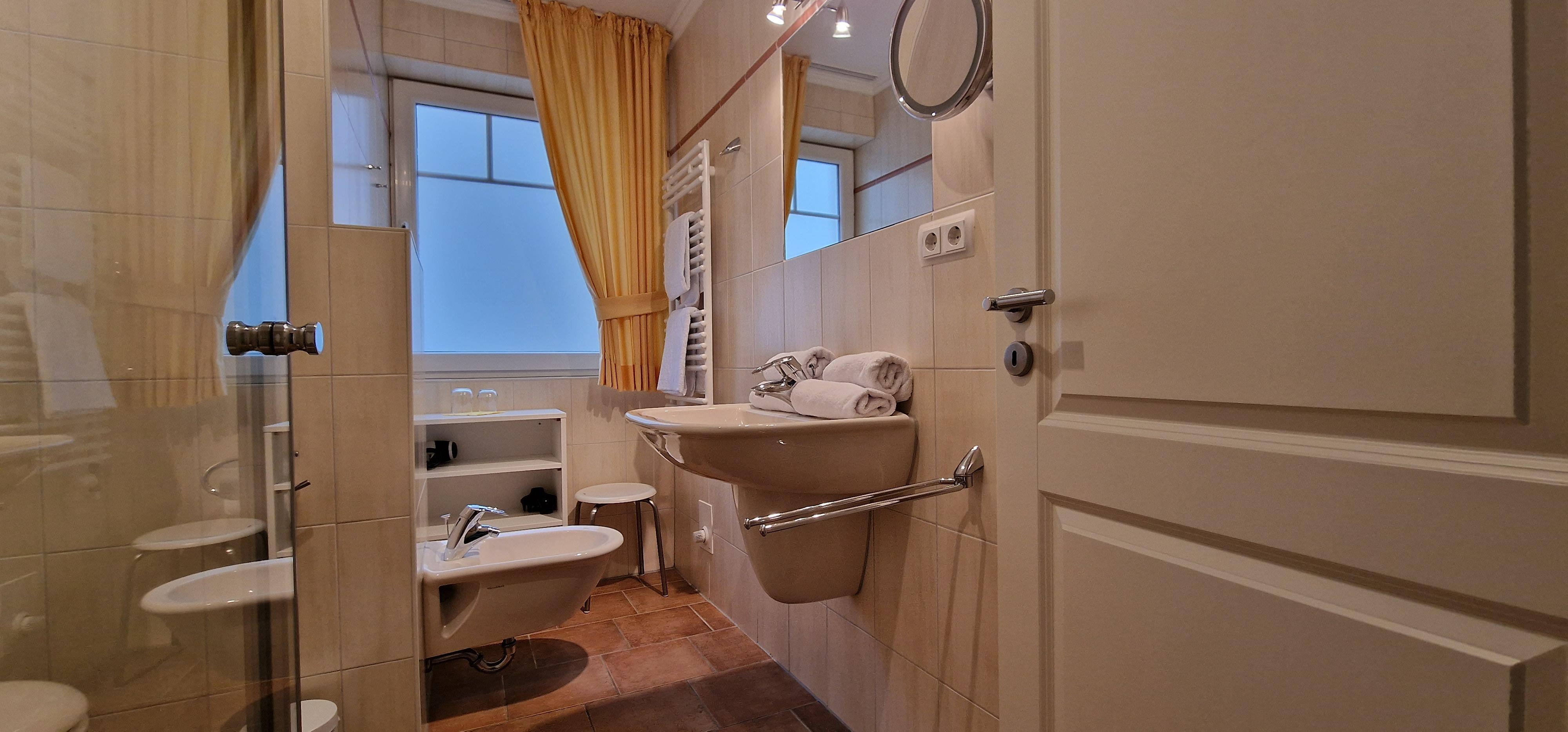 Die Wohnung ist am Kurpark, Kurparkstr. 7 in der 1. Etage, Appartment-Aufteilung ca. 40m². Neuwertig möbliert, Fernseher, Stereoanlage usw. Wohn- und Esszimmer mit Ausgang auf den möblierten Sonnenbalkon, Schlafzimmer, Flur, Behindertenfreundliches Duschbad mit Bidet, Einbauküche im Wohnbereich (Geschirrspüler, Backofen, Ceranfeld, Gefrierfach, Mikrowelle usw.) Terrakottafliesen, TV-Überwachung, Kabel-TV, Wlan-Internet, Aufzug, Sauna Wellnessbereich, Waschmaschine,Trockner. Unsere Preise variieren, je nach Saison, zzgl. Endreinigung, zubuchbar Wäschepaket Parkplatz Wlan kostenlos. Diese Ferienwohnung ist für 1-2 Personen, mediterran, eingerichtet. Der Rücksichtnahme wegen, ist das Rauchen nur auf dem überdachten Balkon und der dafür eingerichteten Sitzecke im Innenhof gestattet.