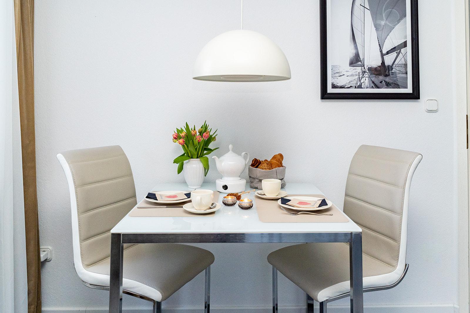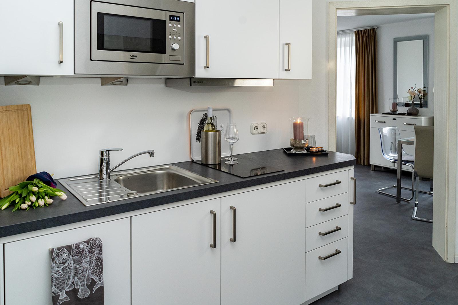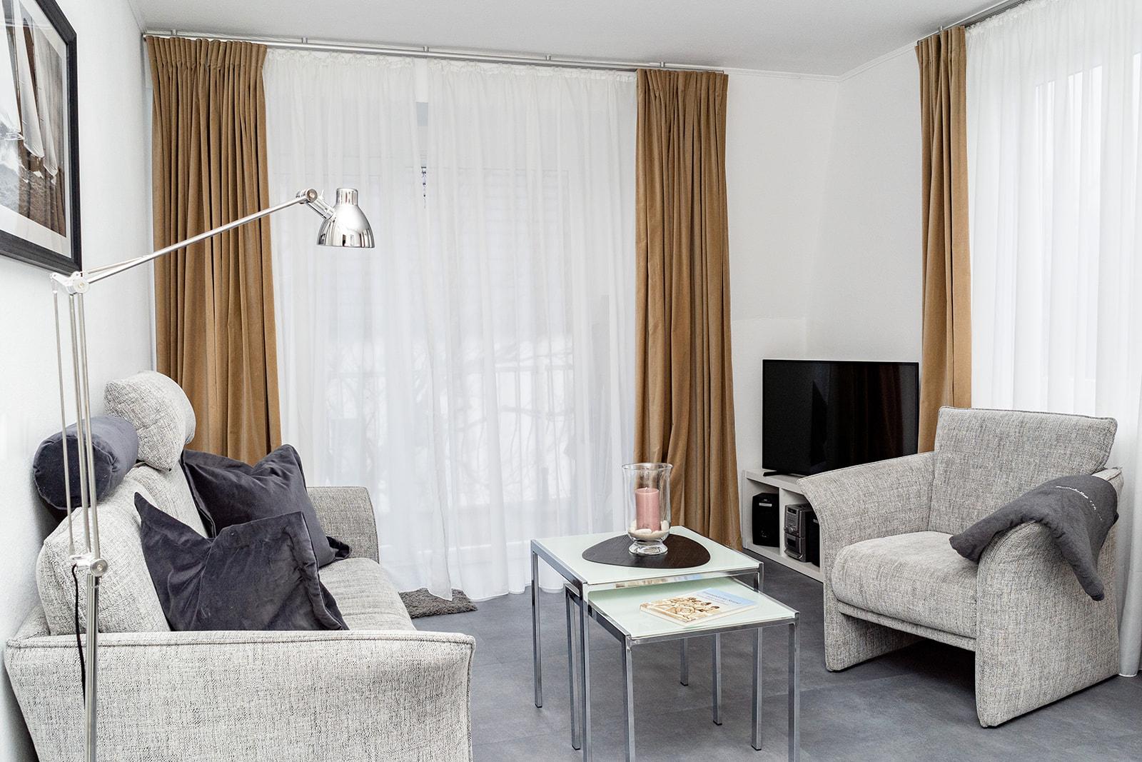 3-Zimmer-Apartment mit Balkon für 2-3 Personen. Wohnzimmer mit Essplatz und Fernseher, 1 Schlafzimmer mit Doppelbett, 1 kleines Schlafzimmer mit Einzelbett und zweitem Fernseher, Duschbad mit Fenster, Handtuchheizung, Föhn und Kosmetikspiegel, voll ausgestattete Küchenzeile im Eingangsbereich