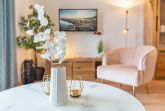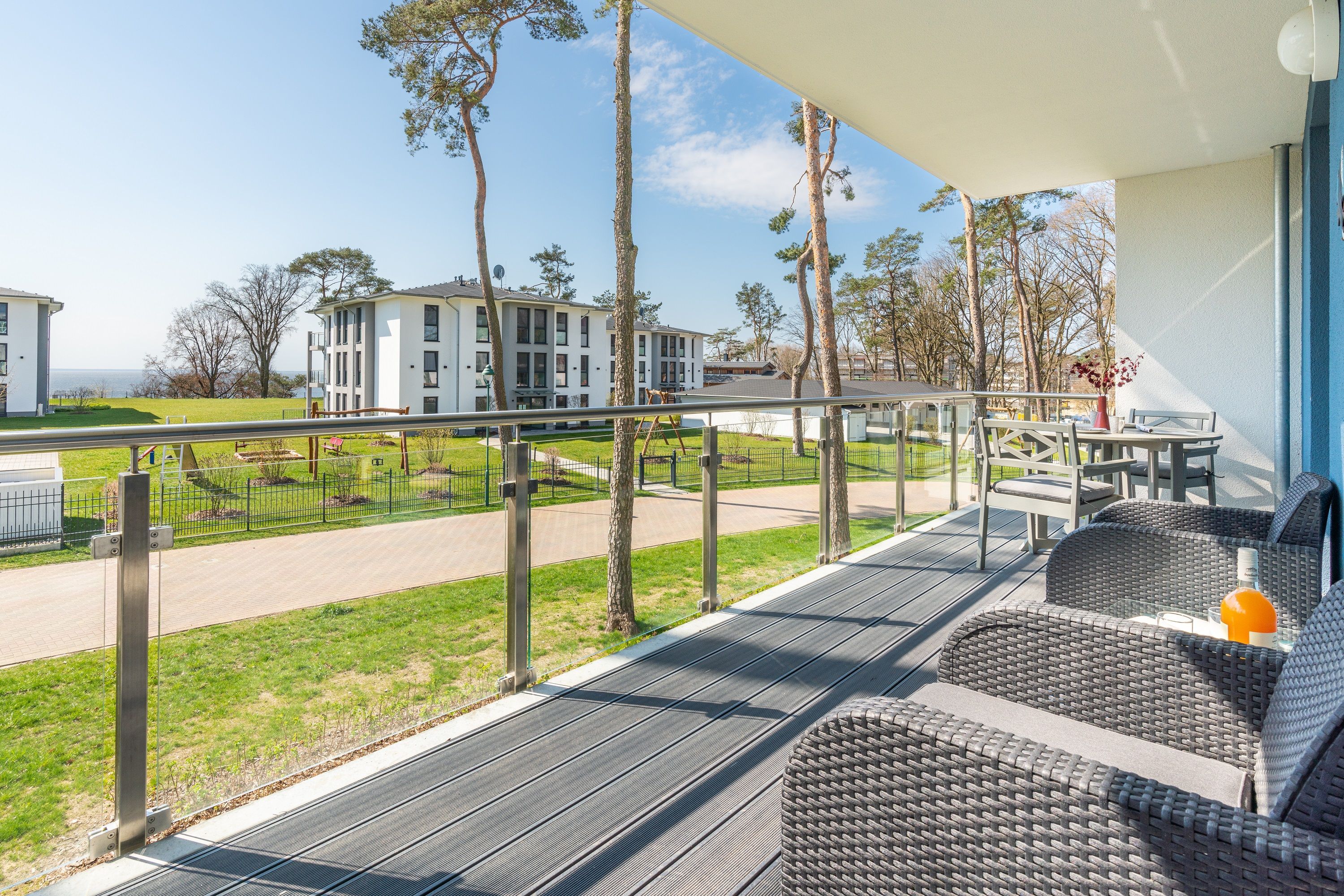 Der offene Wohnbereich ist ausgestattet mit einem gemütlichen Sofa und Smart-TV. Sie haben vom Wohn- und Schlafzimmer aus Zugang zum großen Süd-Balkon. Der möblierte Balkon mit traumhaften Ausblicken auf das Stettiner Haff bietet auch aus der zweiten Reihe einen wunderschönen Ort, um Ihre Mahlzeiten zu genießen und die Aussicht zu bewundern.