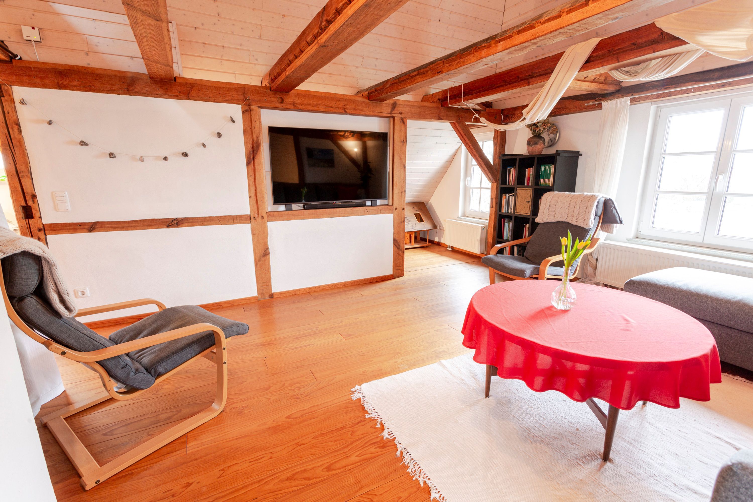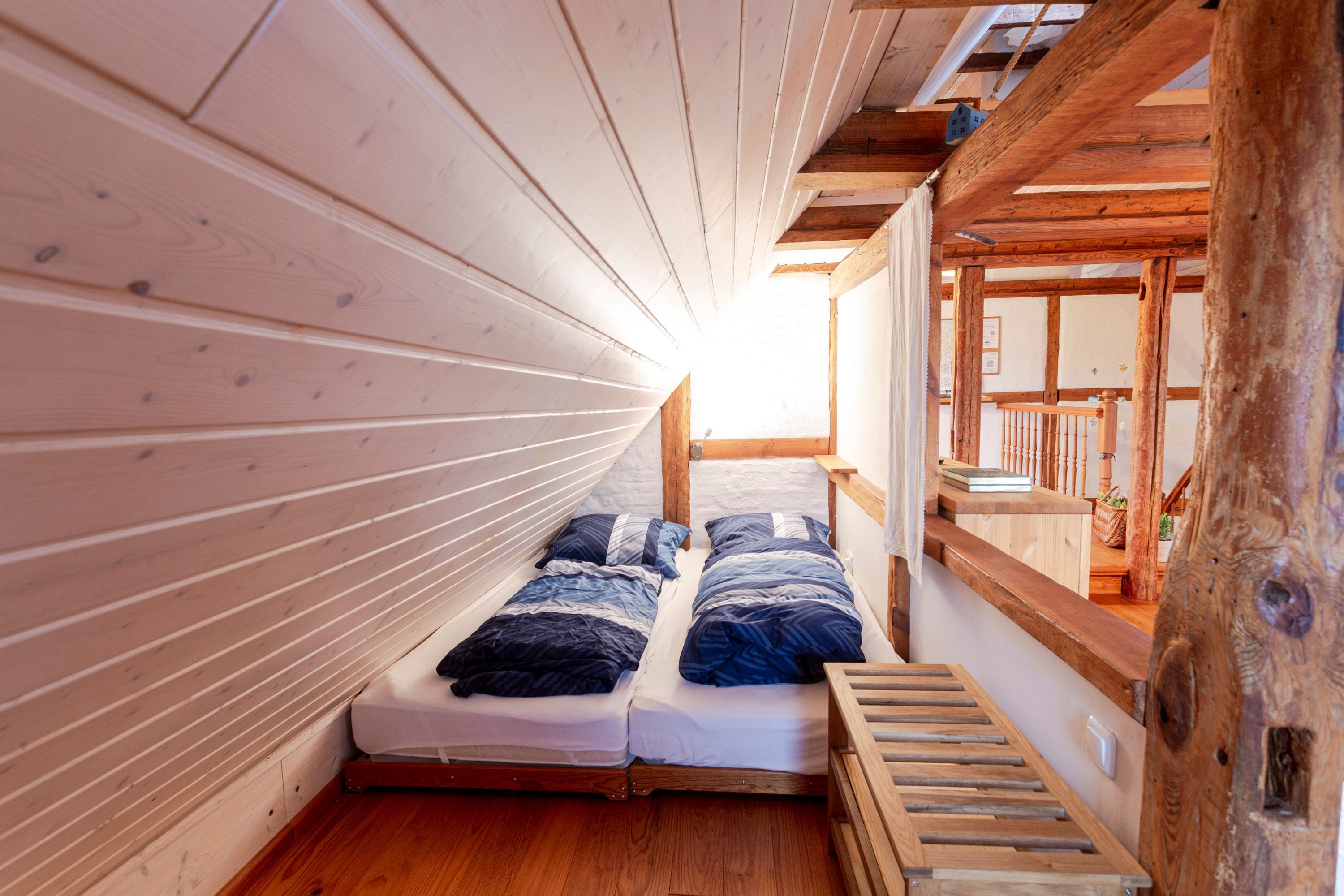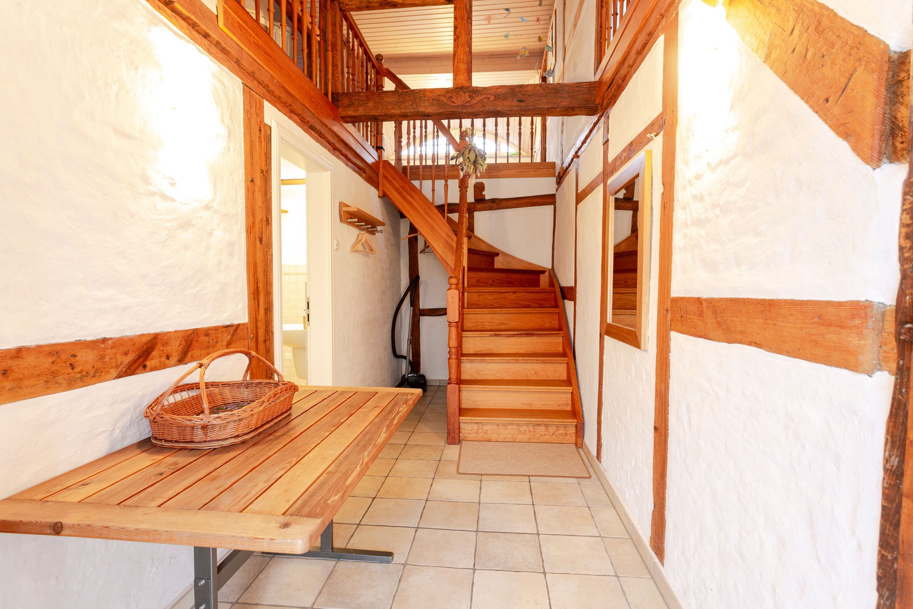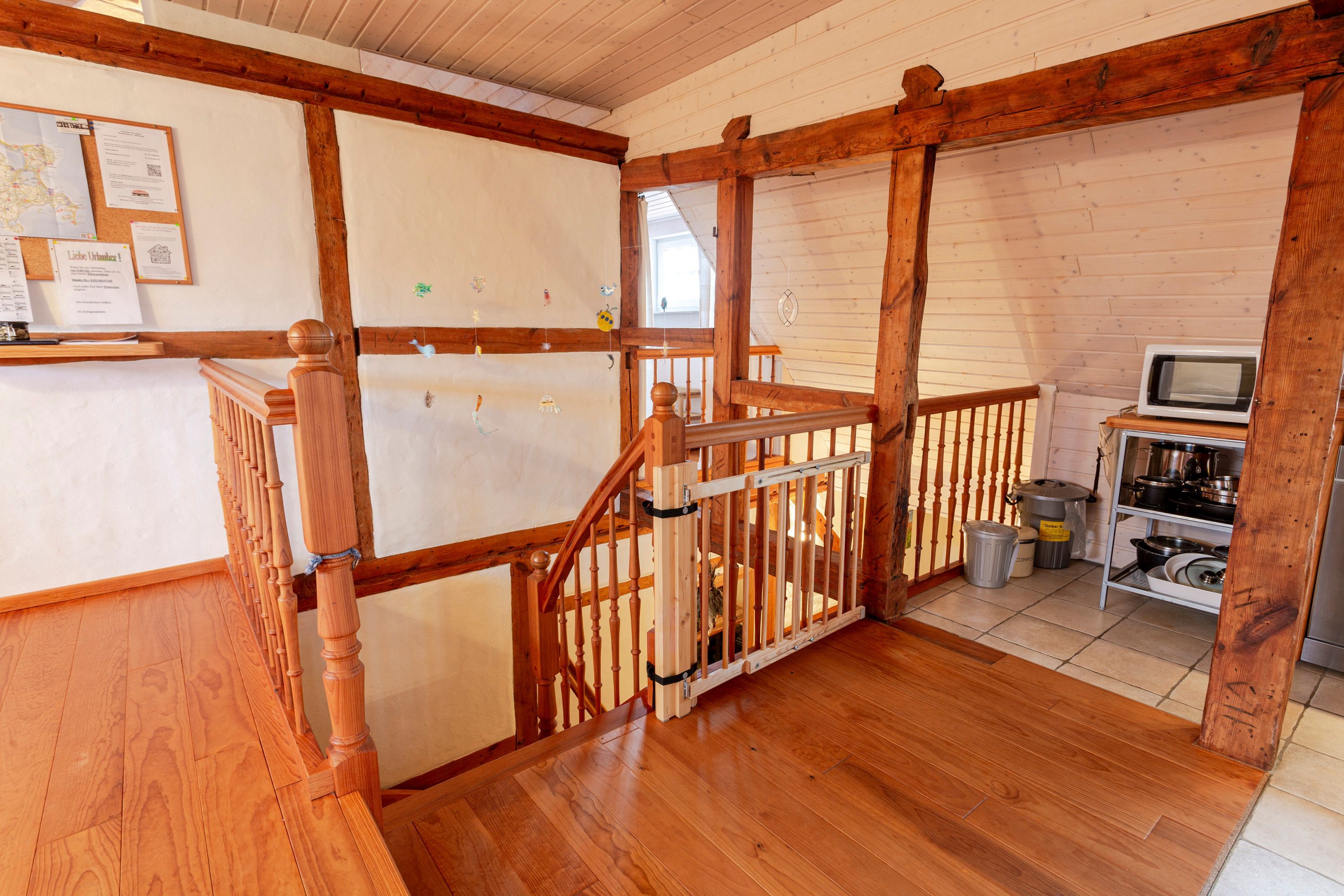 Die Ferienwohnung 2 im Haus Klein Kapelle in Gingst erstreckt sich über zwei Etagen und ist für 6 Personen und ein Baby geeignet. Der Zugang zur Ferienwohnung befindet sich auf dem Hof im Erdgeschoss. Im unteren Bereich ist das erste Bad mit ebenerdiger Dusche, WC und Waschmaschine. Über eine Treppe erreicht man den offenen Wohn-Schlaf-Essbereich. Auf der linke Seite liegen die offene Küche mit Geschirrspüler, Herd, Ofen, Kühlschrank, Toaster, Wasserkocher, Mikrowelle, Kaffemaschine, Milchaufschäumer, Mixer, Pürierstab und Geschirr für den täglichen Bedarf, sowie der Essbereich mit Esstisch und 1 offene Schlafnische mit 2 Matratzen (90x200) auf einem Lattenrost. Das zweite abschließbare Bad mit Badewanne und WC ist vom Essbereich aus erreichbar. Von der Treppe rechts gelegen, befindet sich der große Wohnbereich mit Sofa und TV, sowie 2 Schlafnische mit jeweils 2 Matratzen (90x200) auf einem Lattenrost.