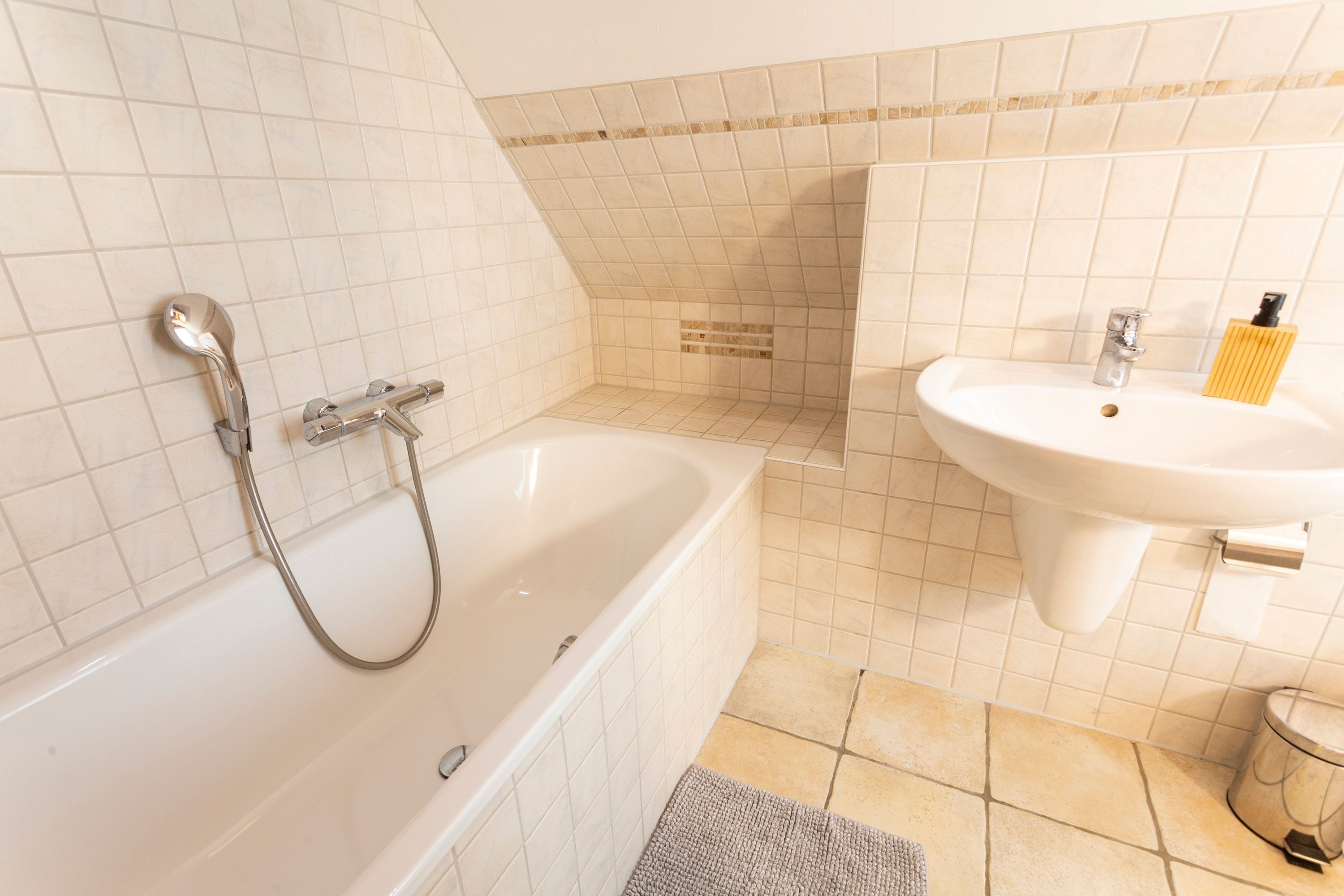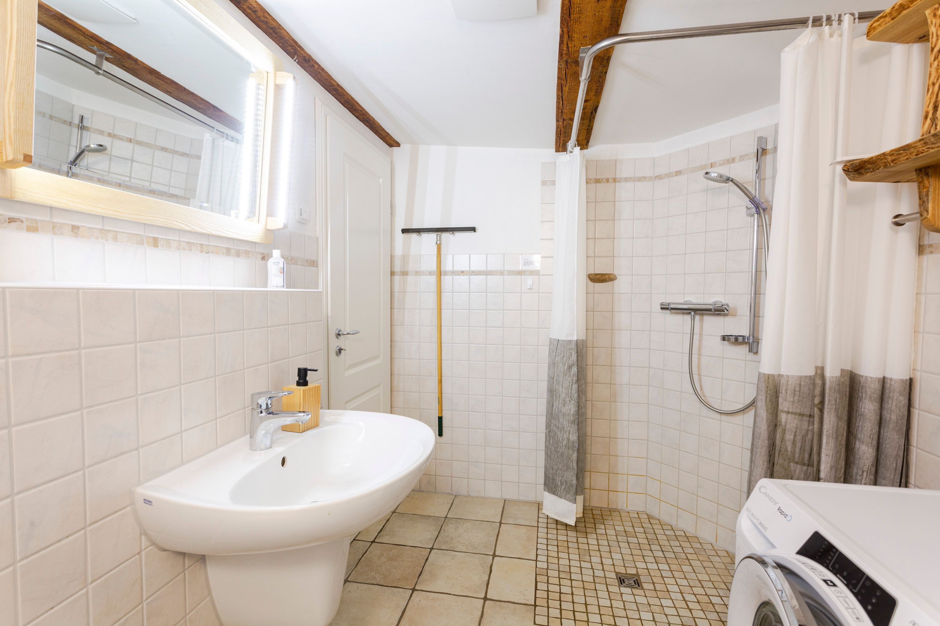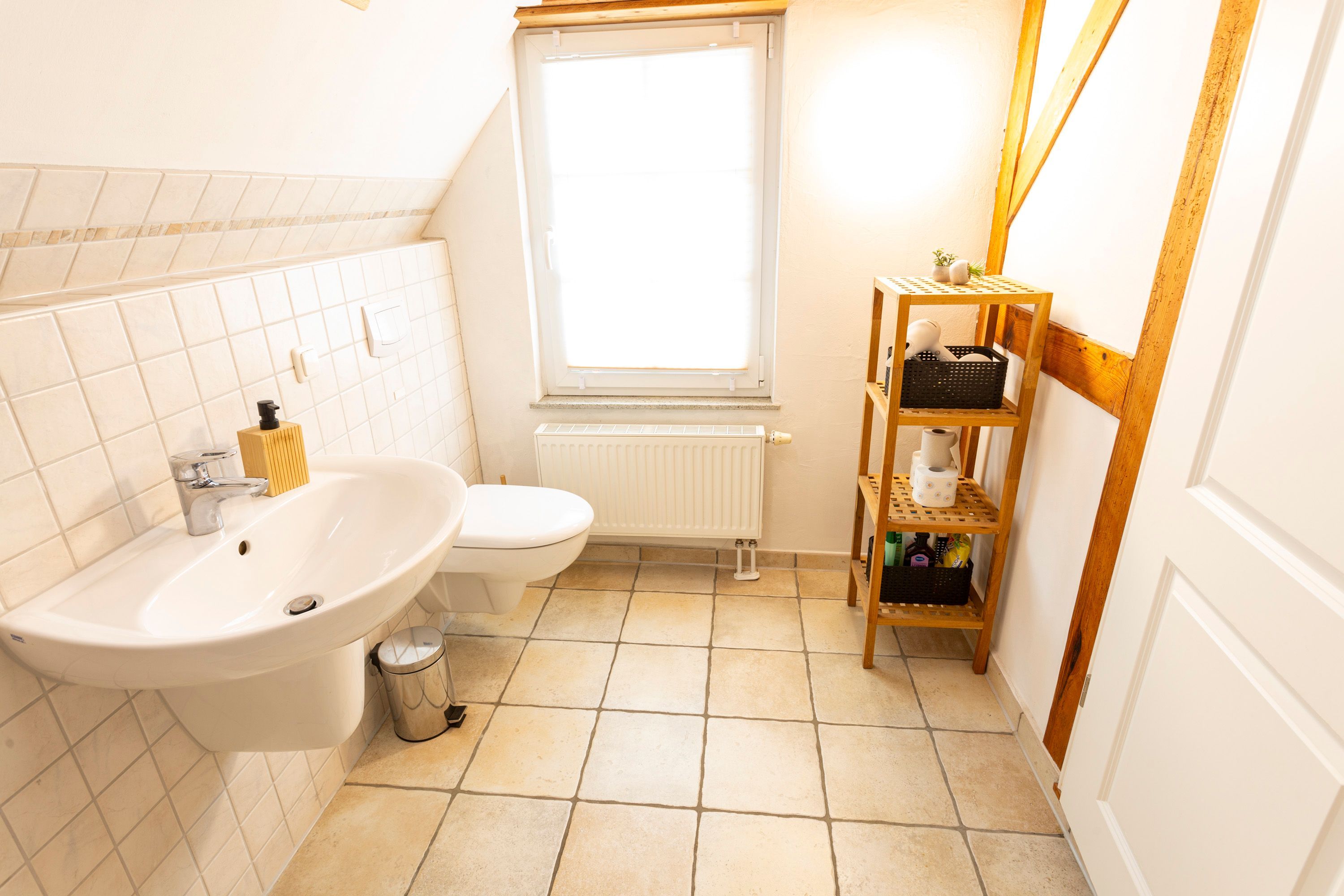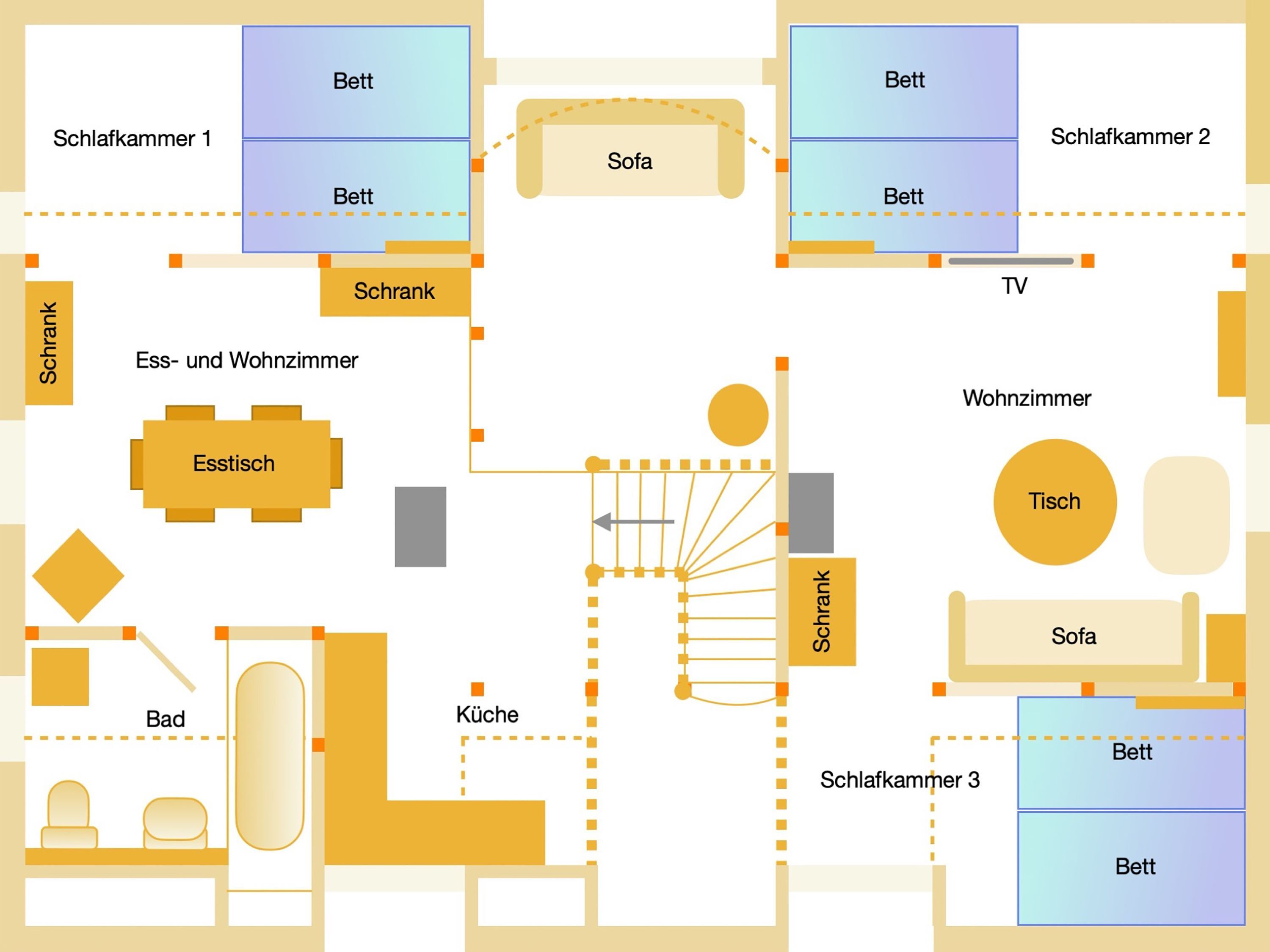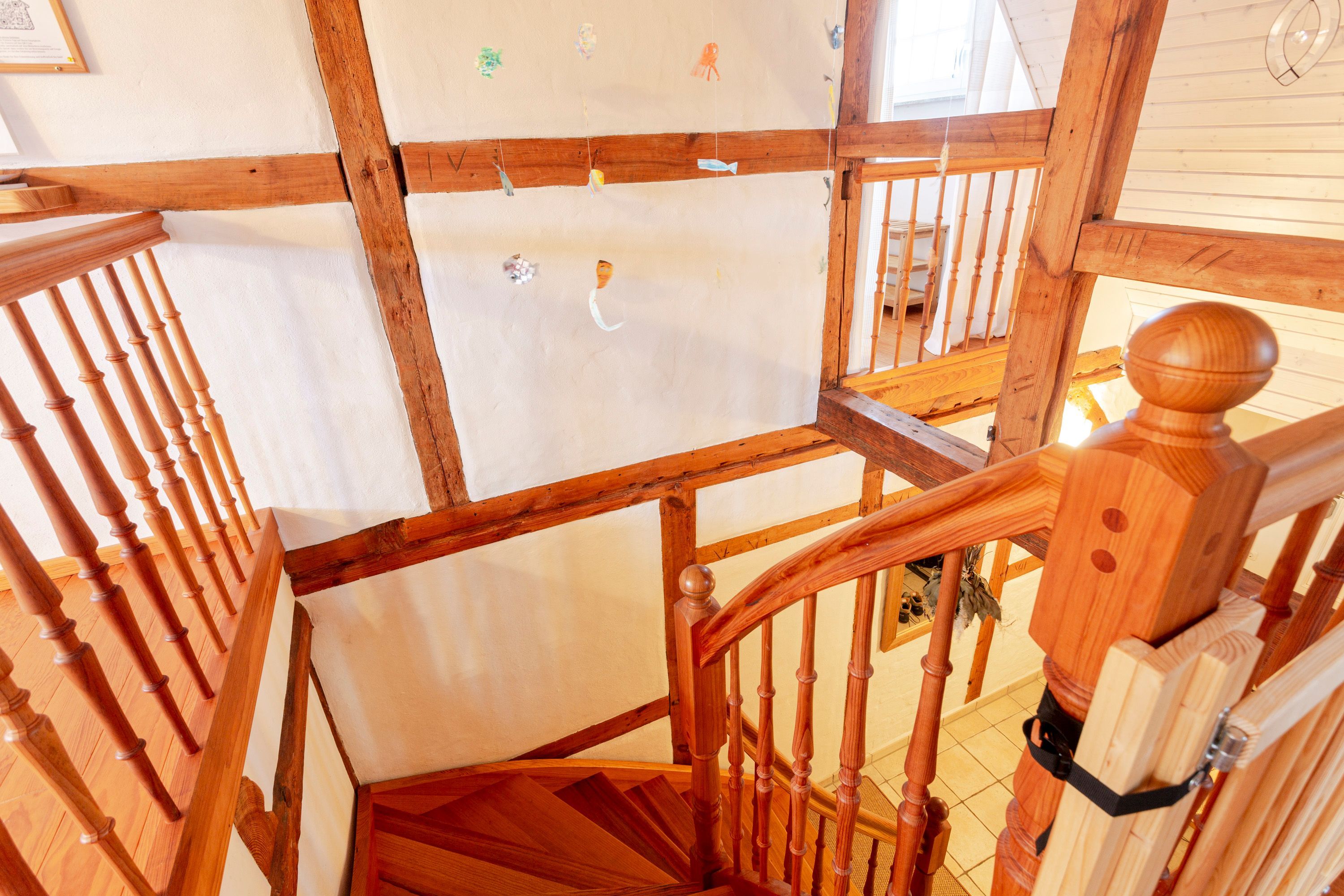 Die Ferienwohnung 2 im Haus Klein Kapelle in Gingst erstreckt sich über zwei Etagen und ist für 6 Personen und ein Baby geeignet. Der Zugang zur Ferienwohnung befindet sich auf dem Hof im Erdgeschoss. Im unteren Bereich ist das erste Bad mit ebenerdiger Dusche, WC und Waschmaschine. Über eine Treppe erreicht man den offenen Wohn-Schlaf-Essbereich. Auf der linke Seite liegen die offene Küche mit Geschirrspüler, Herd, Ofen, Kühlschrank, Toaster, Wasserkocher, Mikrowelle, Kaffemaschine, Milchaufschäumer, Mixer, Pürierstab und Geschirr für den täglichen Bedarf, sowie der Essbereich mit Esstisch und 1 offene Schlafnische mit 2 Matratzen (90x200) auf einem Lattenrost. Das zweite abschließbare Bad mit Badewanne und WC ist vom Essbereich aus erreichbar. Von der Treppe rechts gelegen, befindet sich der große Wohnbereich mit Sofa und TV, sowie 2 Schlafnische mit jeweils 2 Matratzen (90x200) auf einem Lattenrost.