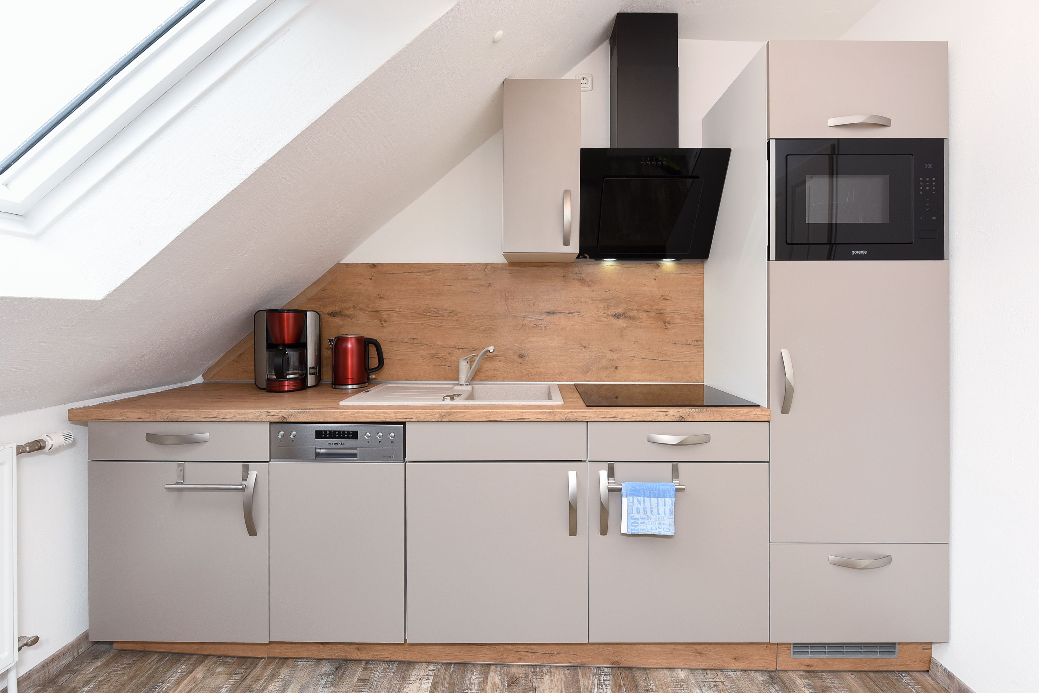 Wohnzimmer mit Schlafmöglichkeit, Küche, Schlafzimmer, Badezimmer mit Dusche, Waschtisch und WC, Obergeschoss, optimal für 2 Personen.