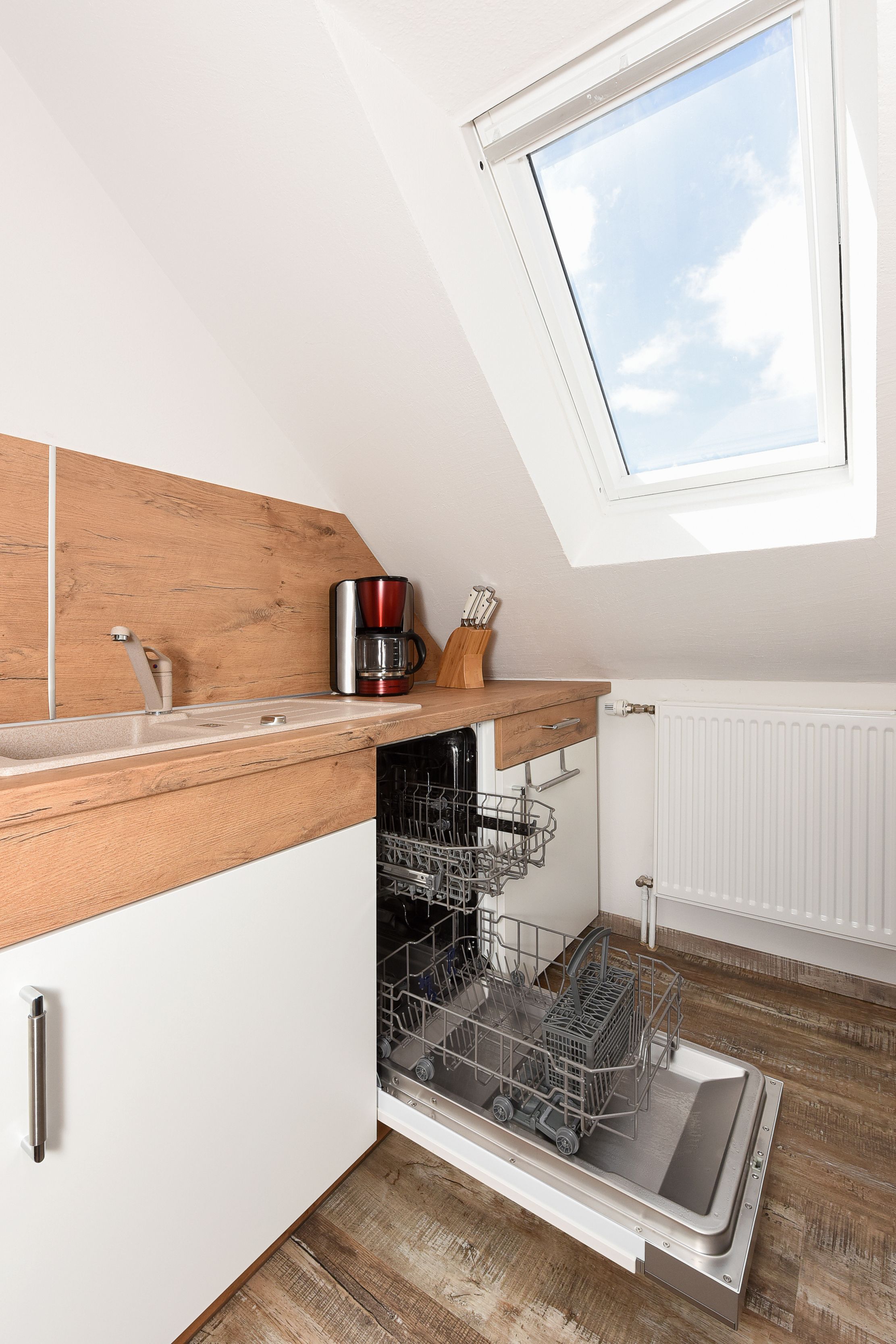Wohnzimmer mit Schlafmöglichkeit, Küche, Schlafzimmer, Badezimmer mit Dusche, Waschtisch und WC, Obergeschoss, optimal für 2 bis 4 Personen und zusätzlich ein Kleinkind.