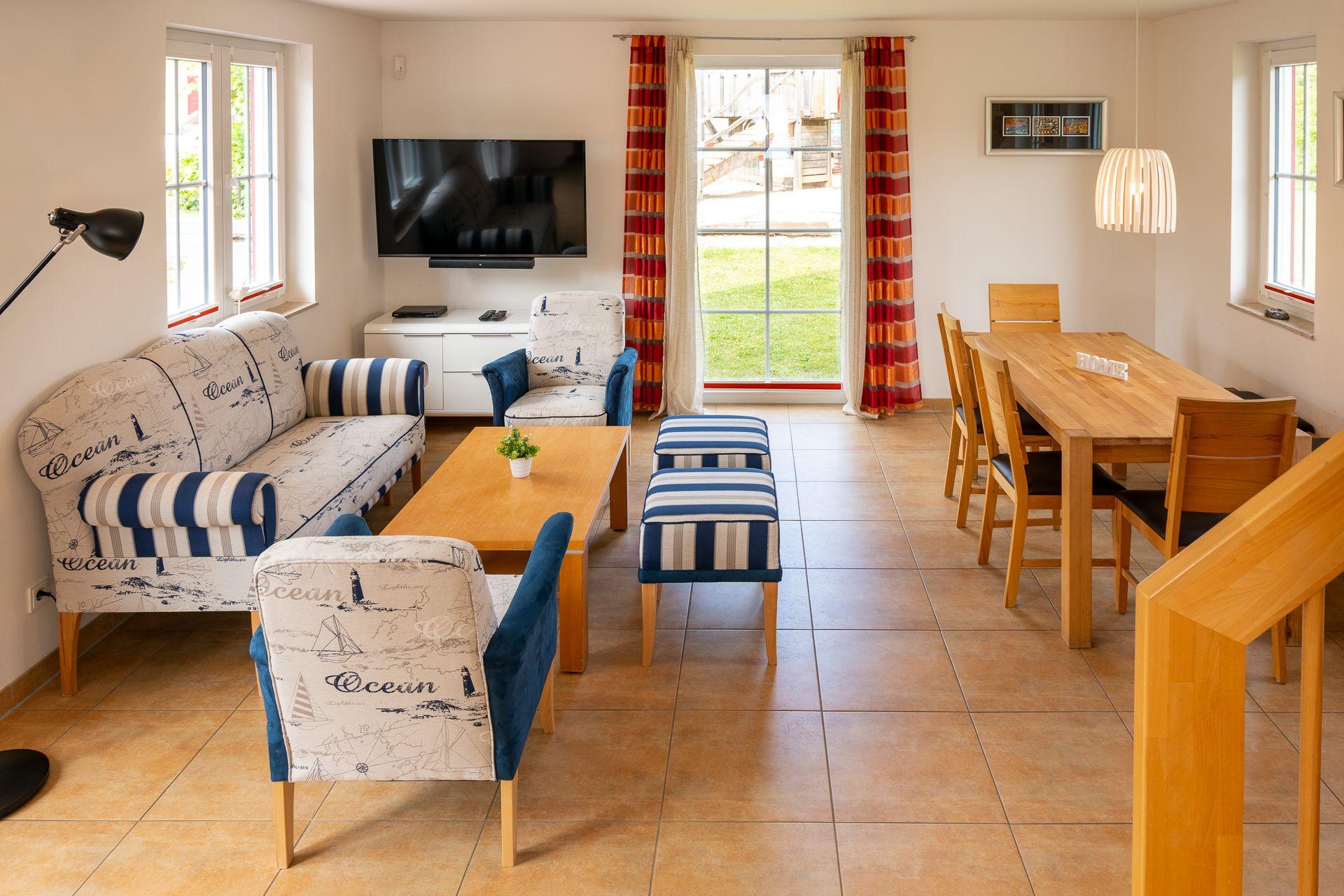 Die Innenräume des Hauses zeichnen sich durch eine durchdachte Gestaltung und komfortable Extras aus, einschließlich Fußbodenheizung, die in allen Bereichen für eine angenehme Atmosphäre sorgt. Zwei gemütliche Schlafzimmer und ebenso zwei voll ausgestattete Bäder versprechen Komfort und Privatsphäre. Für Unterhaltung an gemütlichen Abenden sorgen ein Flachbild-TV mit Soundbar und Radio. Die Waschmaschine zur alleinigen Nutzung macht auch längere Aufenthalte problemlos möglich.
