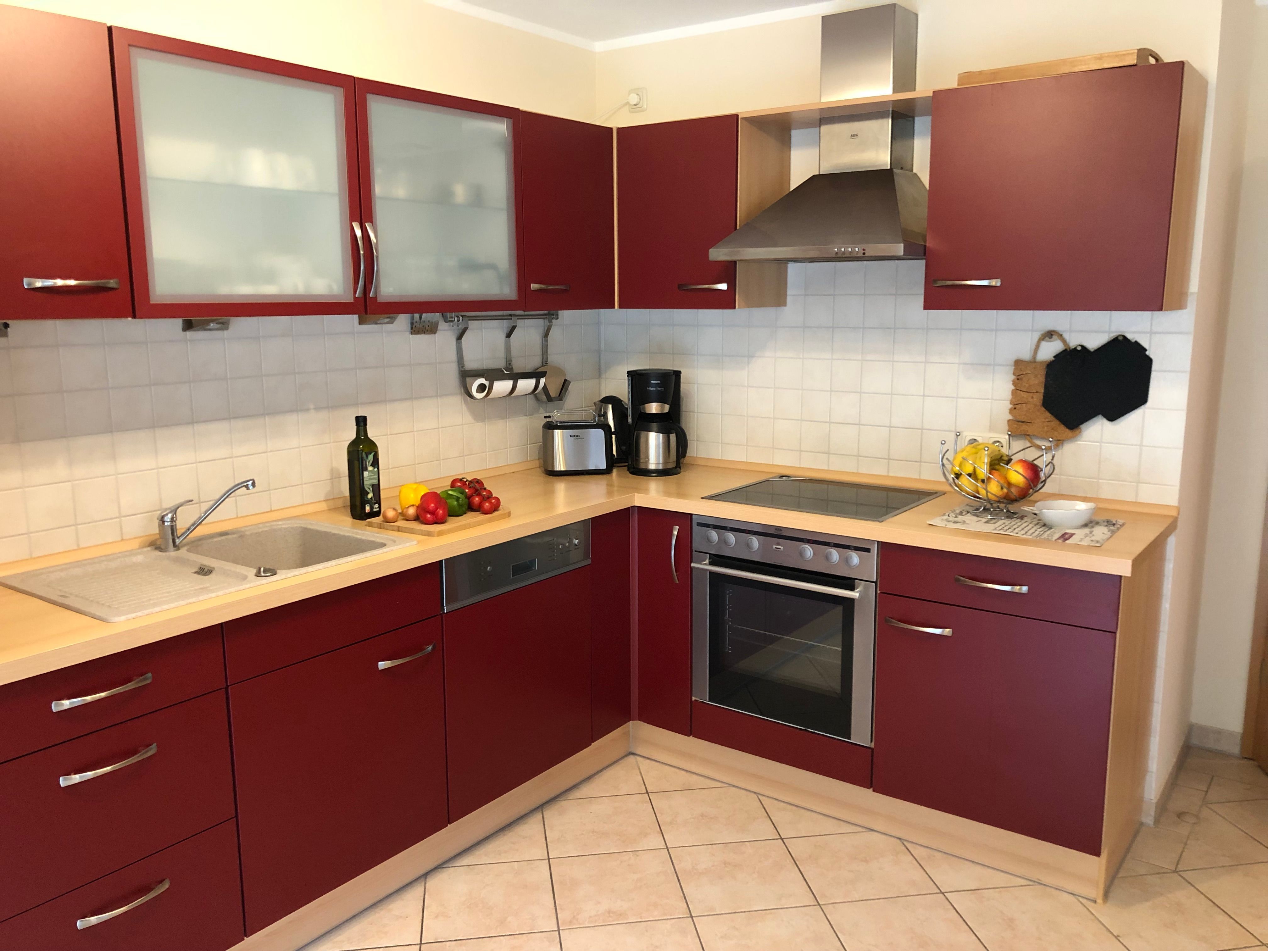 Herd, Backofen, Kühlschrank, mit Tiefkühlfach, Geschirrspülmaschine, Mikrowelle, Kaffeemaschine, Toaster, Wasserkocher