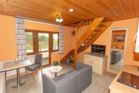 Die Ferienwohnungen mit Balkon sind auf zwei Ebenen gebaut. Im unteren Teil ist der Wohnraum mit Küche, Dusche und WC und ein großer Südbalkon. Eine Wendeltreppe führt zum Schlafzimmer. Von allen vier Wohnungen können Sie einen herrlichen Sonnenaufgang genießen.