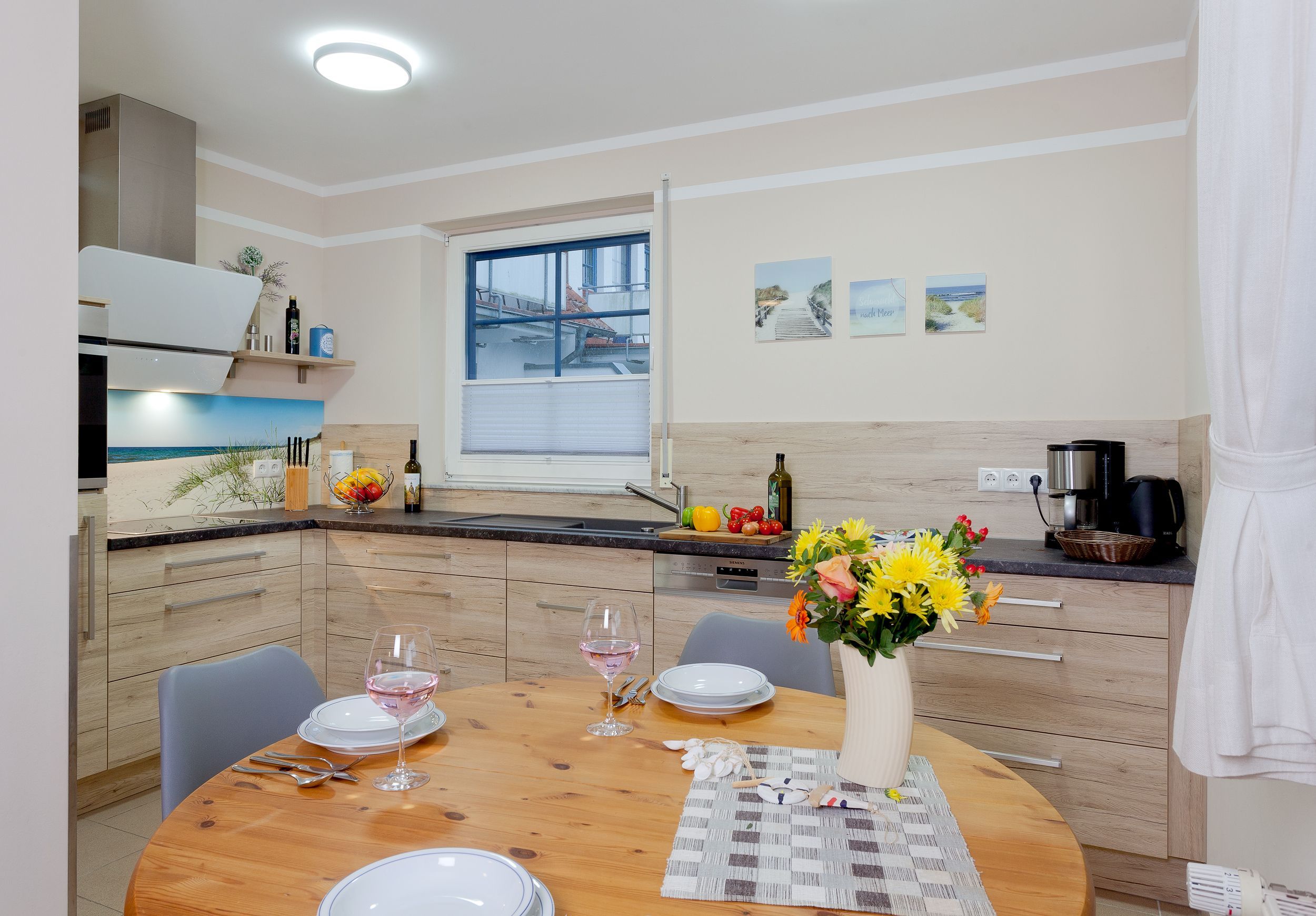 • Küchenzeile: Herd, Backofen, Kühlschrank, mit Tiefkühlfach, Geschirrspülmaschine, Kaffeemaschine, Toaster, Wasserkocher