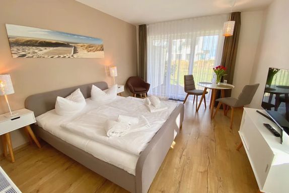 Das ca. 21-26 qm große Ferienstudio STANDARD befindet sich im Erdgeschoss oder Obergeschoss und bietet einen Blick auf den Jachthafen oder auf die Zicker Berge. Die Wohnung eignet sich für 1-2 Personen.