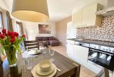 • Komplett ausgestattete Küchenzeile mit Geschirrspüler, Ceranfeld mit vier Platten, Backofen, Kühlschrank mit Gefrierfach und vielen Küchenutensilien