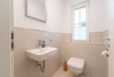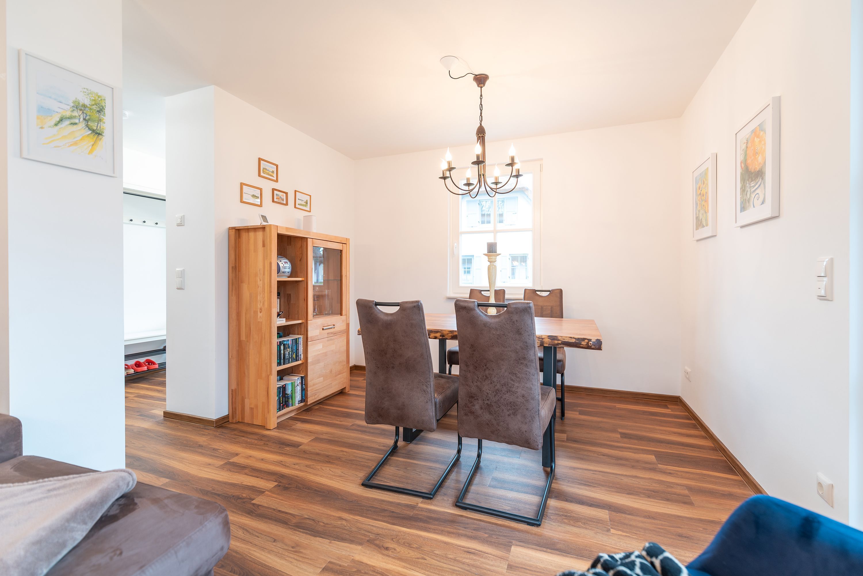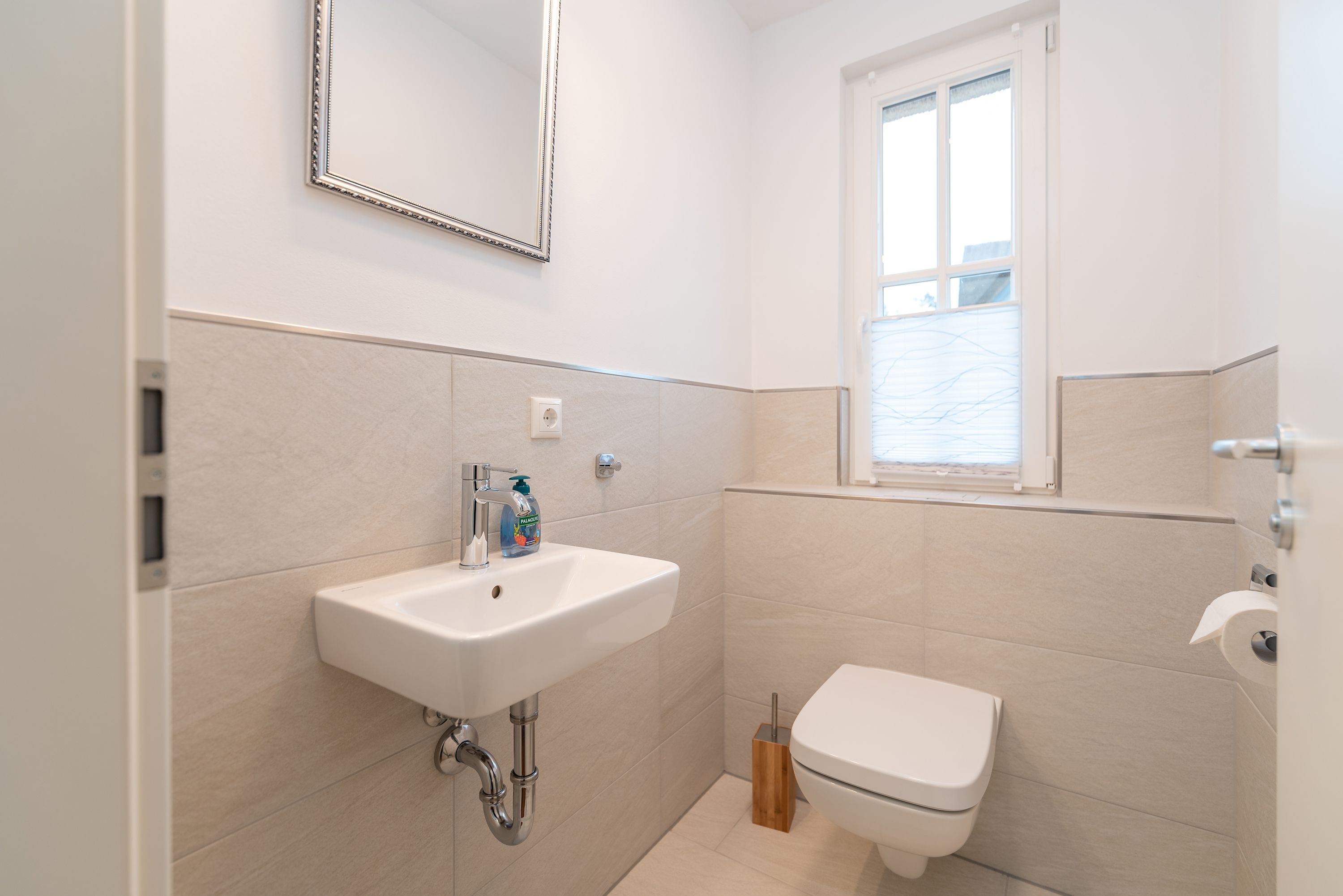 Auf 79 Quadratmetern Wohnfläche bietet das Ferienhaus ausreichend Raum für bis zu vier Personen und ein Kleinkind, inklusive der Möglichkeit, ein Kinderreisebett und einen Hochstuhl hinzuzubuchen. Das Erdgeschoss umfasst einen einladenden Wohnbereich mit gemütlicher Couchecke, Flatscreen-TV und einem Essbereich für gemeinsame Mahlzeiten oder Spieleabende. Eine gut sortierte Bücherecke und eine voll ausgestattete moderne Küche mit Geschirrspüler, Kaffeemaschinen, Toaster, Mikrowelle und Wasserkocher stehen ebenfalls zur Verfügung, neben einem Gäste-WC und einer Waschmaschine für zusätzlichen Komfort.