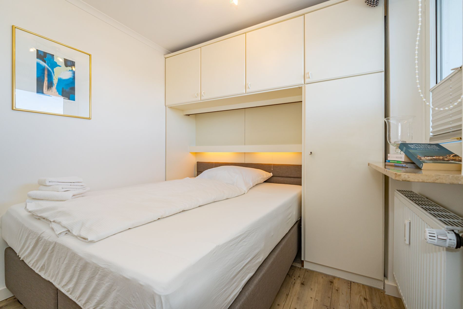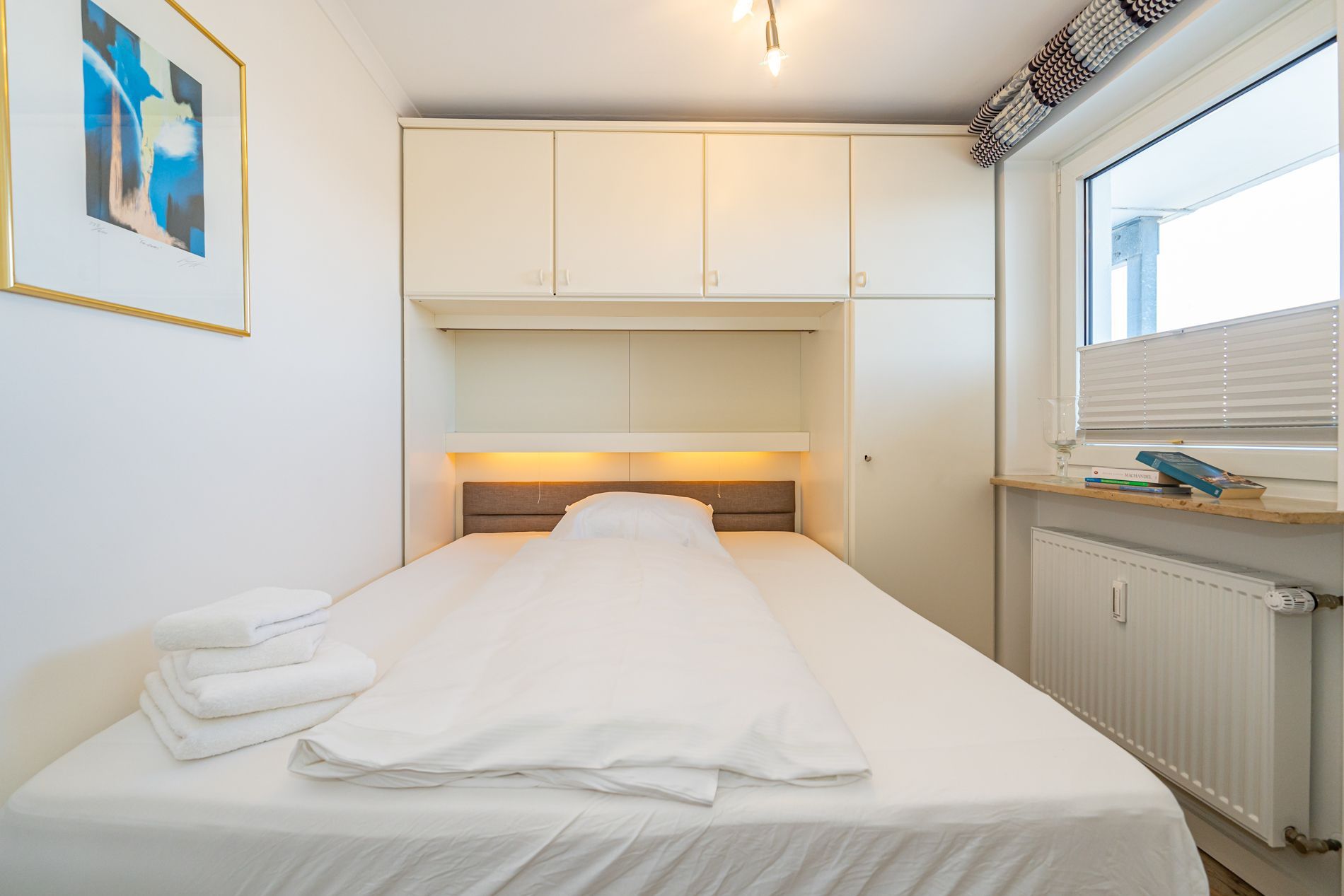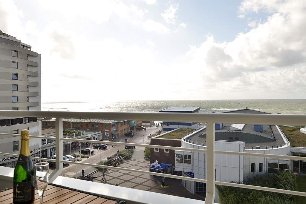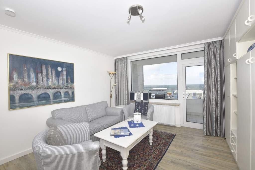Kleine 2-Zimmer-Nichtraucher-Ferienwohnung, ca. 36 qm in der 6. Etage mit Meerblick und Westloggia (Seeseite, mit Balkonmöbeln und Auflagen) für max. 2 Personen.