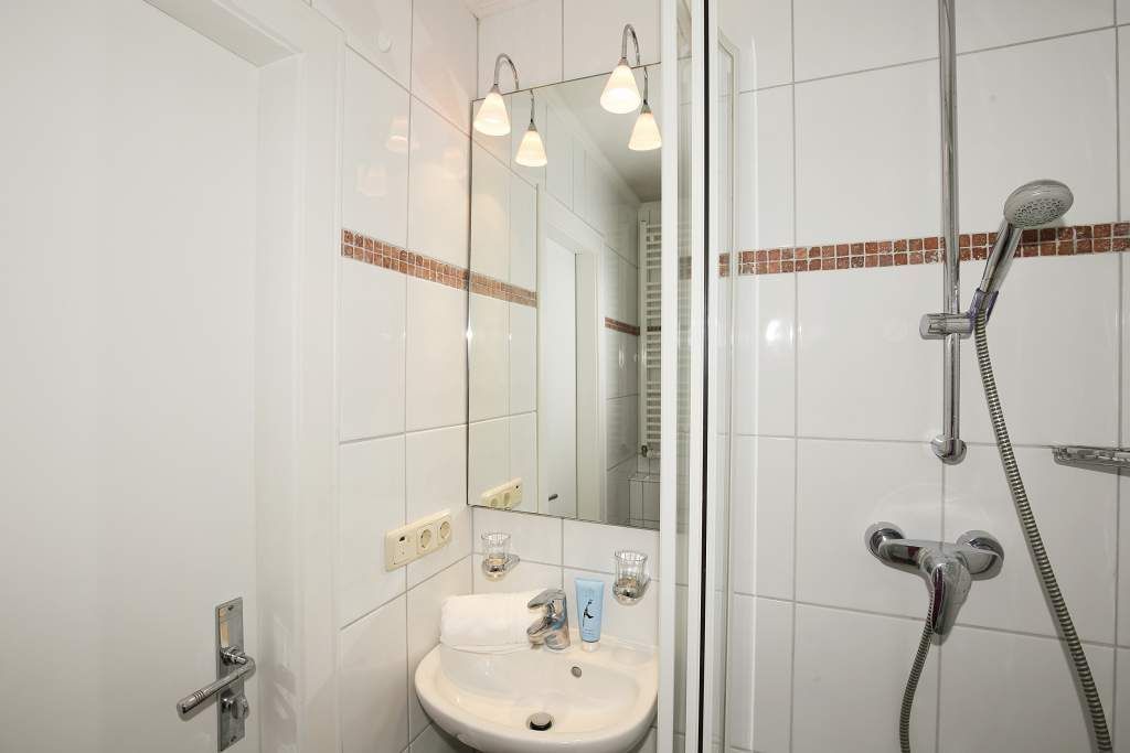 Im Bad befinden sich eine Dusche, ein WC, einen Waschtisch und ein Handtuchtrockner.