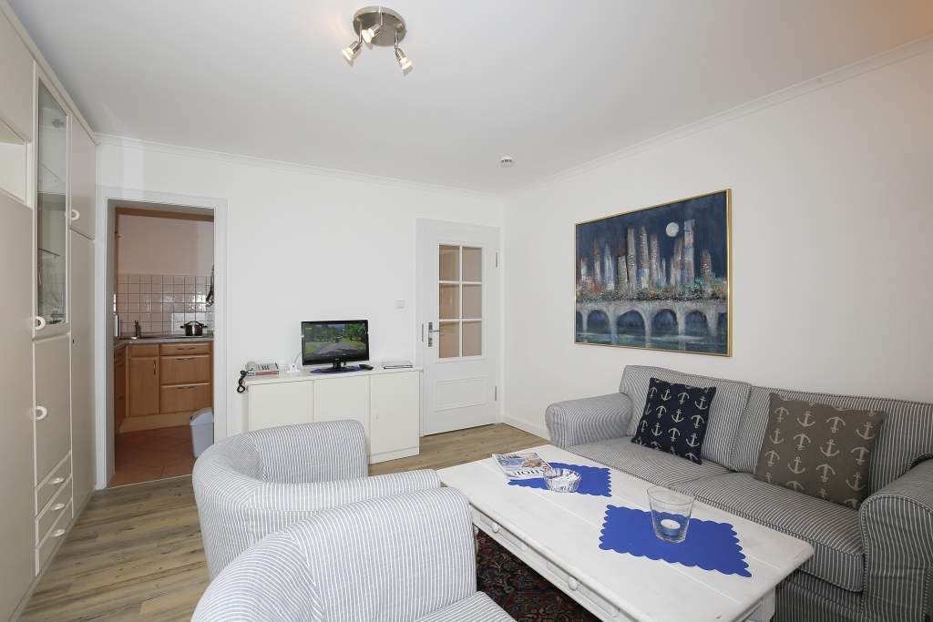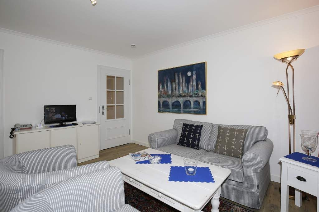 Der Wohnraum besteht aus einer Sitzgarnitur (2-Sitzer-Couch, 2 Sessel), Couchtisch (der gleichzeitig Esstisch ist), einem Sat-TV und Radio, W-LAN vorhanden