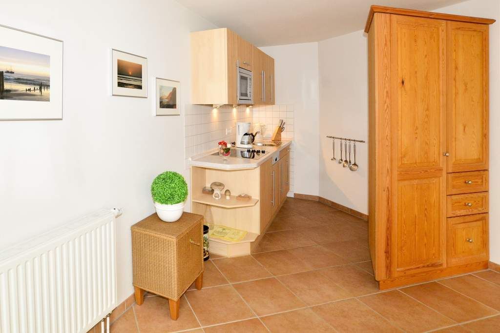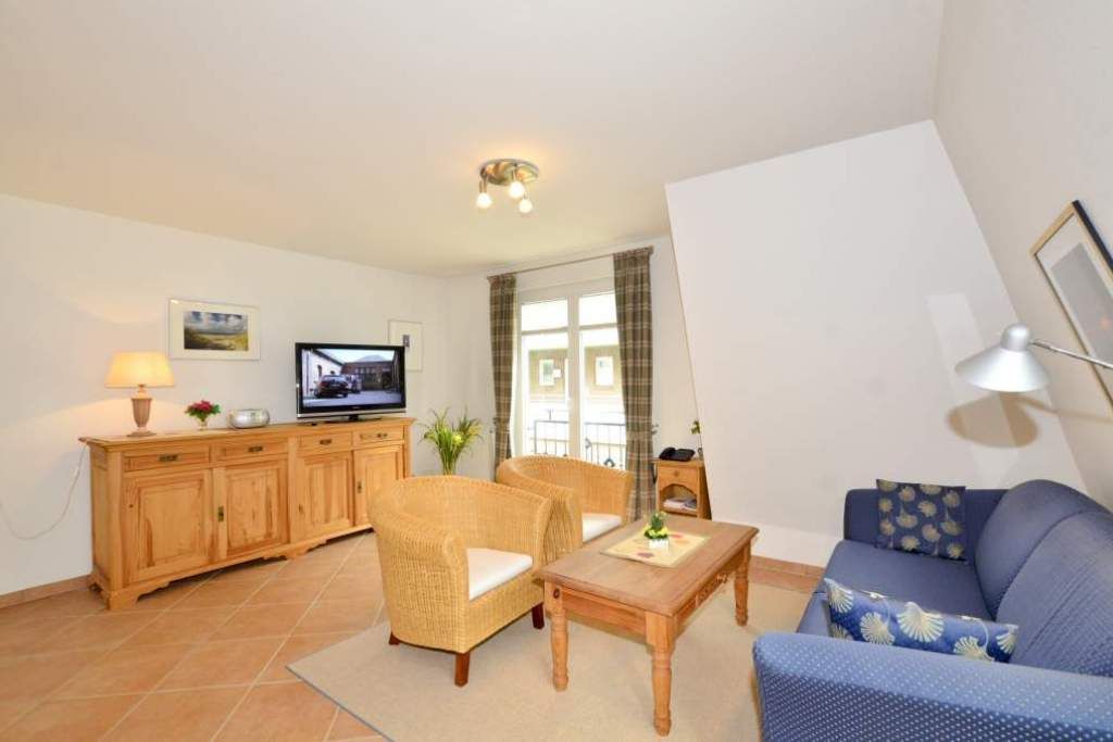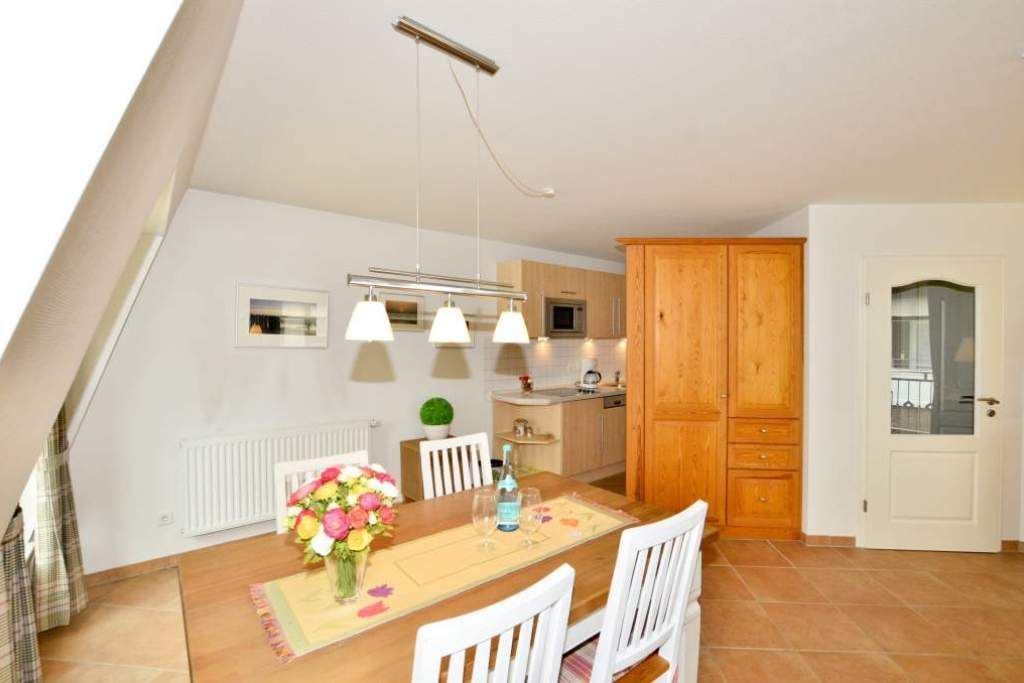 Der Wohnraum ist mit einer hochwertigen Couchgarnitur, einem separaten Essplatz, großem Flatscreen-TV, Internetradio, Telefon mit Internet- und Telefonflatrate sowie offener Einbauküche ausgestattet. Die moderne Einbauküche besitzt neben Geschirrspüler, Mikrowelle mit Grillfunktion, Nespressomaschine und Ceranfeld mit 4 Kochfeldern einen Kühlschrank mit 3-Sterne-Gefrierfach. Kaffeemaschine, Wasserkocher und Toaster gehören zum Grundstandard.