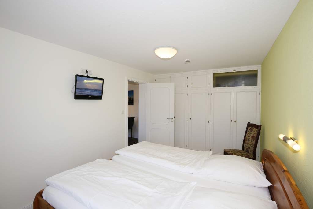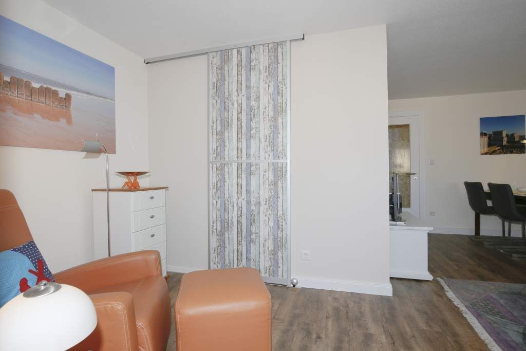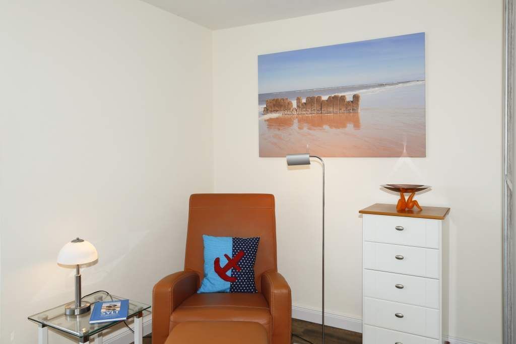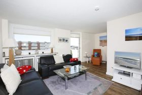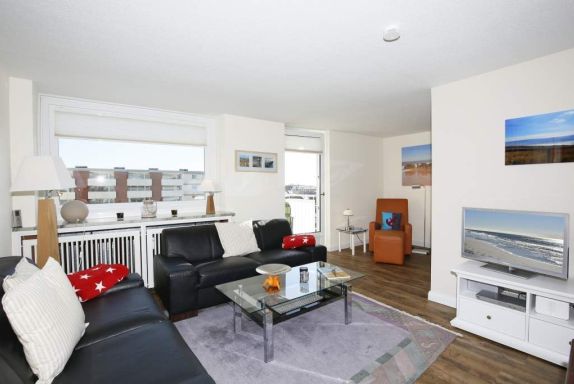 Die Ferienwohnung befindet sich in Ostlage in der 5. Etage. Sie verfügt über einen großzügigen Wohnraum mit Sitz- und Essplatz, Flat-TV, Blu-Ray-Player, HiFi-Anlage, W-Lan und Leseecke, ein geräumiges Schlafzimmer mit Doppelbett, Flachbildfernseher, Einbauschrank und Zimmersafe. Zusätzlich ist eine abgeschlossene Schlafnische mit zwei Einzelbetten vorhanden. Neue Küche mit Geschirrspüler, Mikrowelle, Backofen, Kaffeemaschine, Wasserkocher, Toaster und Nespresso-Maschine gehören zur Grundausstattung. Badezimmer mit Dusche und WC. Zur Ferienwohnung gehören zwei Balkone mit Morgensonne und Panoramablick über Westerland. Kinderreisebett und Hochstuhl sind in dieser Ferienwohnung inkl.. Das Mitbringen von Haustieren ist nicht gestattet.