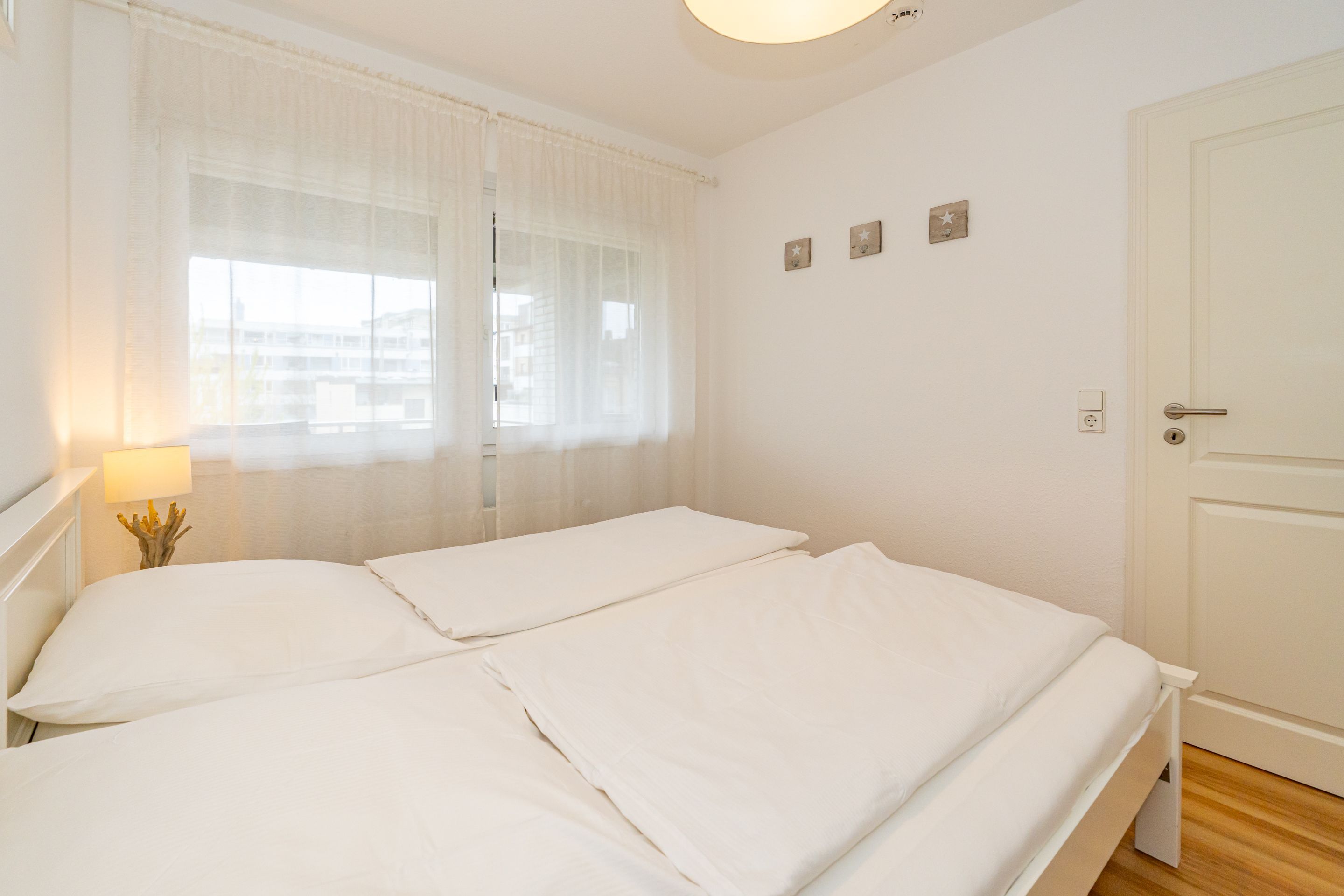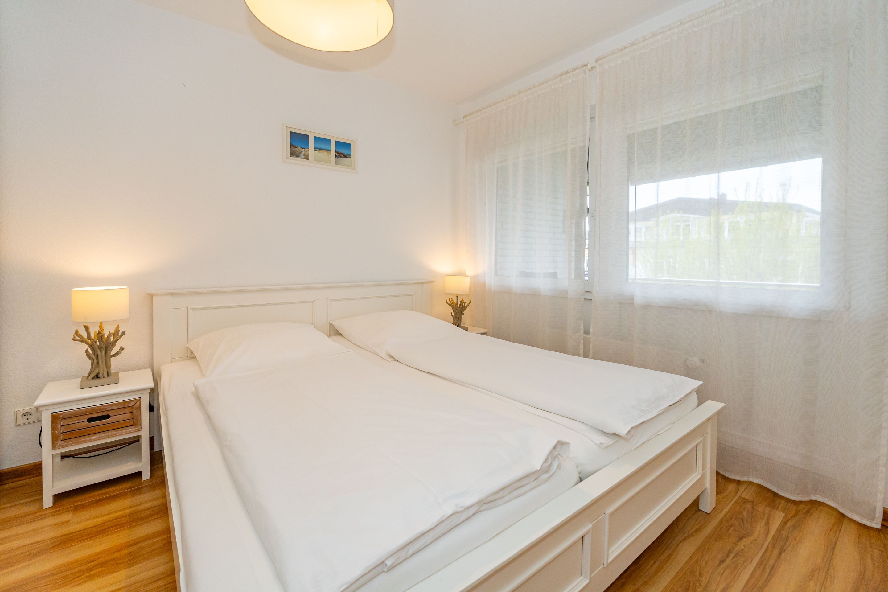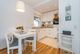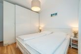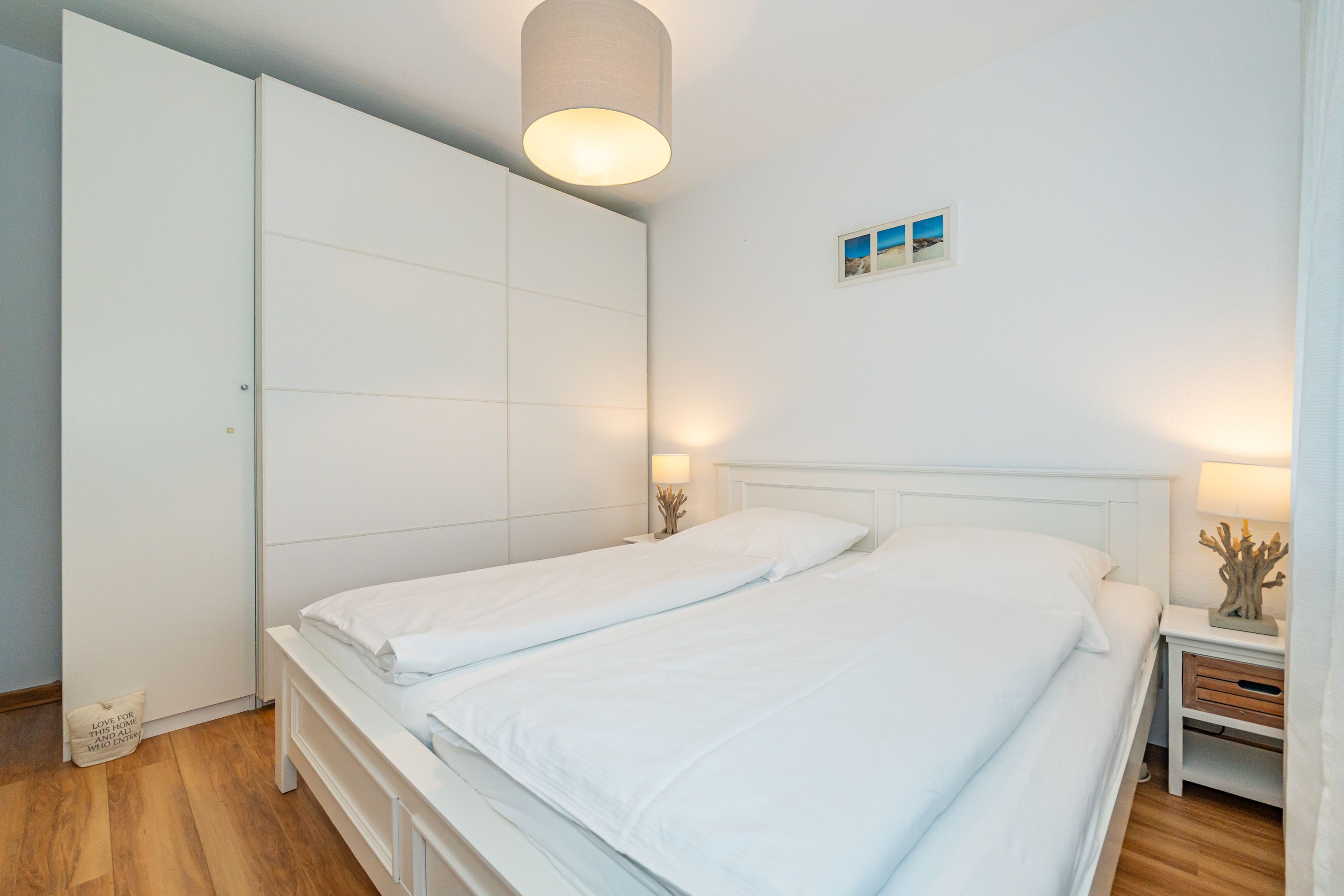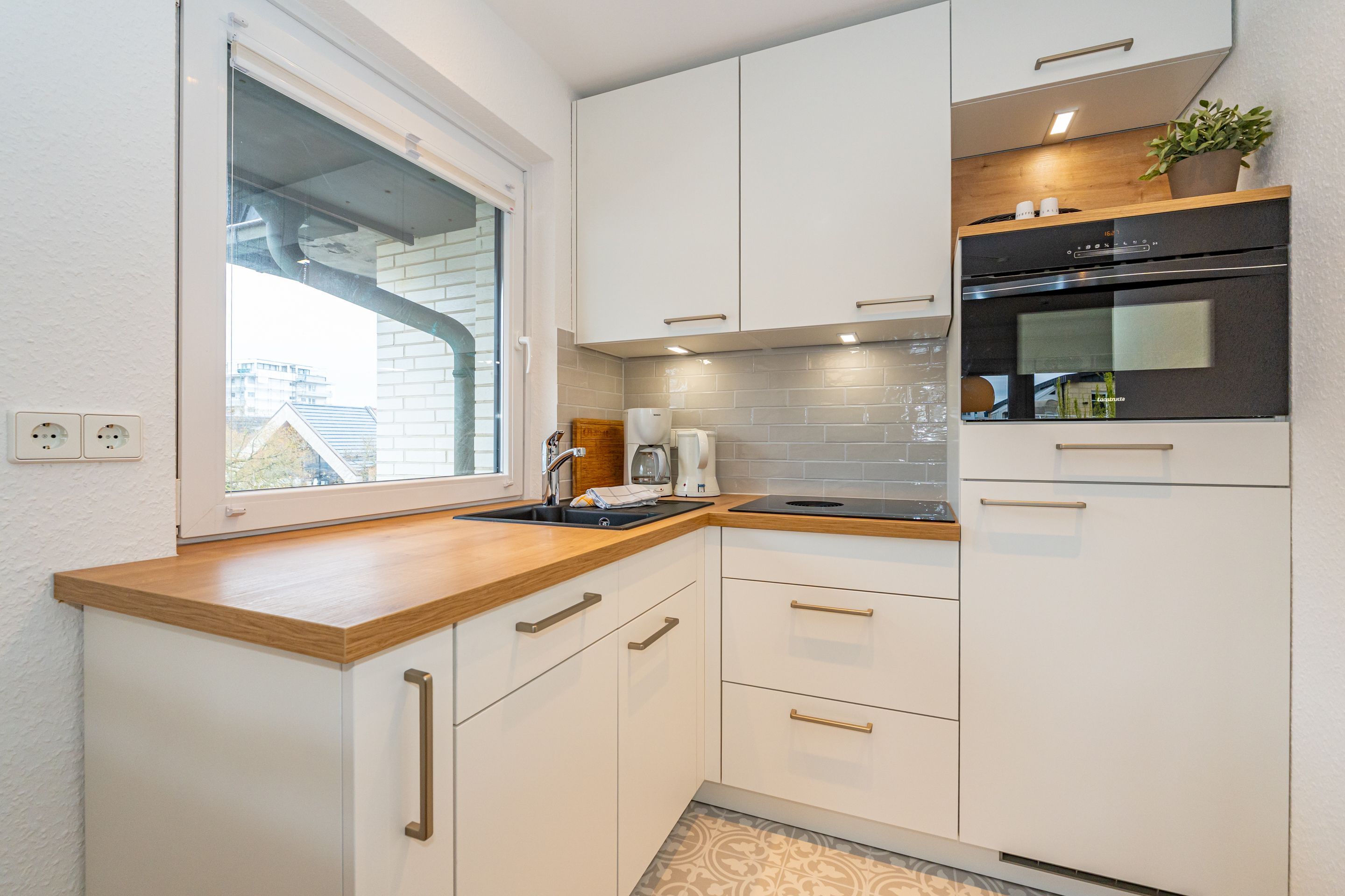 Das separate Schlafzimmer ist mit einem wertigen Doppelbett (1,80 x 2,00 m, Einzelmatratzen) und einem Kleiderschrank ausgestattet. Die neue, offen integrierte Küchenzeile bietet einen Induktionsherd mit integriertem Kochfeldabzug, Kompaktbackofen mit Mikrowelle, Geschirrspülmaschine und einen Kühlschrank mit 3-Sterne-Gefrierfach. Kaffeemaschine, Wasserkocher und Toaster gehören zur Grundausstattung. Das helle Duschbad ist ausgestattet mit Dusche, Waschtisch und WC funktional und gepflegt.