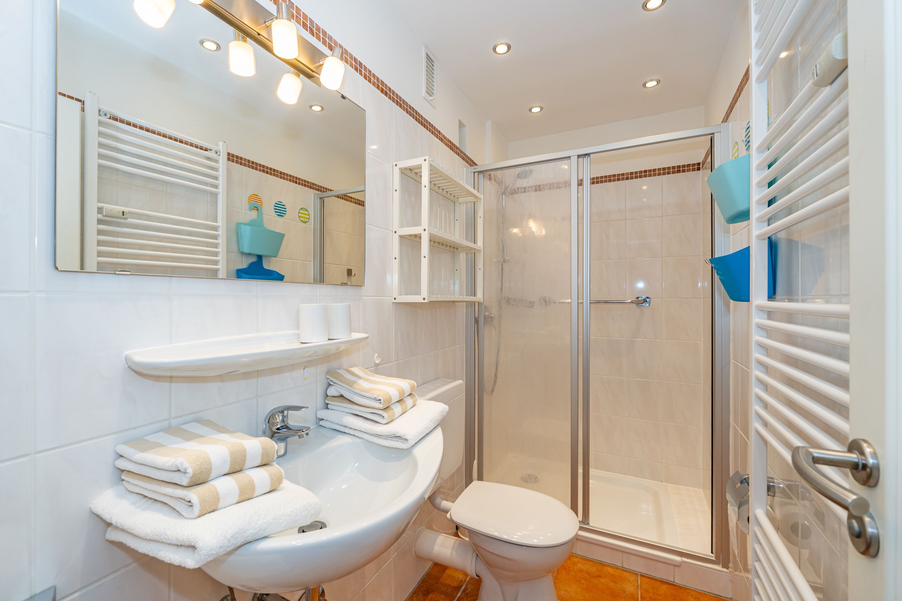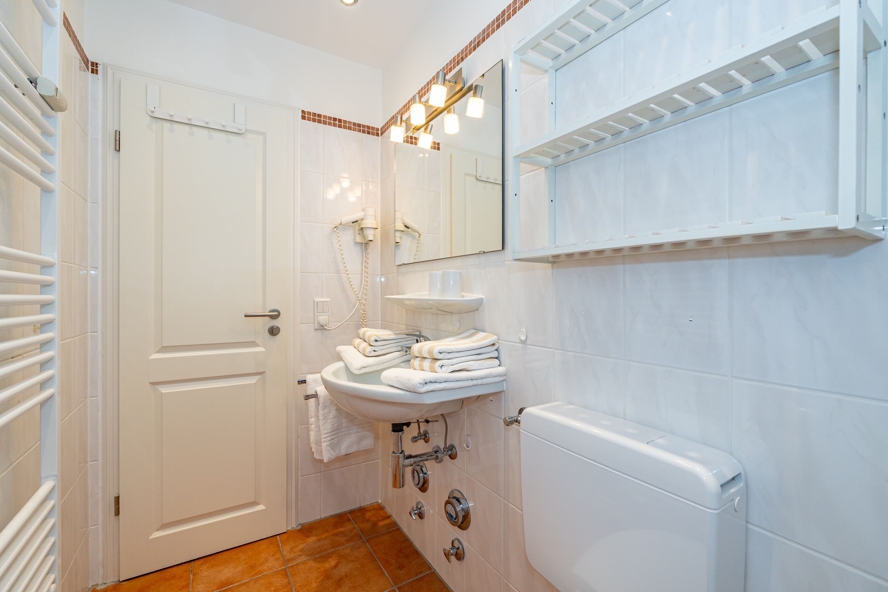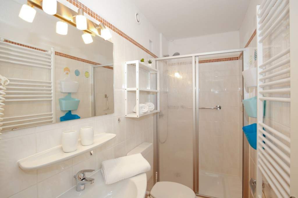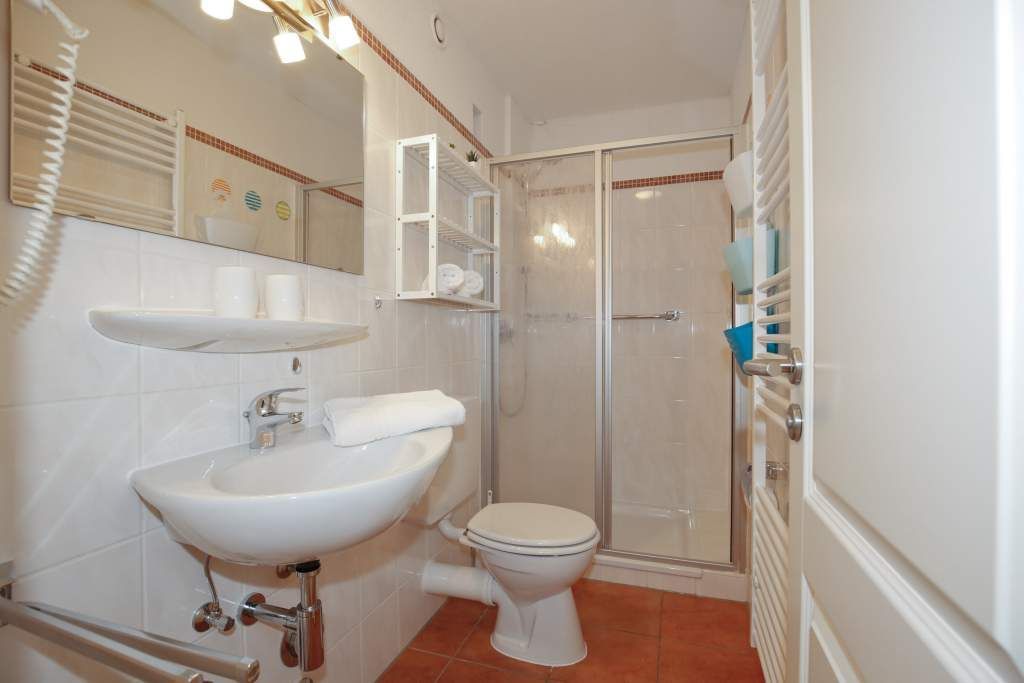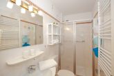 Das separate Schlafzimmer ist mit einem wertigen Doppelbett (1,80 x 2,00 m, Einzelmatratzen) und einem Kleiderschrank ausgestattet. Die neue, offen integrierte Küchenzeile bietet einen Induktionsherd mit integriertem Kochfeldabzug, Kompaktbackofen mit Mikrowelle, Geschirrspülmaschine und einen Kühlschrank mit 3-Sterne-Gefrierfach. Kaffeemaschine, Wasserkocher und Toaster gehören zur Grundausstattung. Das helle Duschbad ist ausgestattet mit Dusche, Waschtisch und WC funktional und gepflegt.