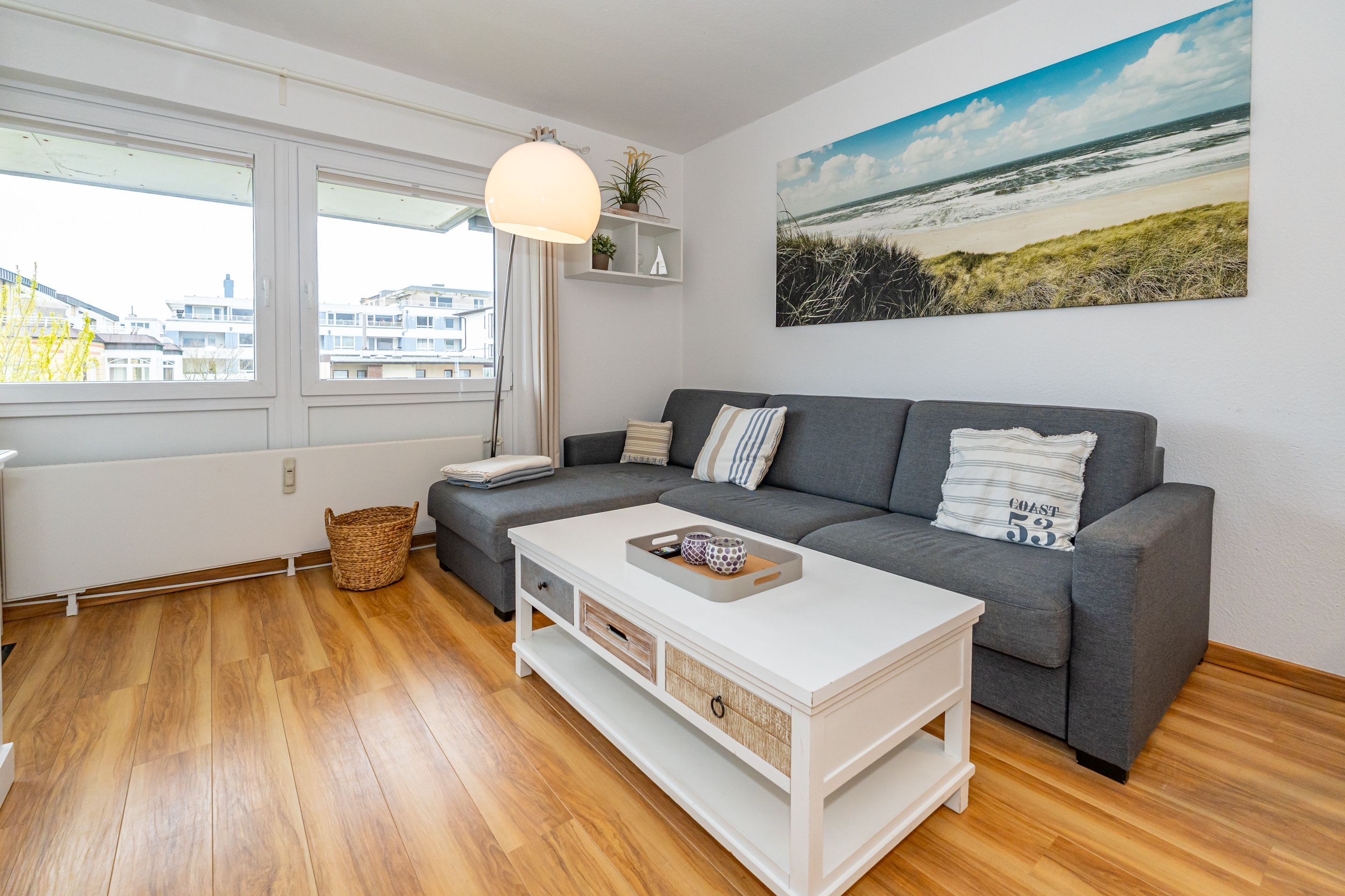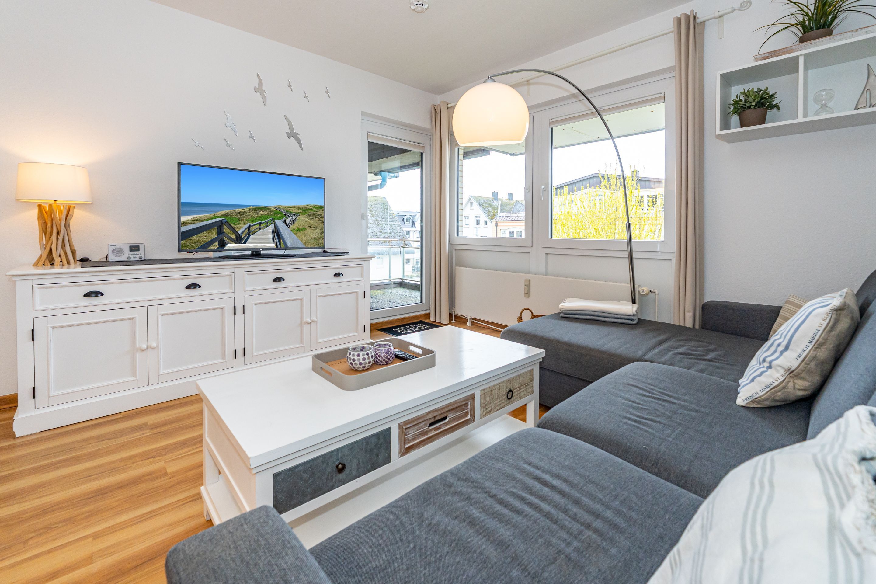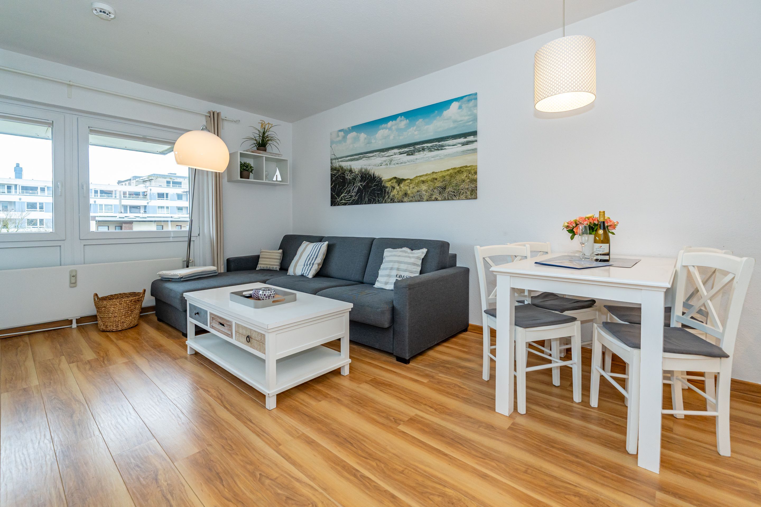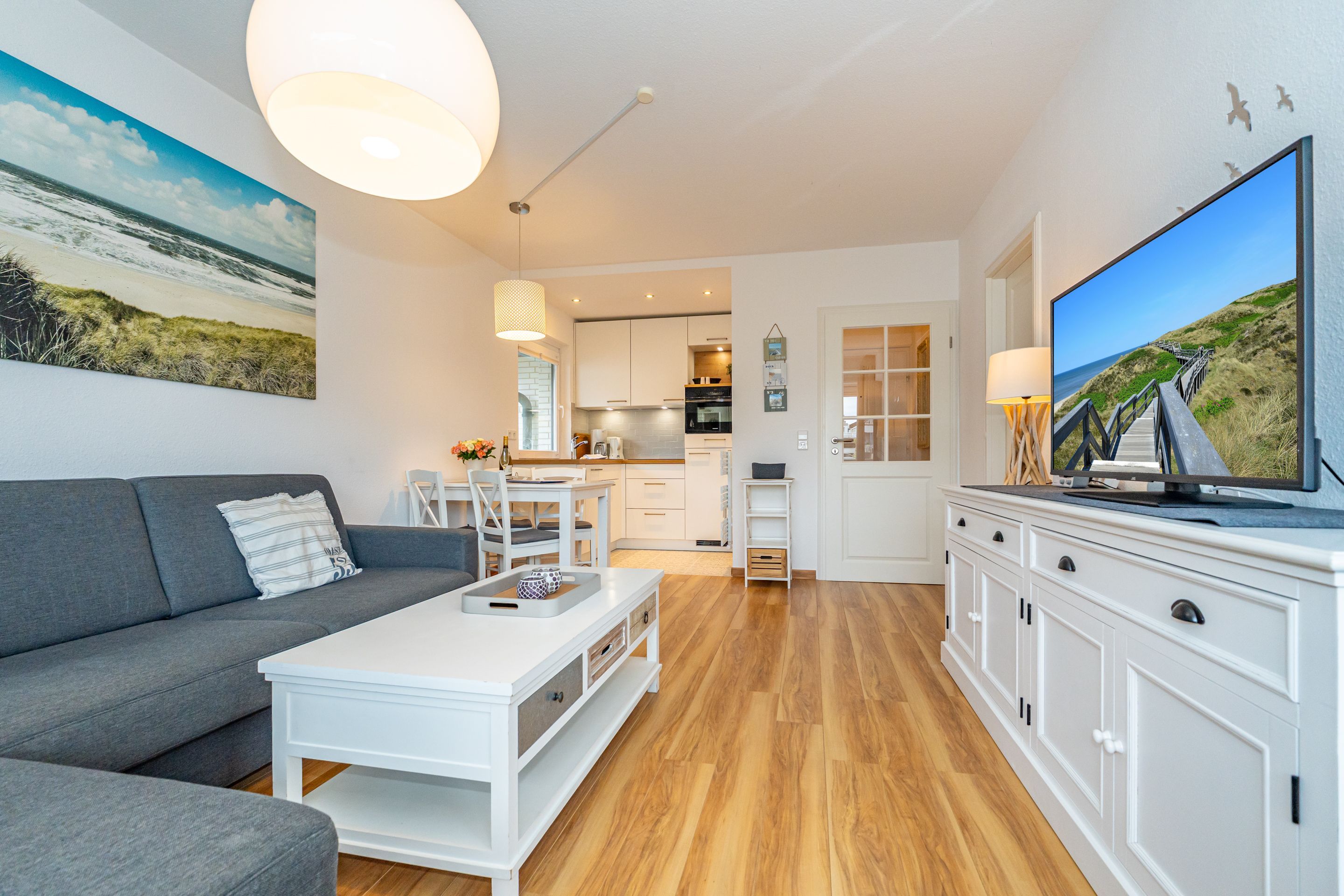 Der helle Wohnbereich verfügt über ein bequemes Ecksofa mit Schlaffunktion (Liegefläche ca. 1,50 x 2,00 m), einen Essplatz, Kabel-Smart-TV sowie ein Internetradio. WLAN steht Ihnen selbstverständlich kostenfrei zur Verfügung.