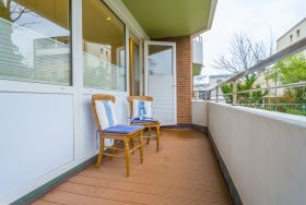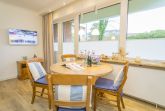 Komplett mit modernem Designerboden in Holzoptik ausgelegte 2-Zimmer-Nichtraucher-Ferienwohnung, ca. 50 qm, im Hochparterre für max. 4 Personen zur Ostseite mit Ostbalkon (Morgensonne mit Balkonmöbel und Auflagen).